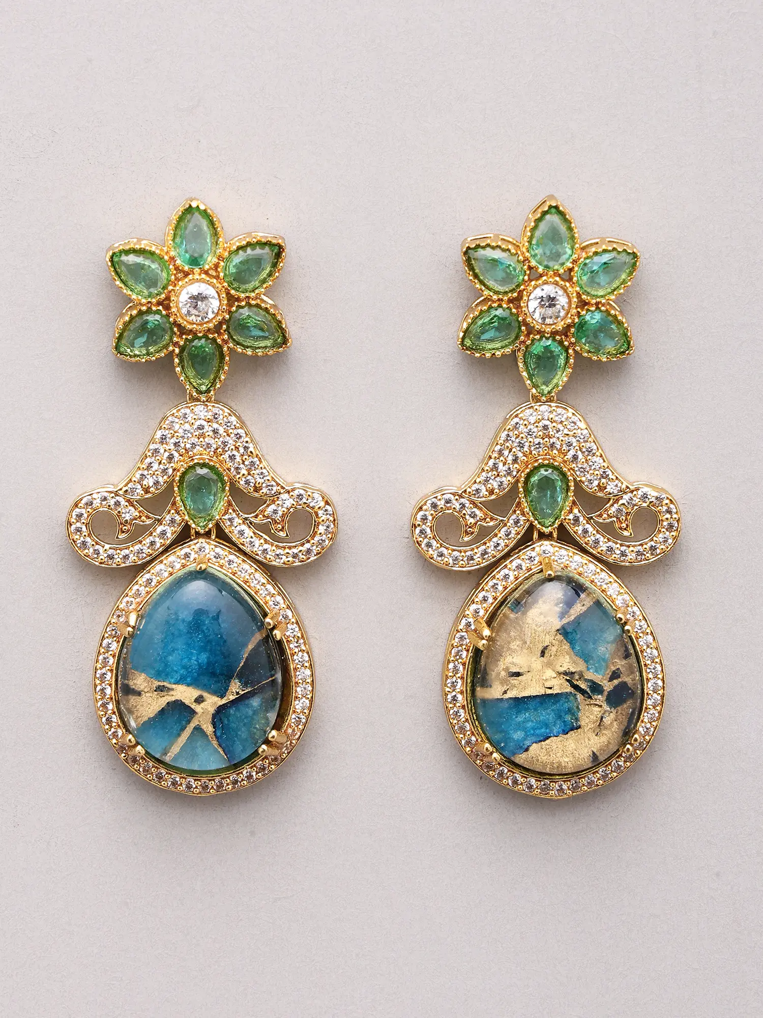 The accompanying earrings are designed to echo the necklace's opulent theme. Each earring features a striking floral stud, mirroring the design of the necklace's embellishments, with a vibrant green stone at its heart and subtle cubic zirconia accents. Suspended below is a teardrop-shaped stone, a perfect complement to the central pendant, showcasing a captivating marbling of blues and golds that draws the eye and adds a touch of celestial wonder. The entire ensemble is crafted from premium brass, lending a lustrous sheen and enduring quality to each piece.