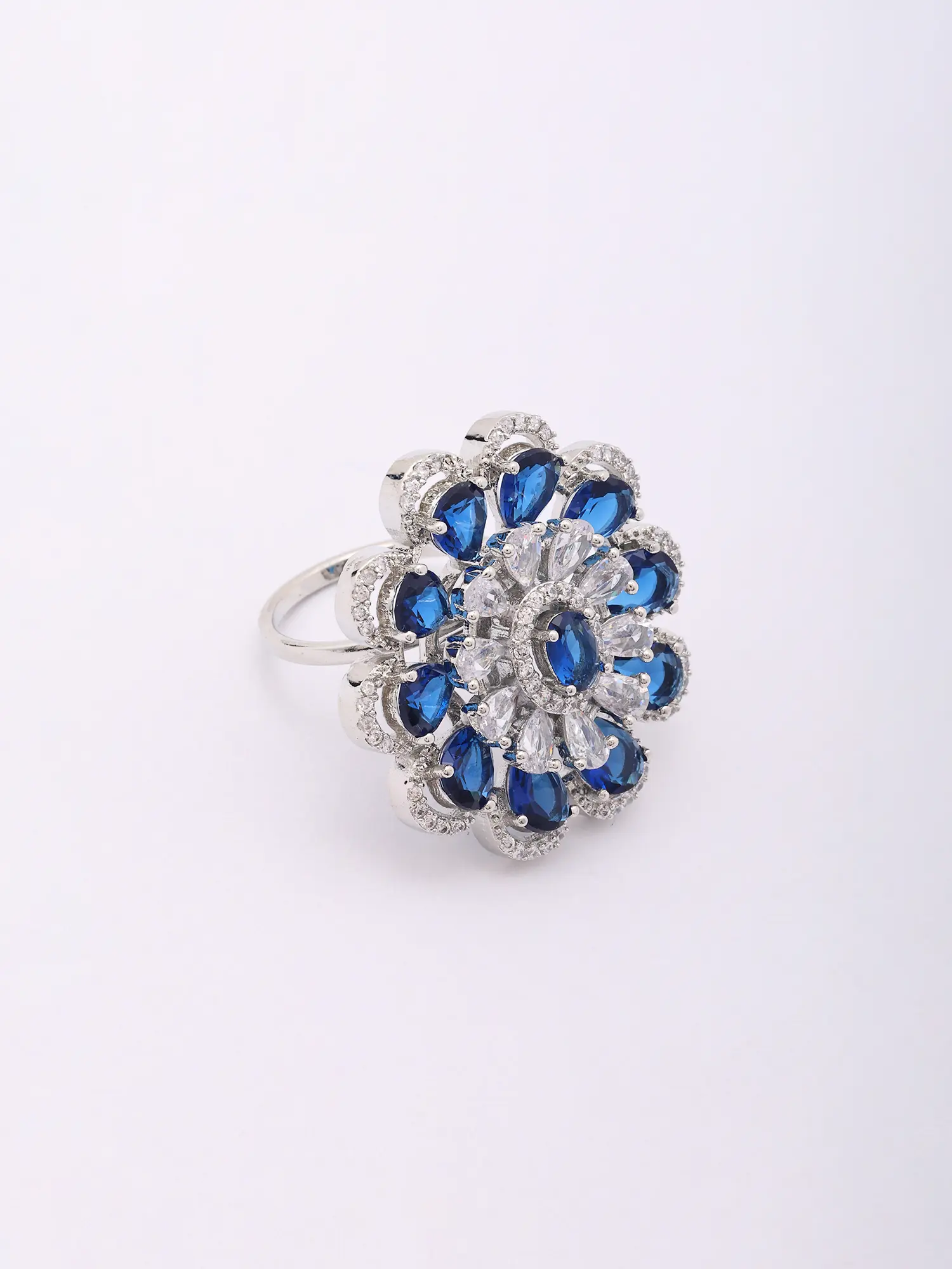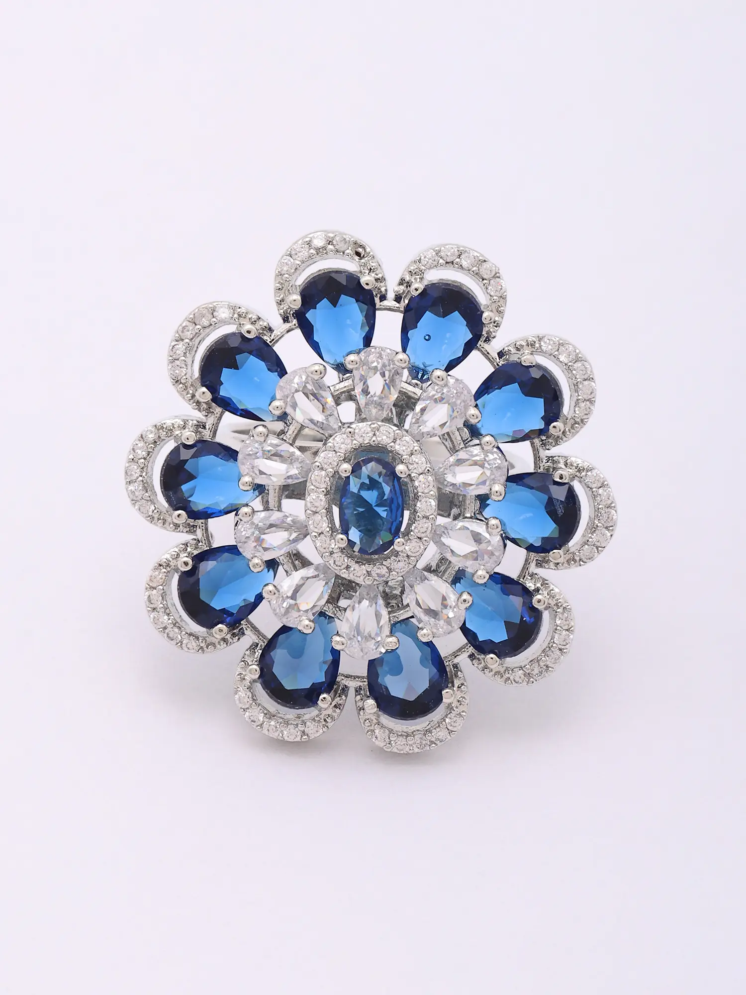 Encased within a graceful halo, the arrangement features brilliant, deep blue teardrop-shaped stones complemented by the sparkle of clear, pear-cut accents. These are encircled by a delicate band of smaller, shimmering stones, creating a dazzling floral motif. The overall impression is one of striking beauty, with its generous 1.2-inch height and 1.15-inch width, it makes a bold, yet elegant statement.
