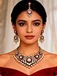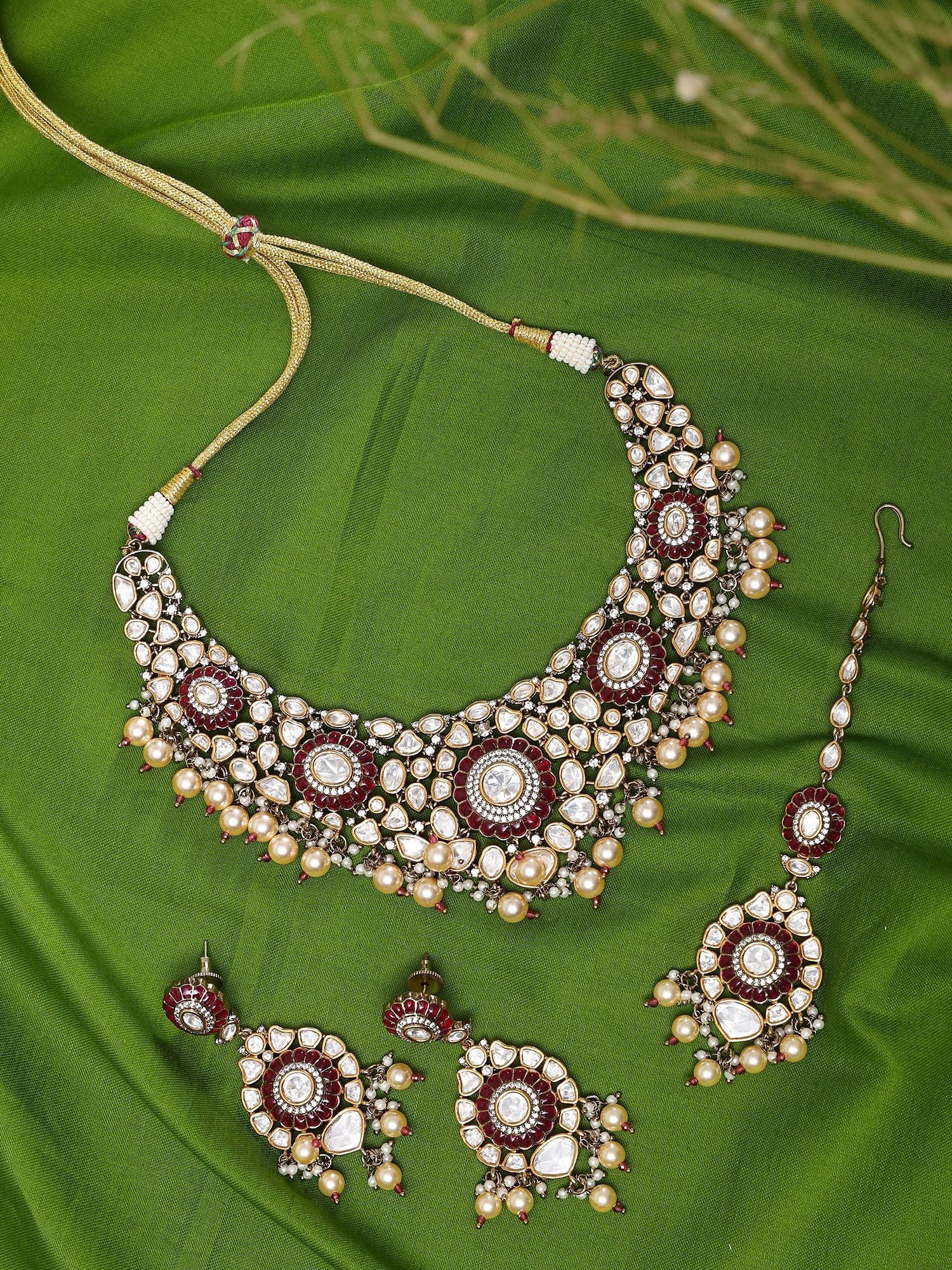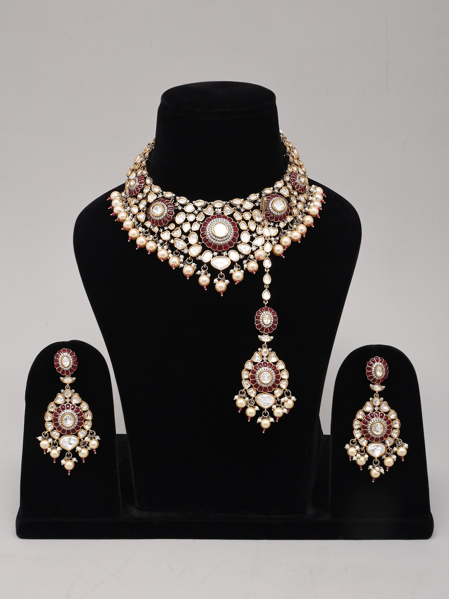 Complete set includes a statement necklace, coordinating maang tikka, and elegant pearl drop earrings.