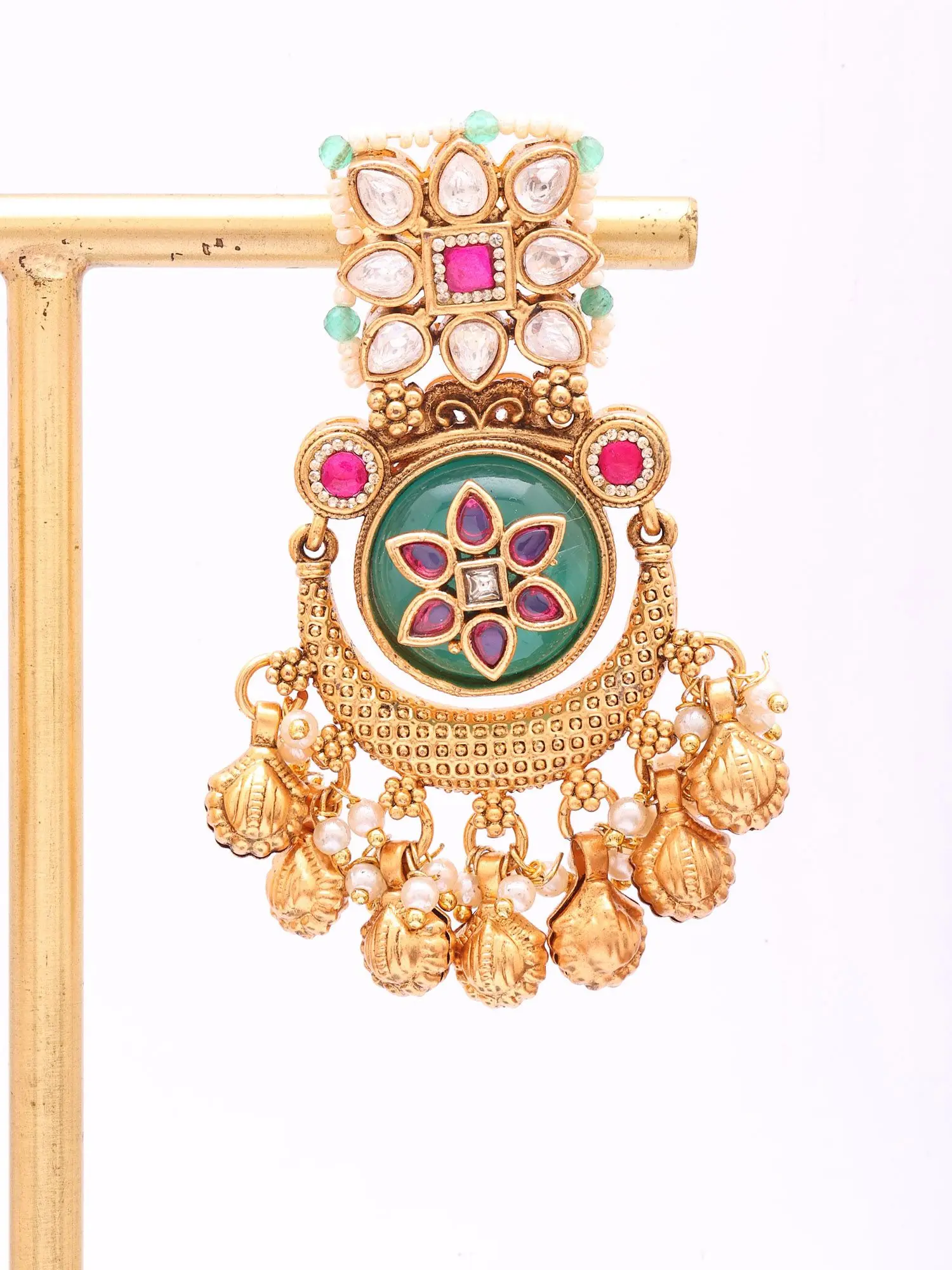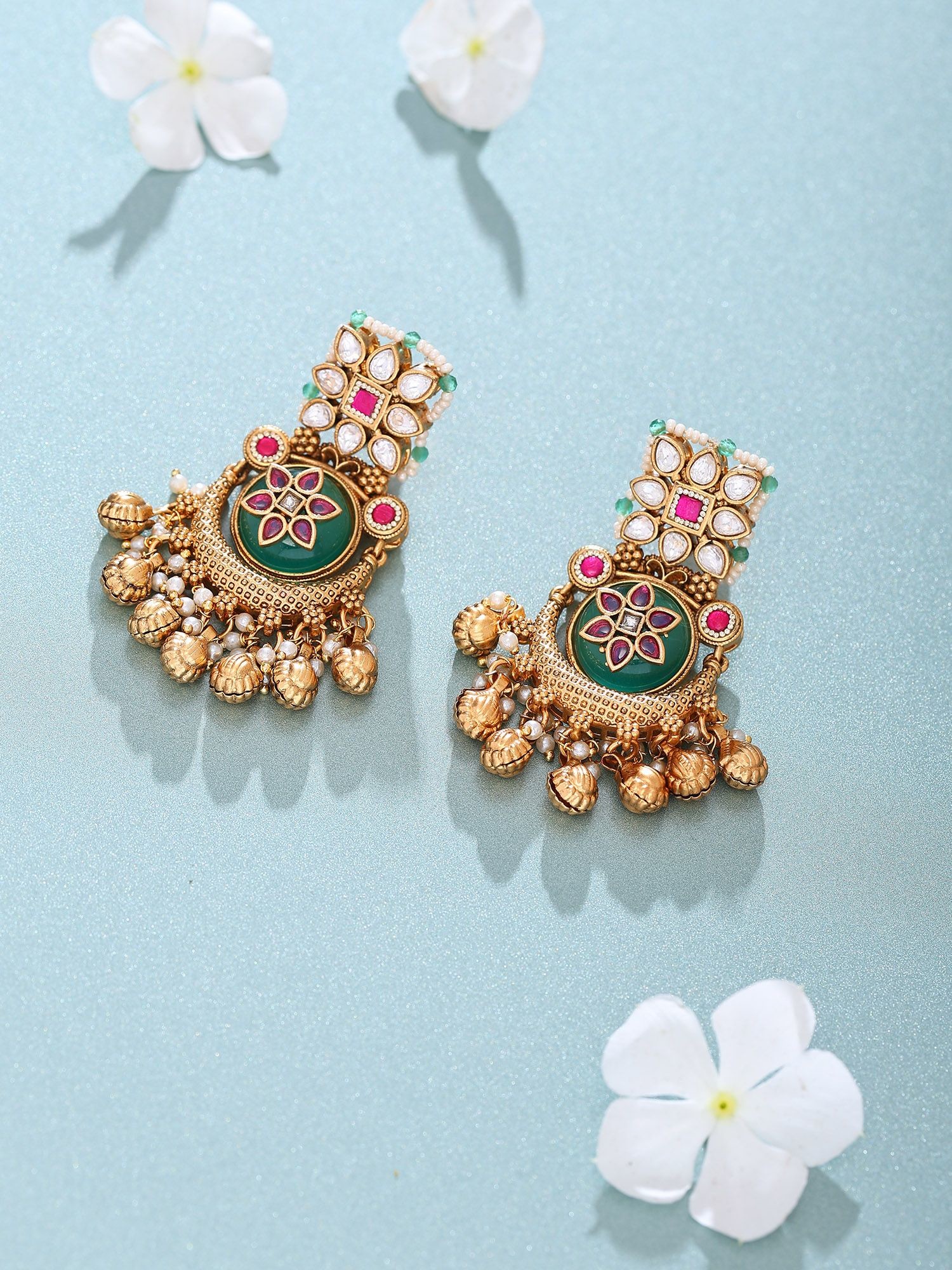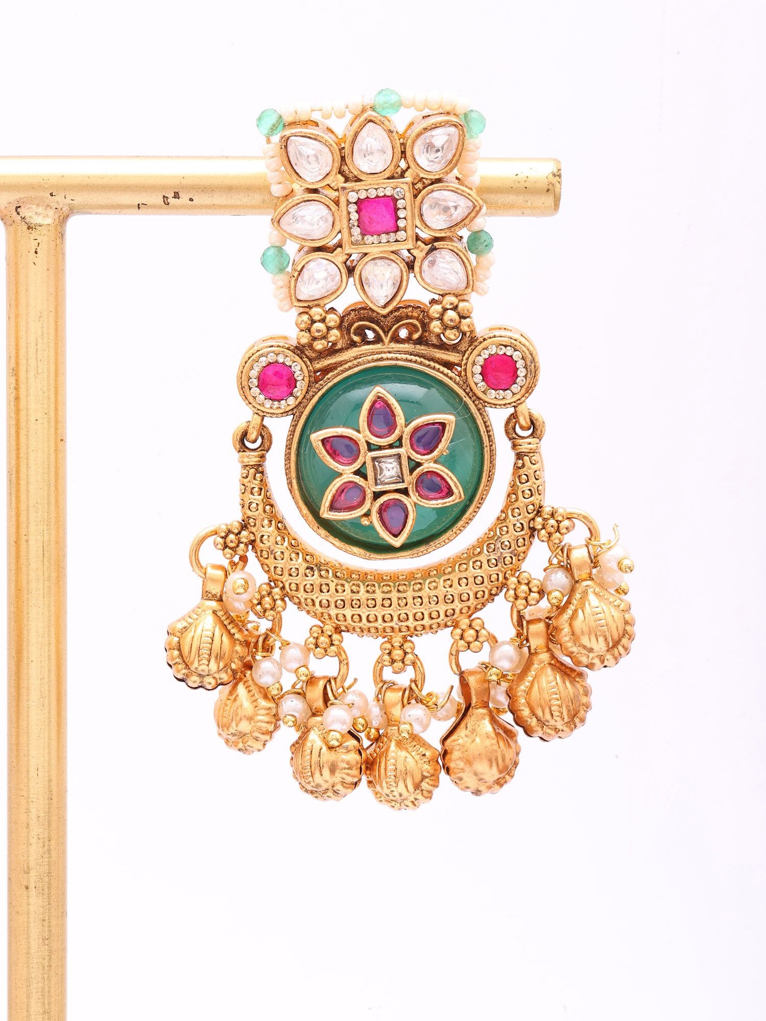 The design features a central, deep emerald-hued stone, encircled by a delicate floral pattern inlaid with white stones and accents of vivid fuchsia. Dangling gracefully below is a cluster of ghungroo, traditional Indian bells, which offer a subtle, melodic jingle with every movement. The overall aesthetic is a harmonious blend of traditional motifs and contemporary sensibilities, resulting in an accessory that is both striking and refined. Each earring measures approximately 2.2 inches in length and 1 inch in width, providing a noticeable yet elegant presence.