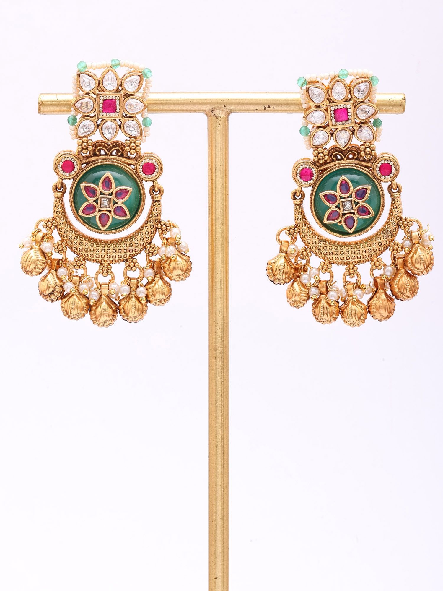 Each pair is meticulously handcrafted from lustrous brass, a material chosen for its enduring appeal and warm glow. The intricate floral motifs are painstakingly brought to life through the time-honored Kundan technique, where precious stones are set into the metal without visible prongs. This artisanal approach ensures that every detail, from the precise placement of the vibrant green central stone to the delicate beadwork, reflects a dedication to unparalleled quality. You'll appreciate the weight and feel of these earrings, a testament to their substantial construction.
