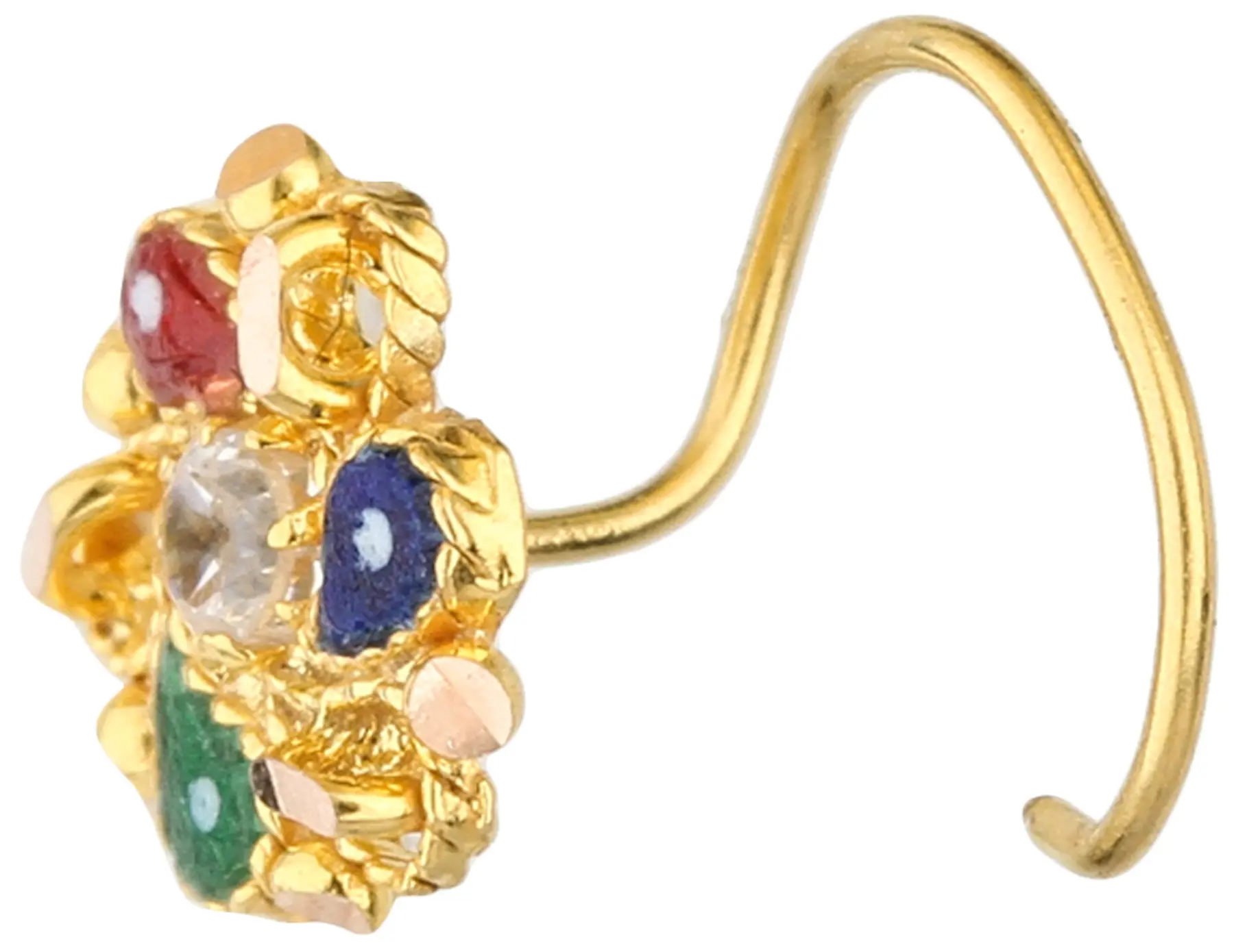 You'll be drawn to the intricate floral motif, artfully rendered with rich, jewel-toned enamel in shades of deep blue, vibrant red, and lush green. Each petal-shaped segment is meticulously outlined in gleaming gold, creating a captivating contrast. At its heart, a brilliant stone sparkles, reflecting light with every movement and adding an undeniable allure. The slender curve of the gold shank, designed for comfortable wear, measures a delicate 4 mm in length, with a fine gauge of .56 mm, ensuring a discreet and elegant presence.