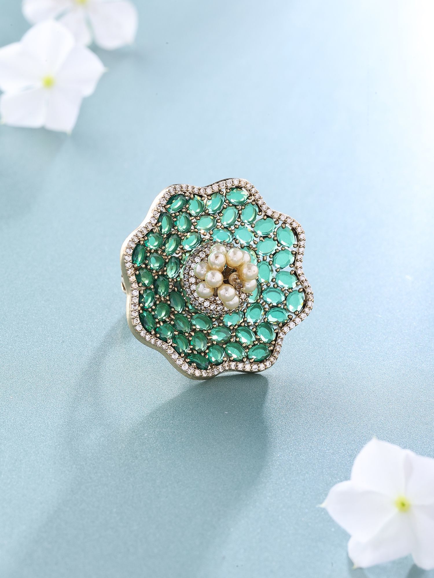 Flower Design American-Diamond Stone Studded Adjustable Ring with Pearl
