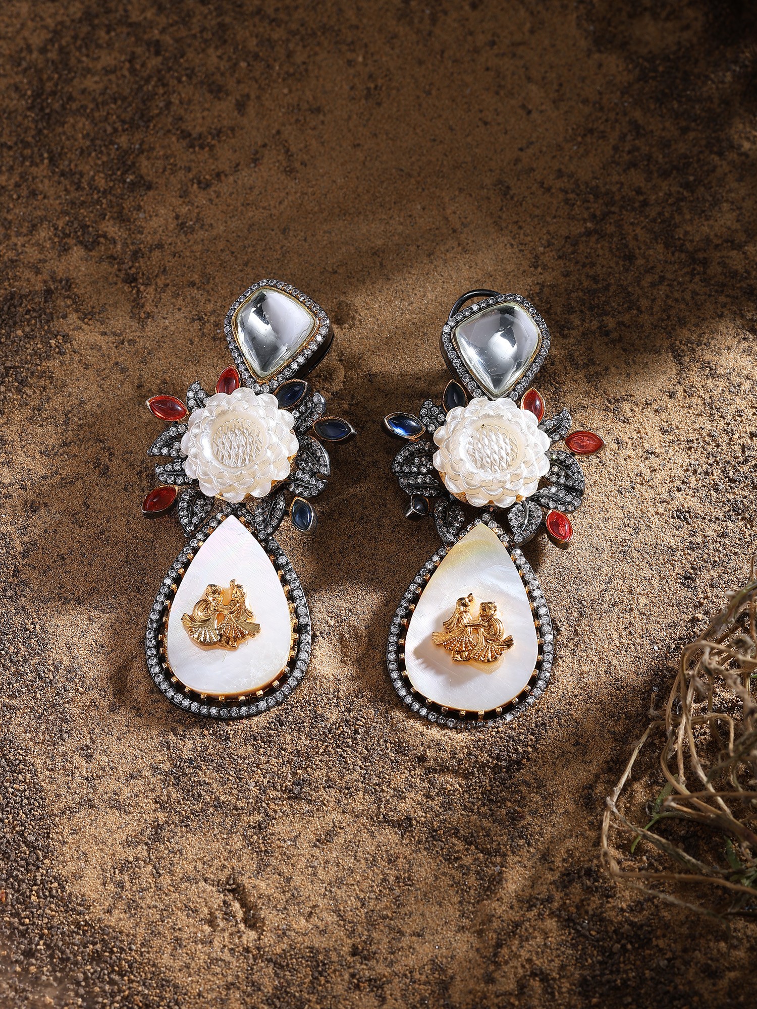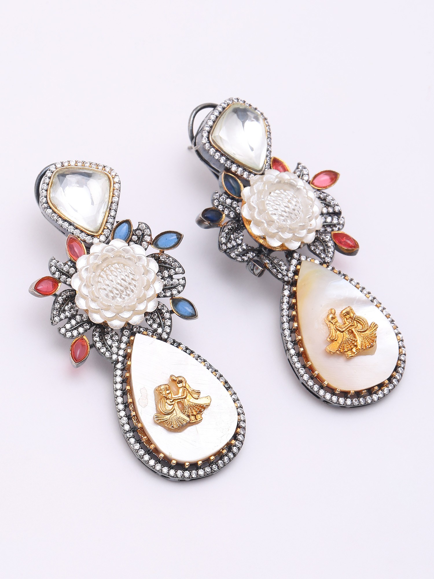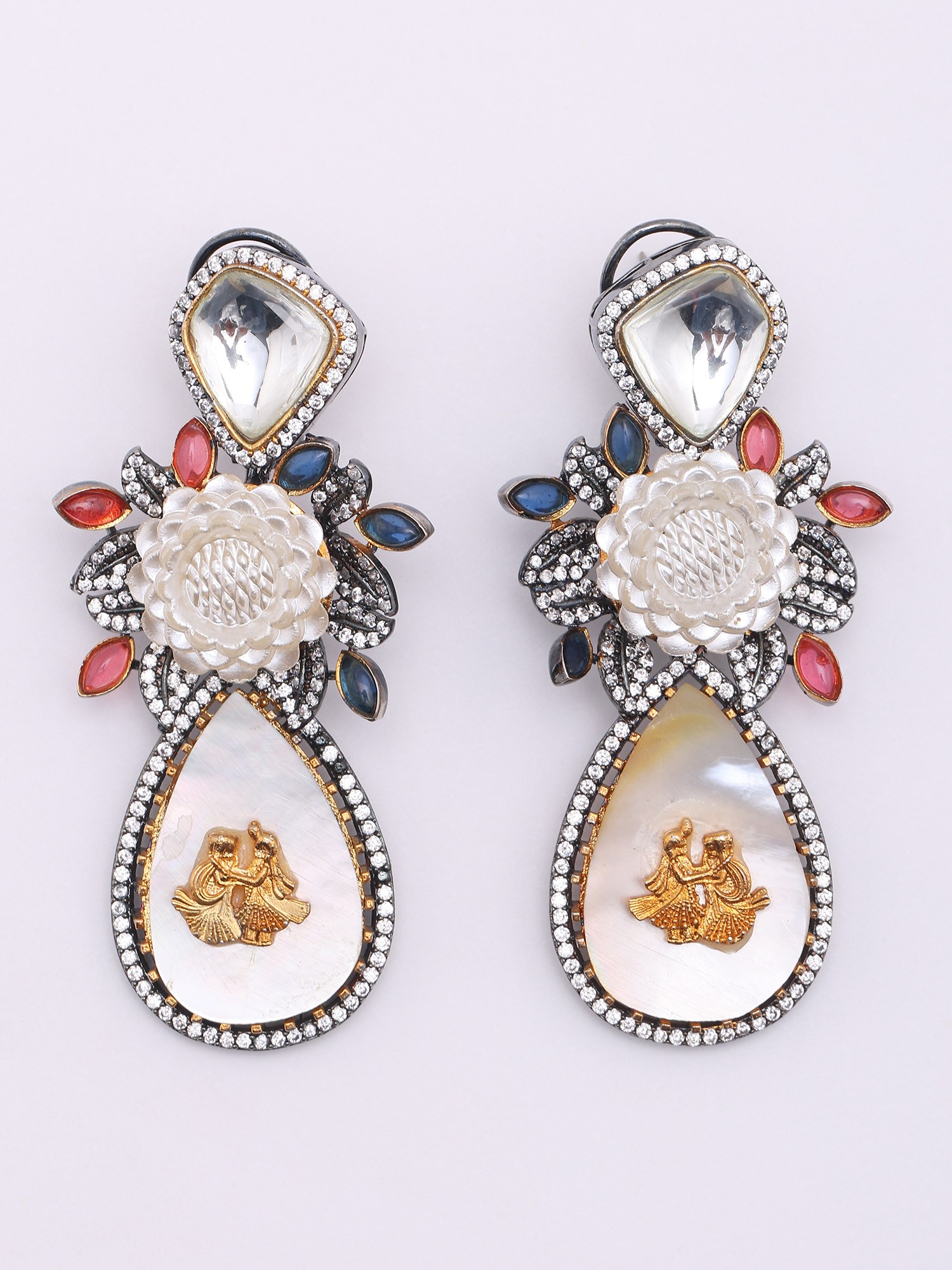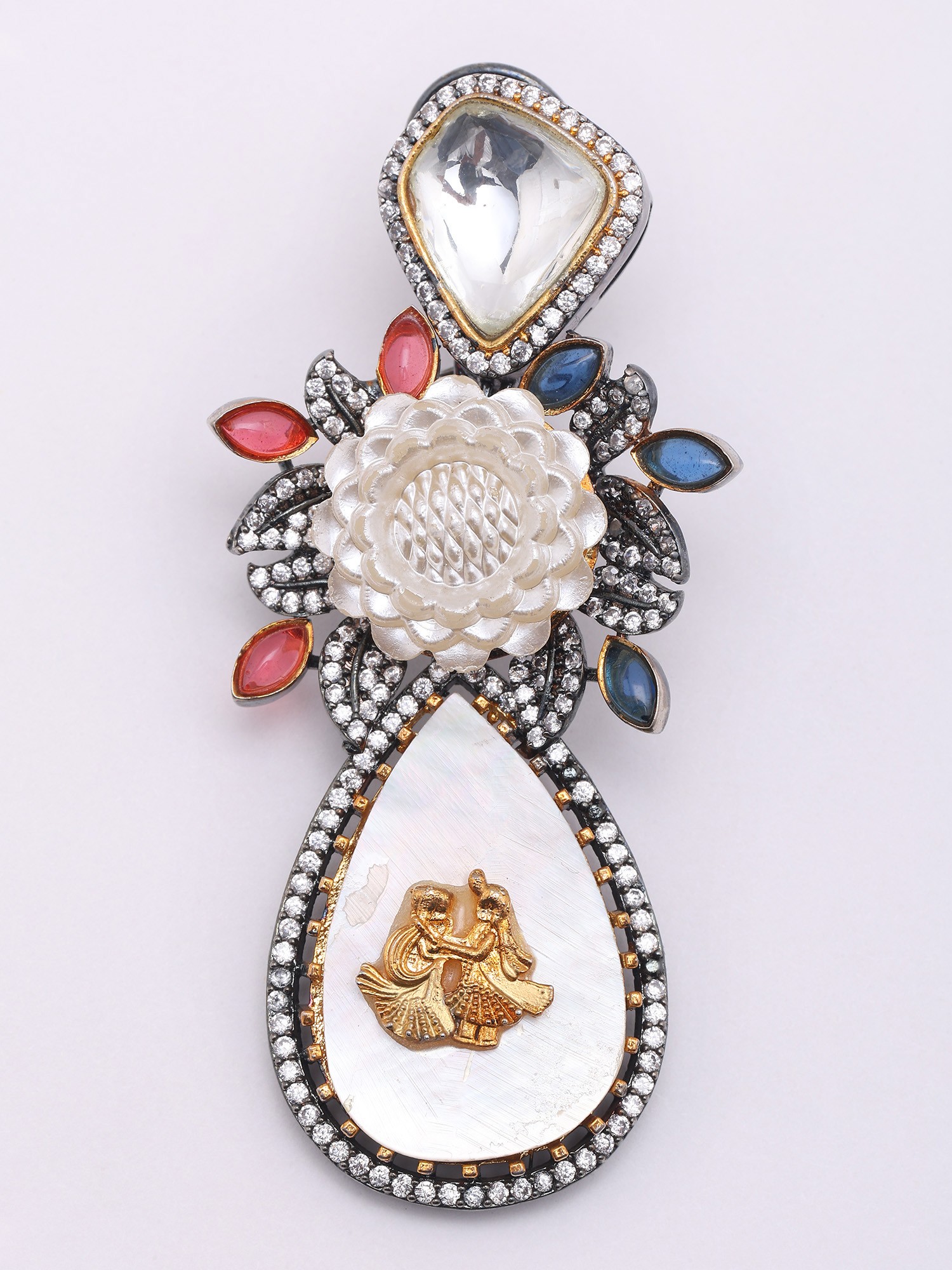 Multi Stone Studded Floral Design Necklace and Earrings Set with Five Strand