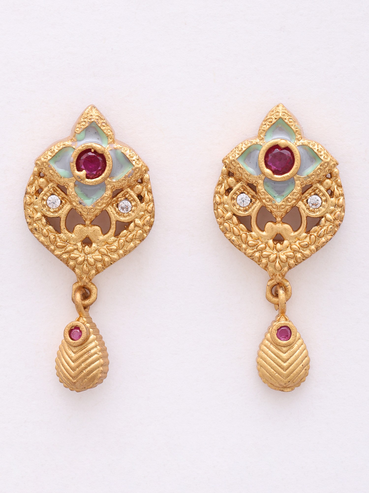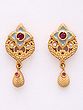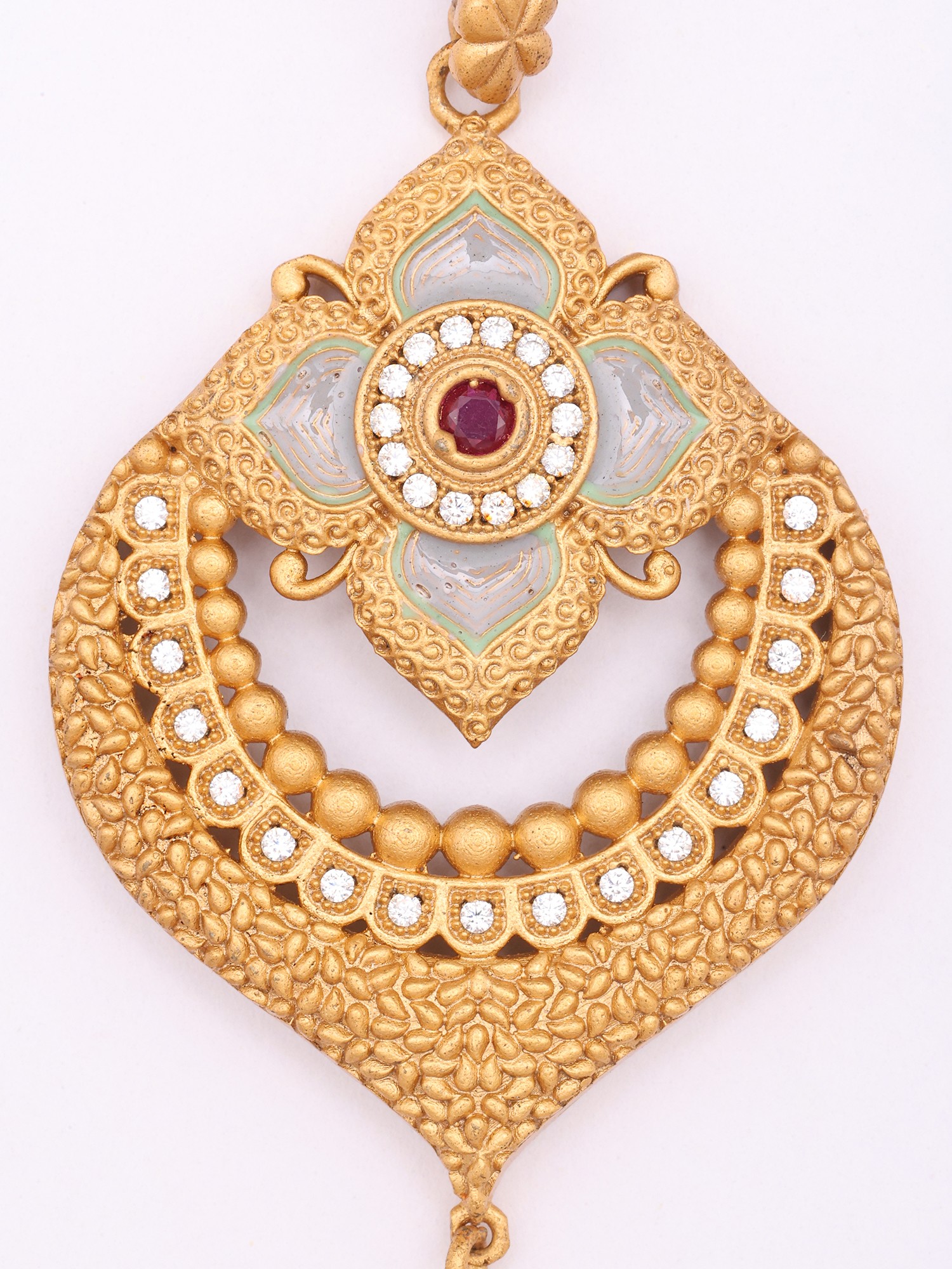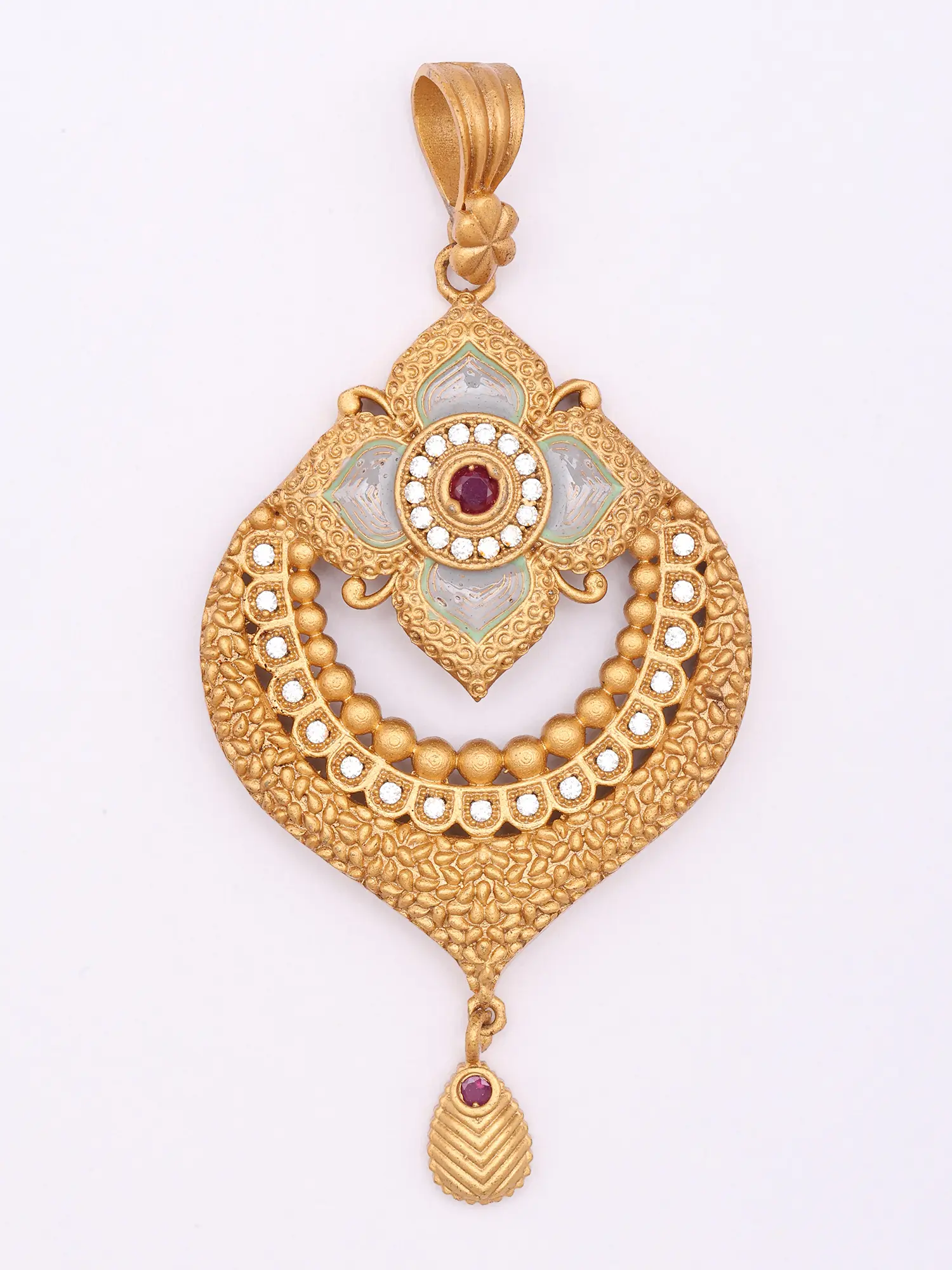 The pendant, with its substantial 7.85-inch height, commands attention with its layered design and delicate beadwork. Adorned with shimmering Kundan stones and vibrant ruby accents, it captures light beautifully, while the accompanying earrings, measuring 1.10 inches in height and 0.45 inches in width, echo the pendant's motif with elegant symmetry. The matte gold finish provides a sophisticated counterpoint to the brilliance of the stones, lending a rich, heirloom quality.