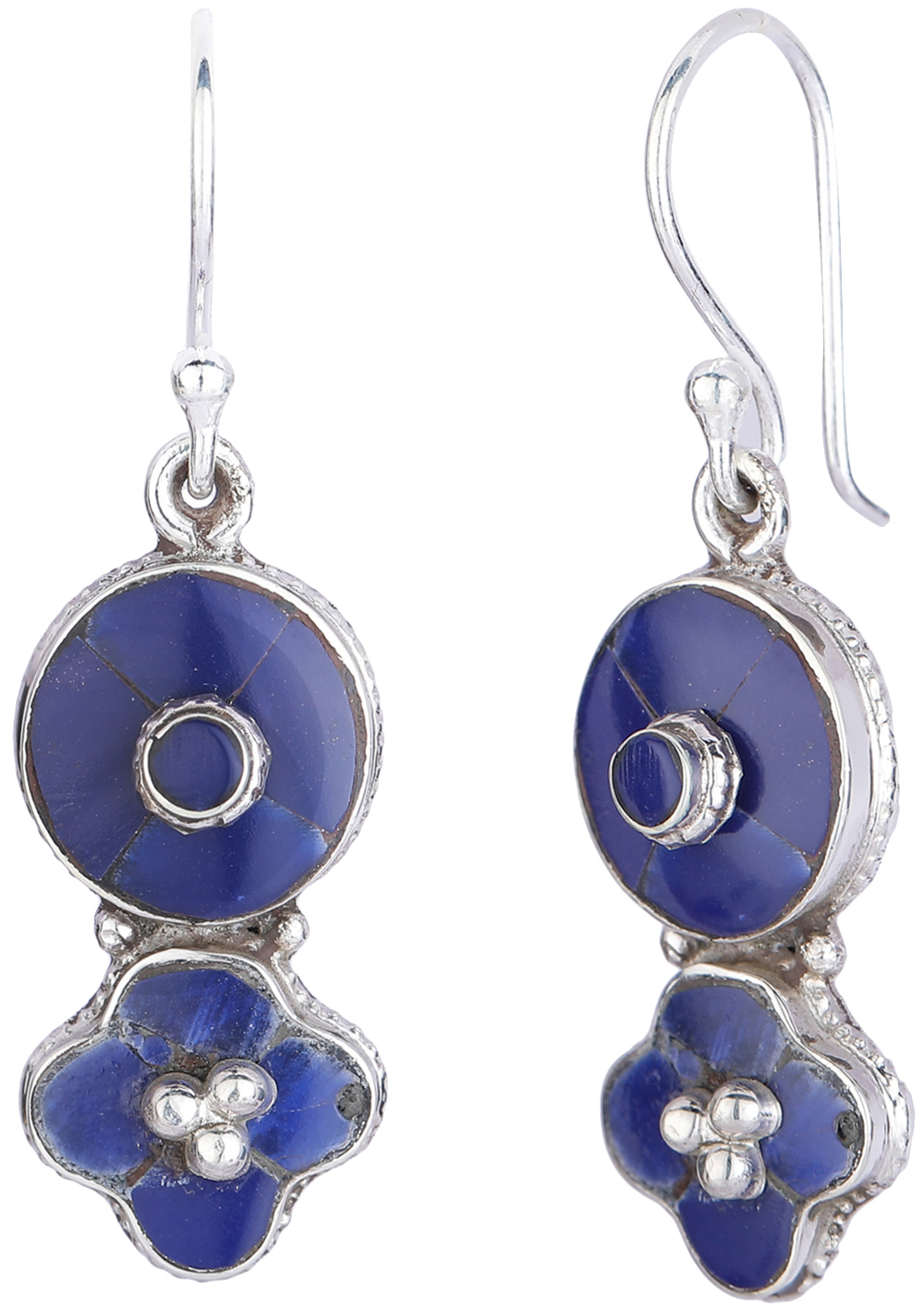 Flower Shaped Dangling Lapis Lazuli Studded Sterling Silver Earrings