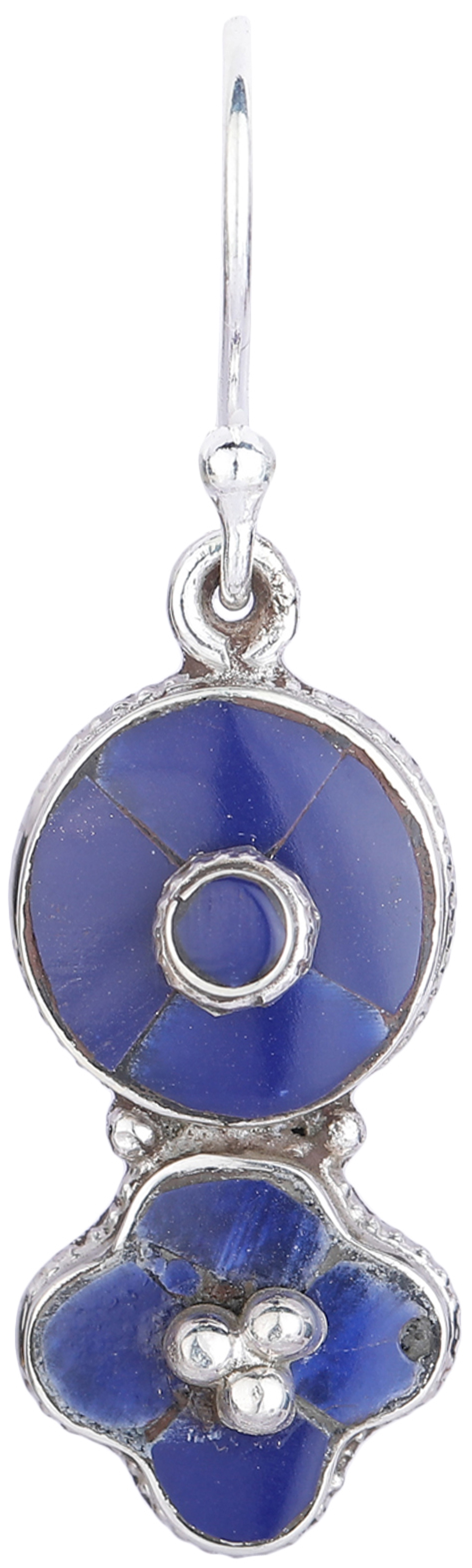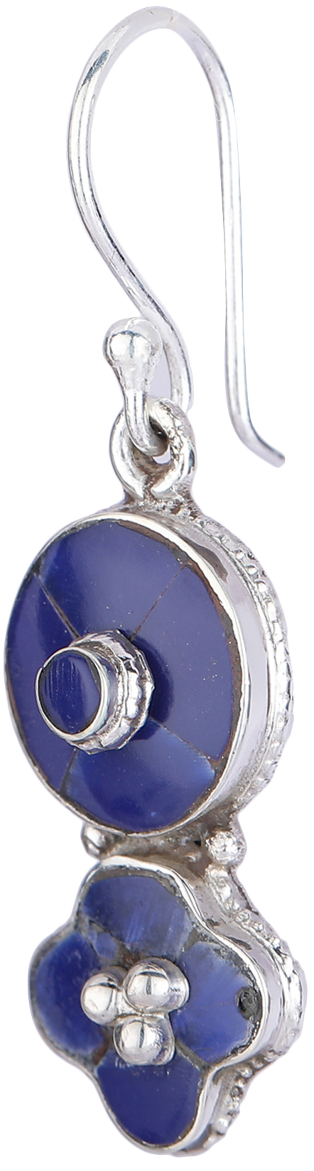 Adorn yourself with the captivating allure of these exquisite dangling earrings, a true testament to artisanal craftsmanship. Fashioned from lustrous sterling silver, each earring showcases a unique design that balances traditional elegance with a touch of bohemian charm. The primary element is a circular disc, intricately inlaid with segments of genuine lapis lazuli. The deep, mesmerizing blue of the lapis, often flecked with golden pyrite inclusions, evokes the boundless expanse of a clear night sky. This celestial stone is precisely cut and set within a delicate sterling silver bezel, creating a stunning focal point.