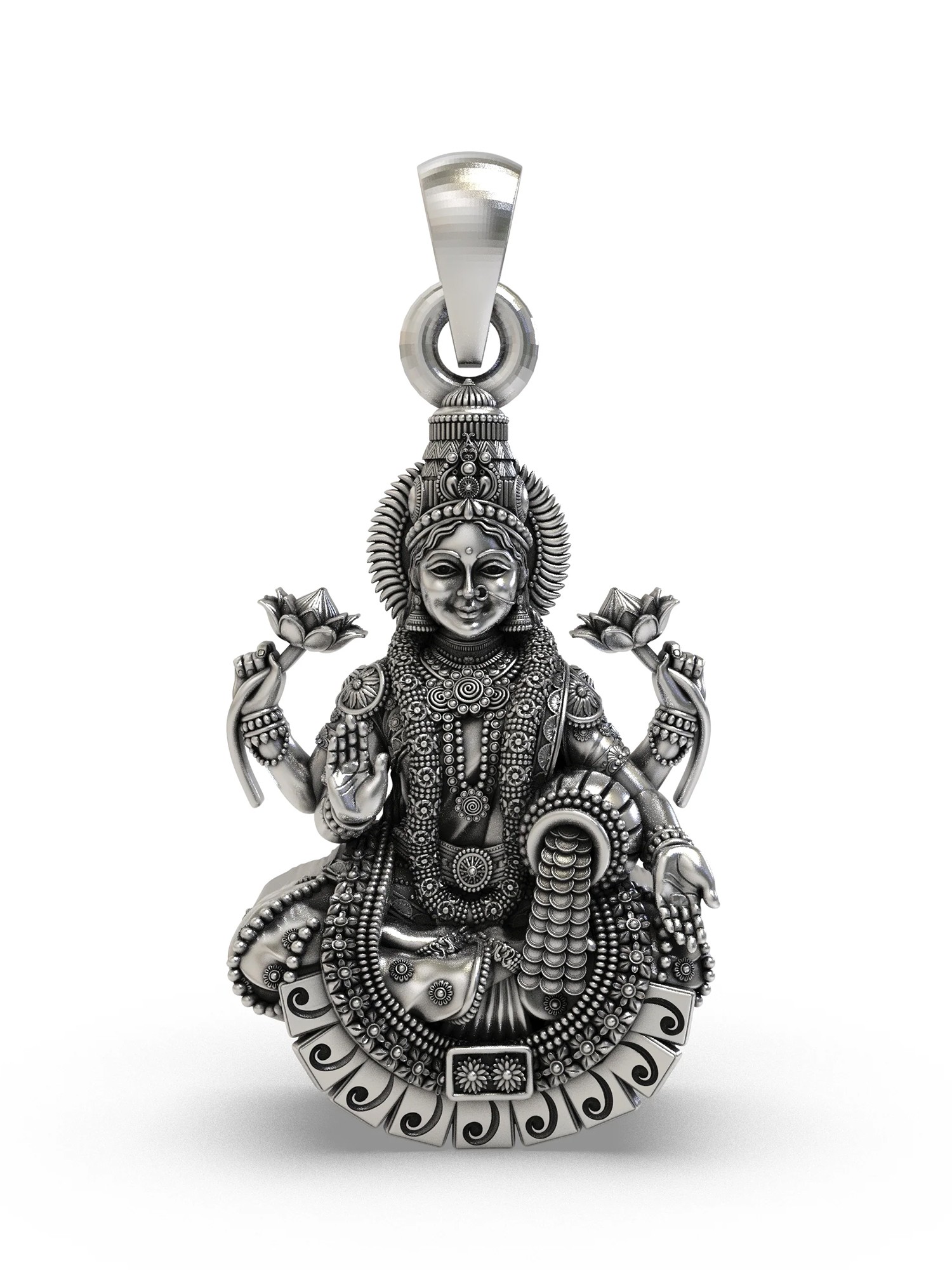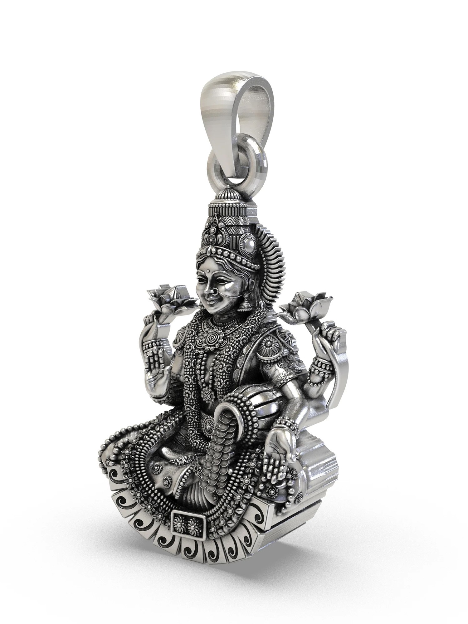 This exquisite pendant captures the benevolent presence of the Four-Armed Goddess Lakshmi, the deity revered for bestowing wealth, fortune, and auspiciousness. Crafted with exceptional detail in lustrous sterling silver, this piece is more than just an accessory; it's a symbol of divine blessings and a timeless work of art. The intricate design showcases Lakshmi in her seated posture, radiating serenity and grace. Each element, from the delicate lotus flowers she holds in her upper hands to the adornments adorning her form, has been meticulously rendered to reflect the rich symbolism associated with the goddess.