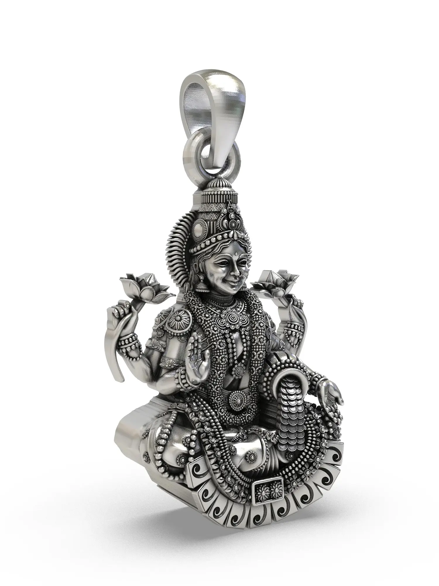 This sterling silver pendant is designed to be a cherished addition to any jewelry collection. Its elegant design makes it suitable for daily wear, allowing you to carry the blessings of Goddess Lakshmi with you wherever you go. It can also serve as a meaningful gift for loved ones, especially during auspicious occasions like Diwali, weddings, or birthdays, conveying wishes for prosperity, happiness, and well-being. The cool gleam of sterling silver complements a wide range of outfits, adding a touch of spiritual elegance and cultural richness to your personal style. Wear it on a chain of your choice to create a look that is both personal and profoundly symbolic.