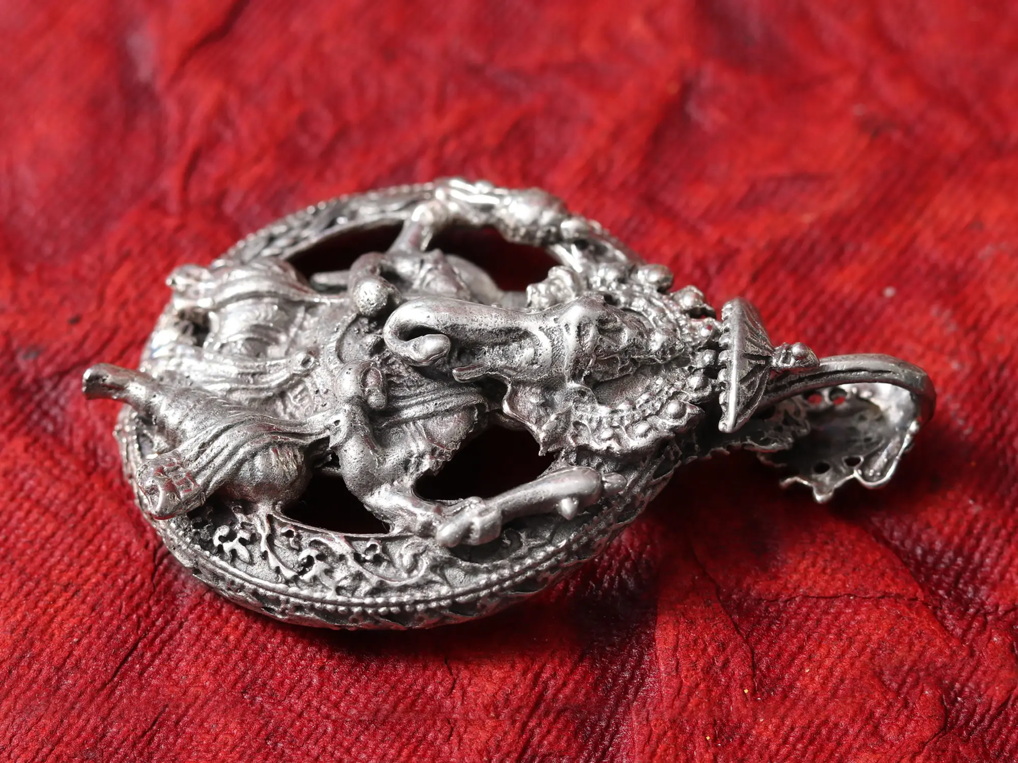 The design unfolds with a commanding presence, rendered in solid sterling silver. Standing at a notable 2.5 inches in height and 1.7 inches in width, its substantial form allows for an immersive appreciation of its every sculpted curve and contour. You'll appreciate the delicate yet potent representation, capturing multiple divine arms poised in gestures of benevolence and strength, each element contributing to a powerful narrative of grace.