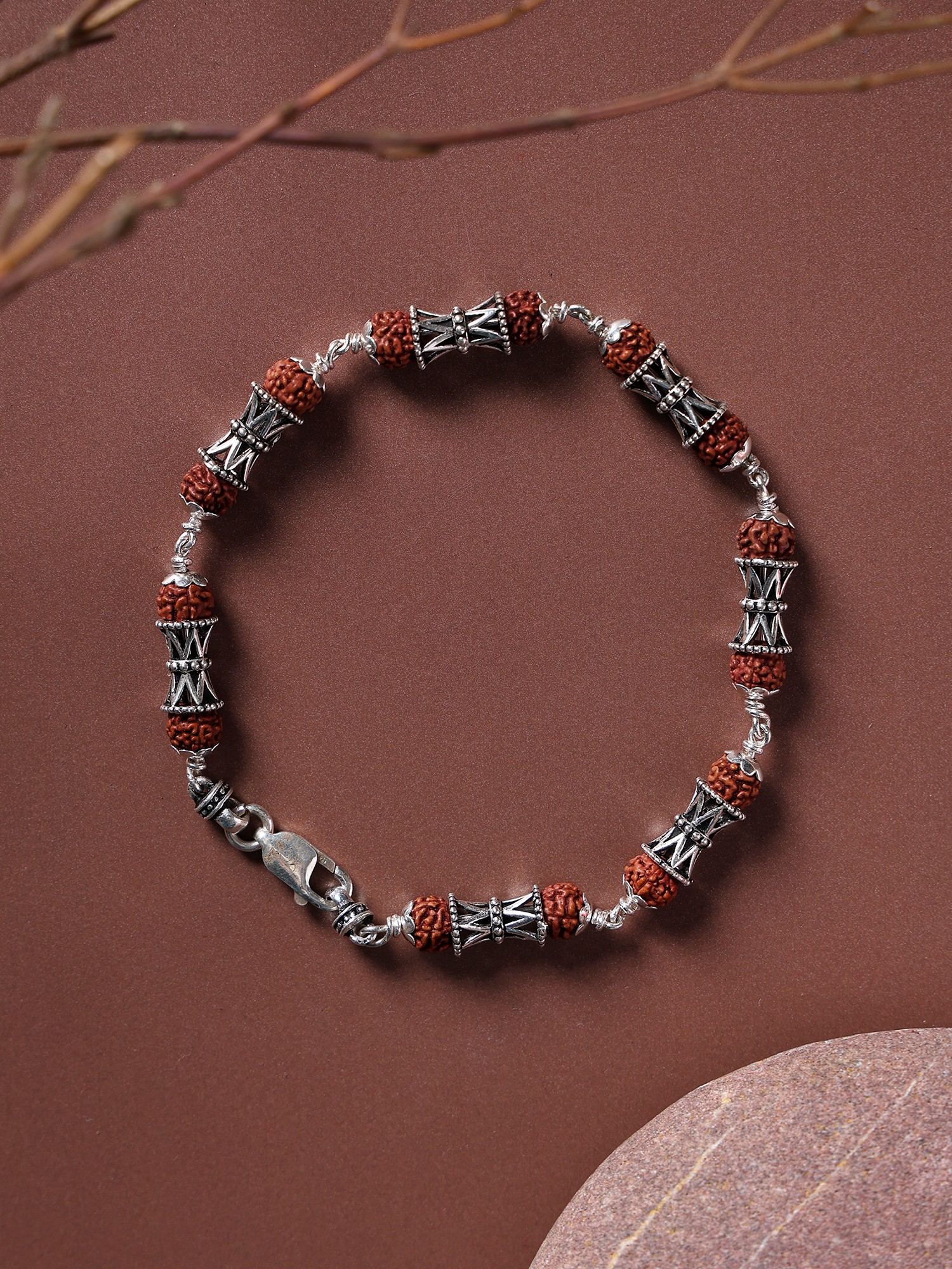 Genuine Certified Rudraksha and Sterling Silver Damru Bead Bracelet