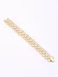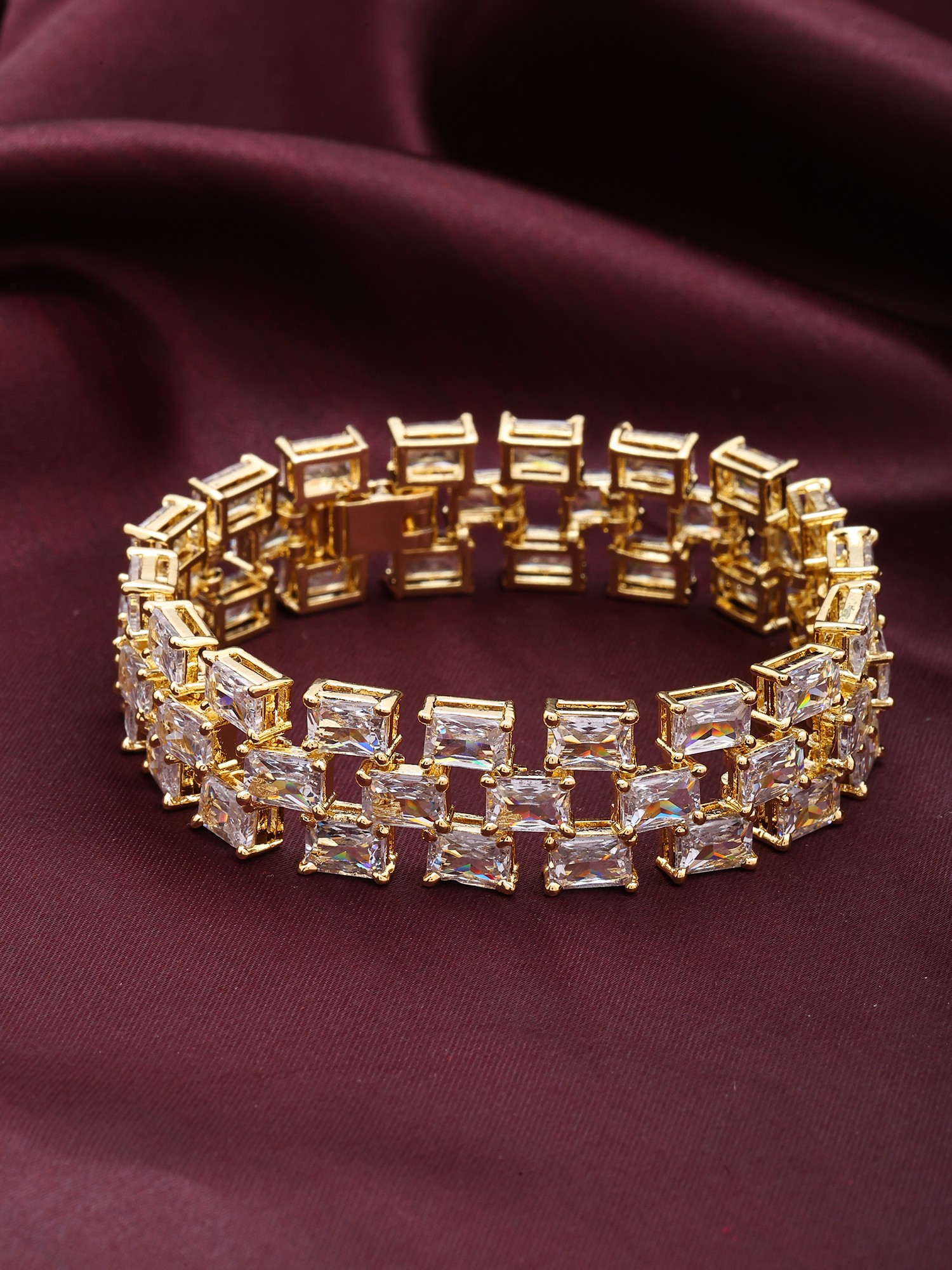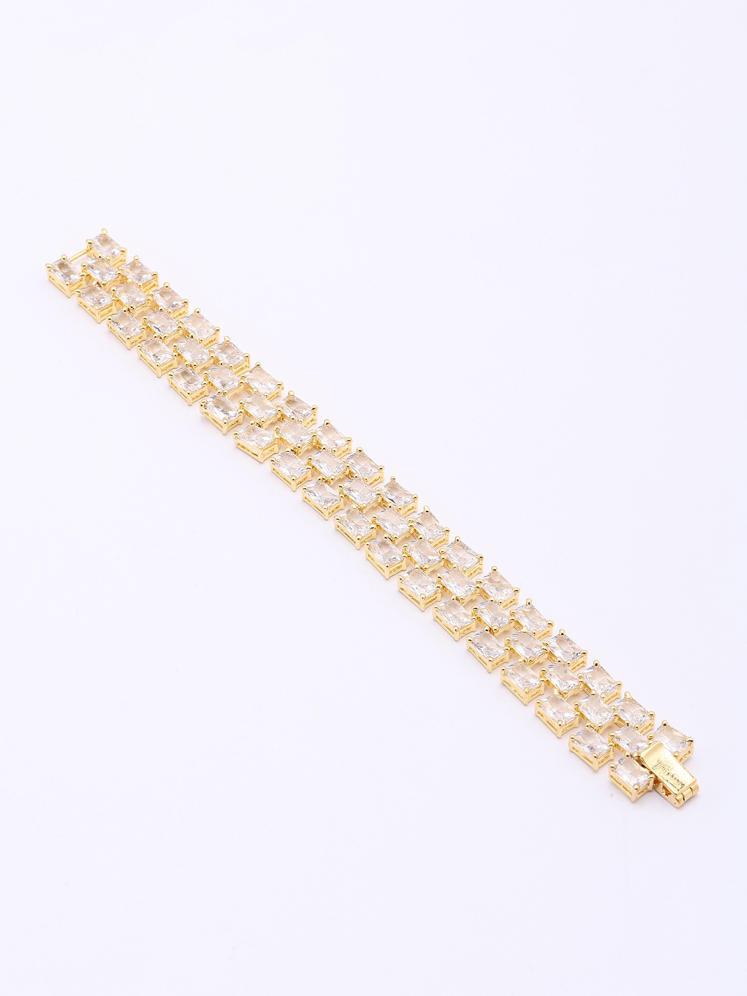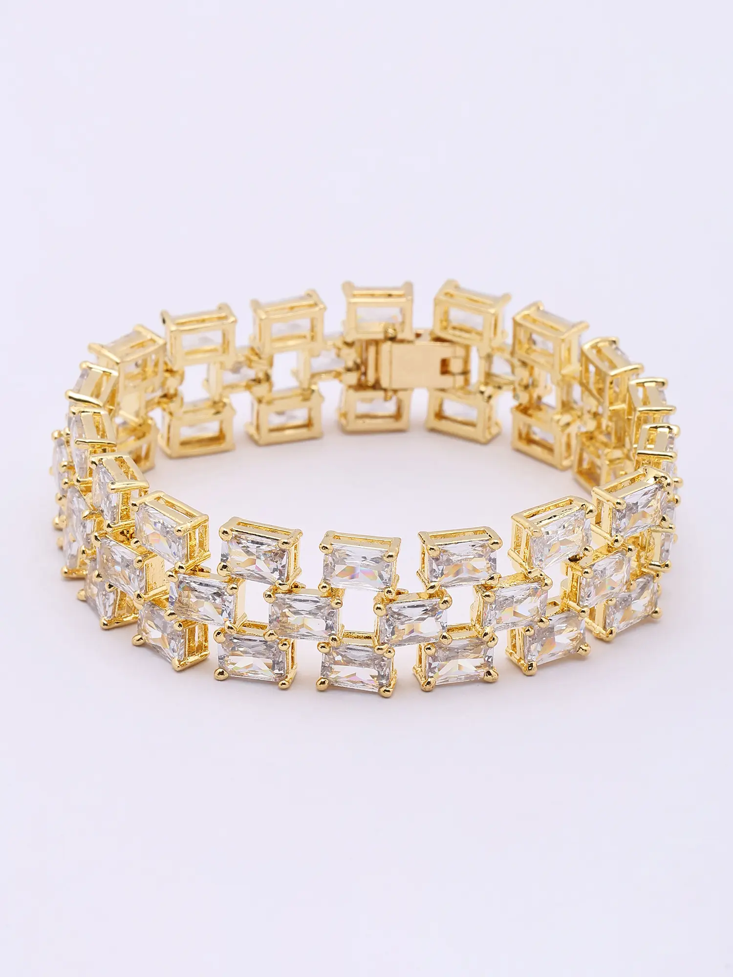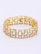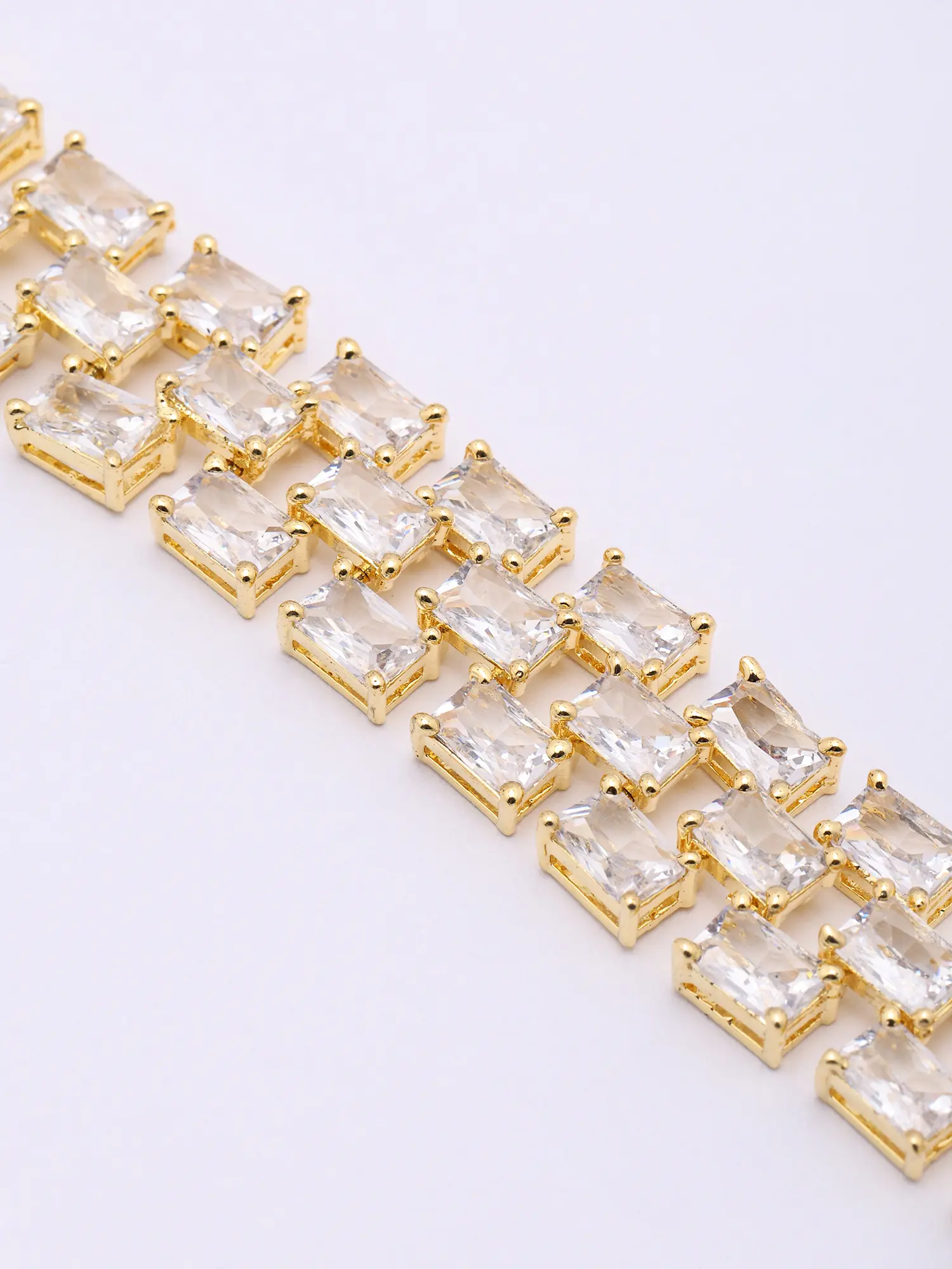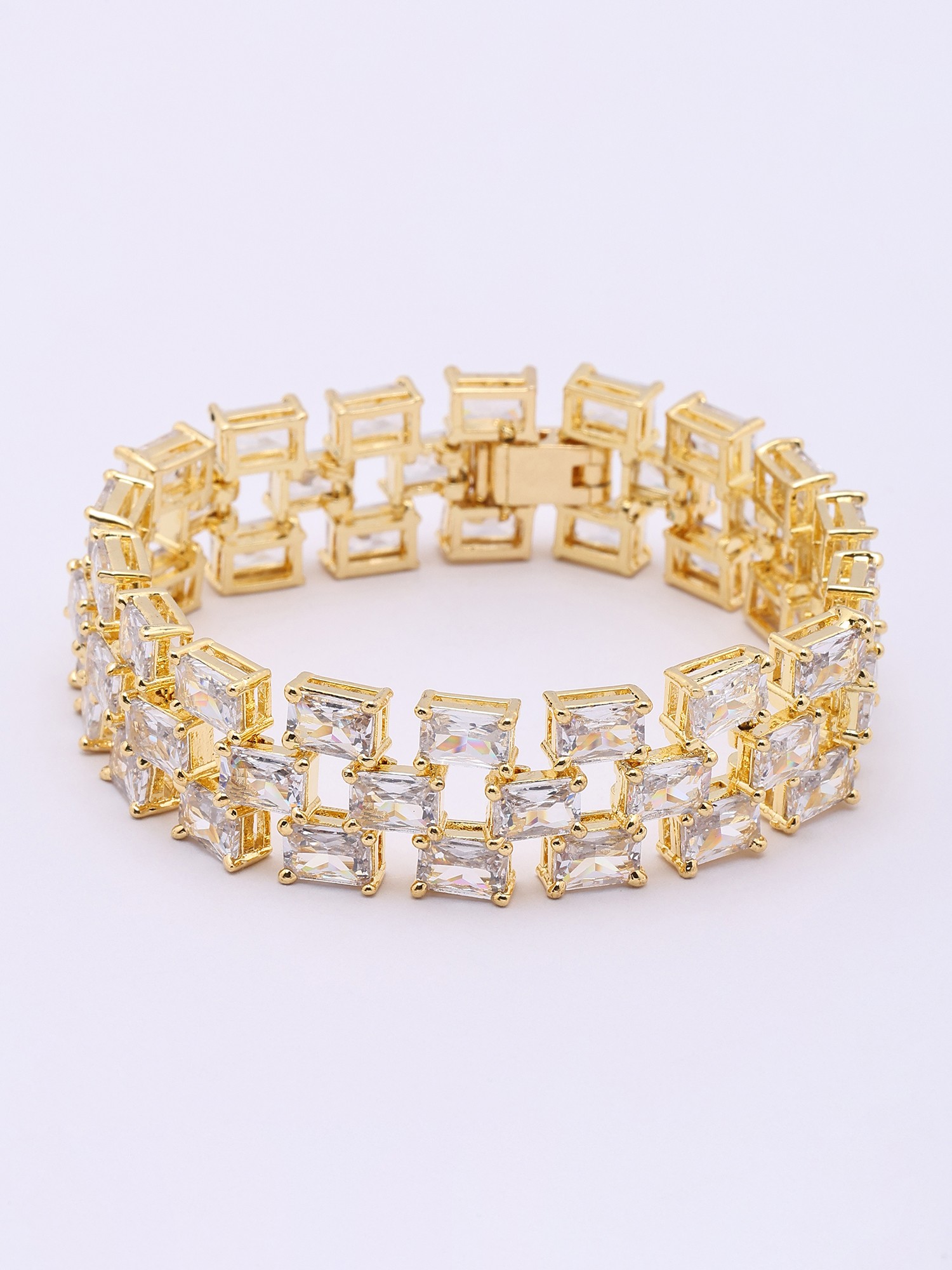 The design features a captivating geometric pattern, a testament to modern elegance. Rectangular-cut stones are precisely set within a lustrous gold-tone framework, creating a visual rhythm that is both striking and refined. The generous width of approximately 0.5 inches ensures a substantial presence, while the 6.5-inch length drapes gracefully around your wrist, secured with a dependable clasp.