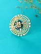The design unfolds in a mesmerizing geometric pattern, reminiscent of ancient mandalas. Brilliant American diamonds are meticulously embedded, radiating light with every facet. At its heart, deep sapphire-toned stones provide a dramatic focal point, their rich hue contrasting beautifully with the surrounding sparkle. The overall impression is one of sophisticated symmetry and captivating brilliance, with a width of 1.6 inches and a height of 1.3 inches making a noticeable yet elegant statement.