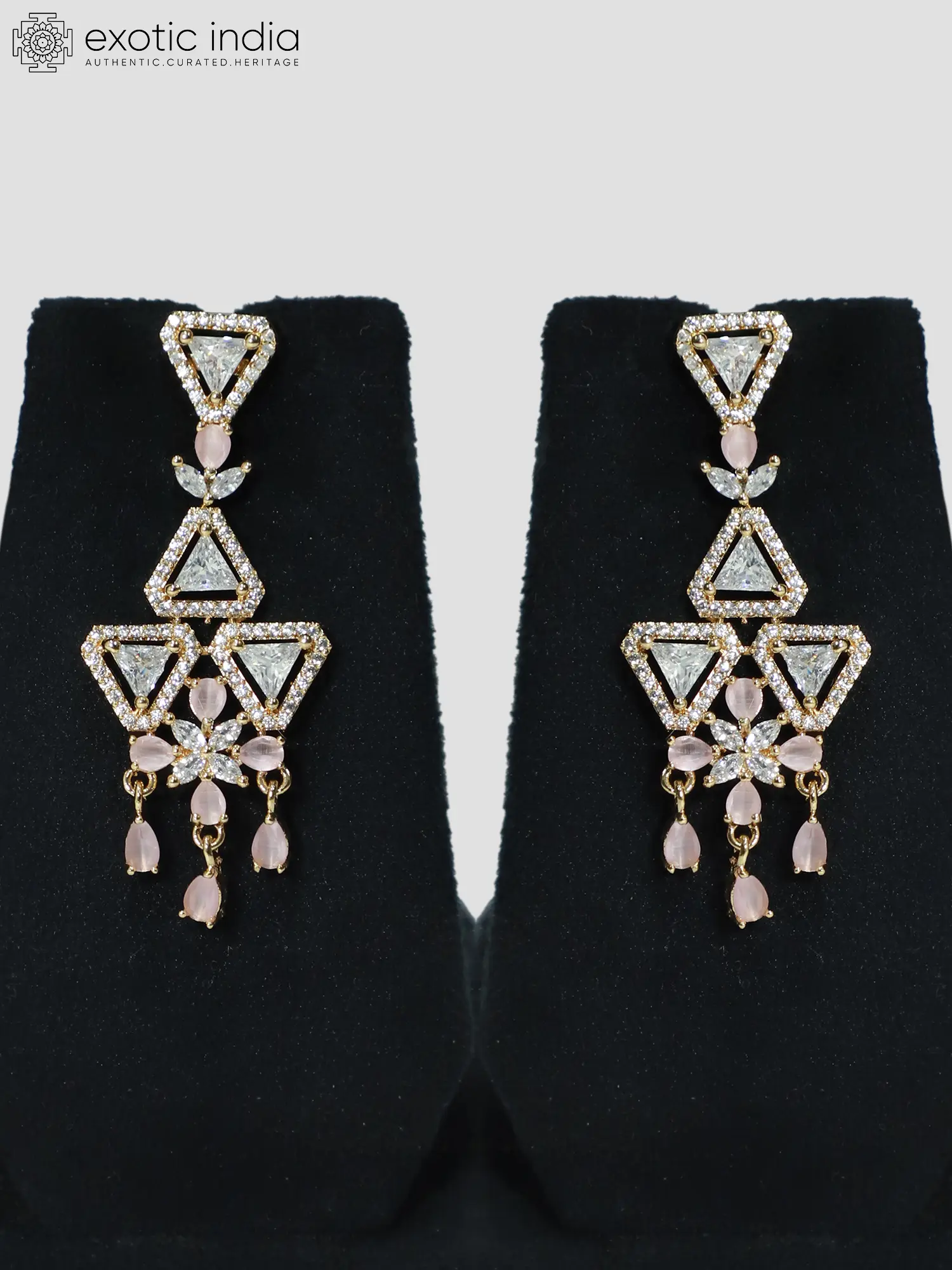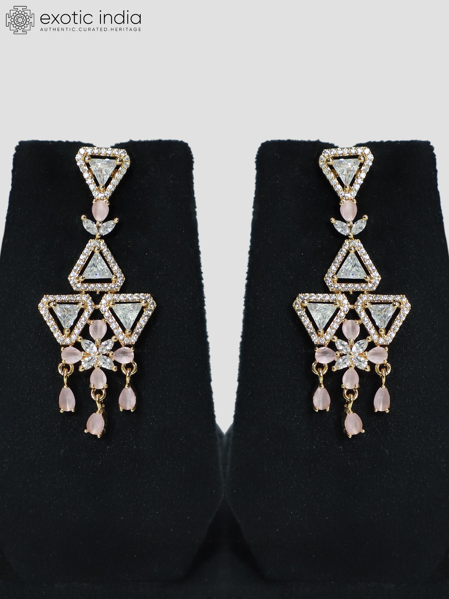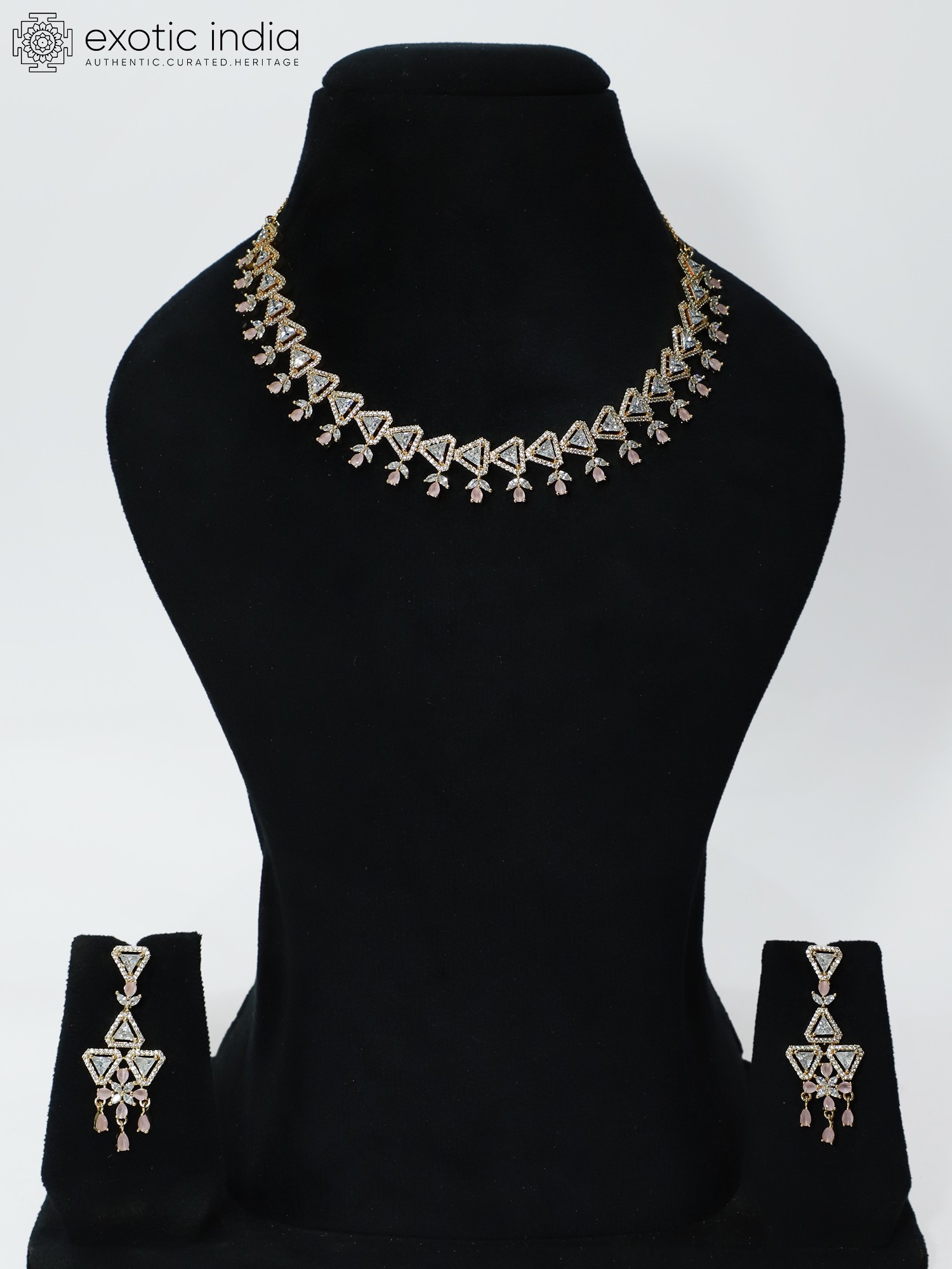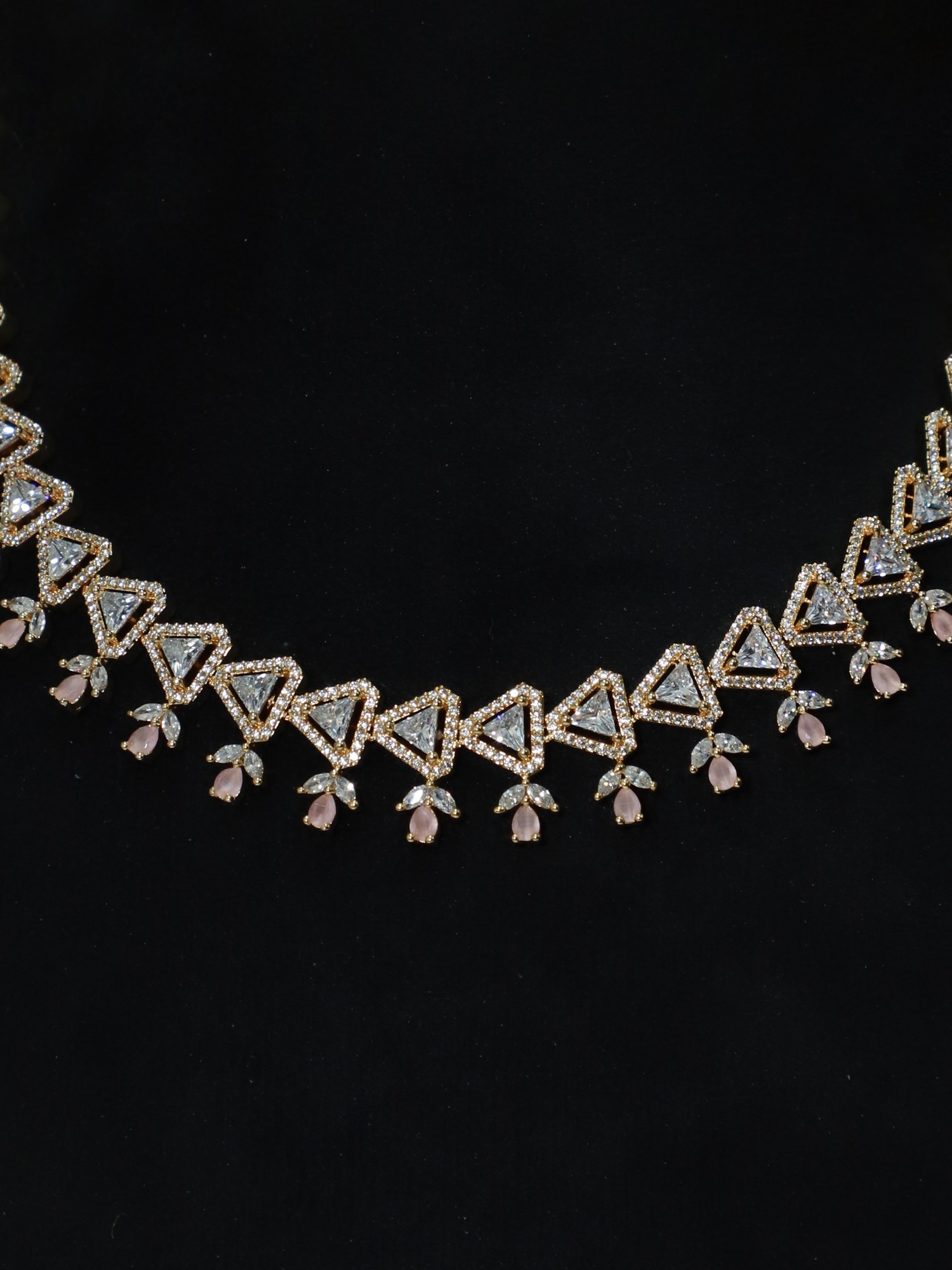 This exquisite set is meticulously crafted with attention to detail. The necklace and earrings are adorned with high-quality American Diamonds, known for their brilliant sparkle and clarity. These stones are carefully set to maximize their brilliance, creating a dazzling effect. The durable construction ensures that this set will remain a cherished piece in your jewelry collection for years to come.