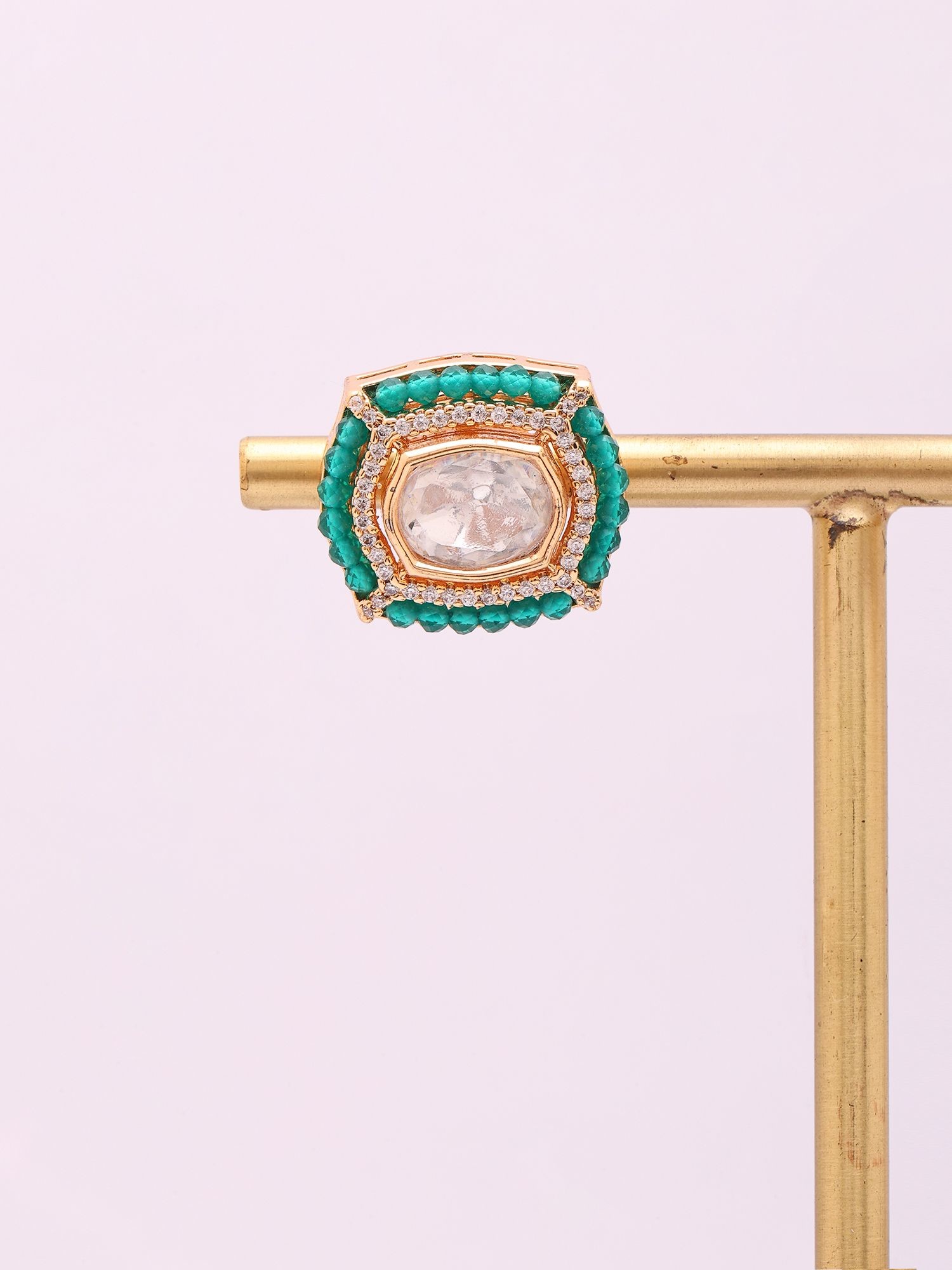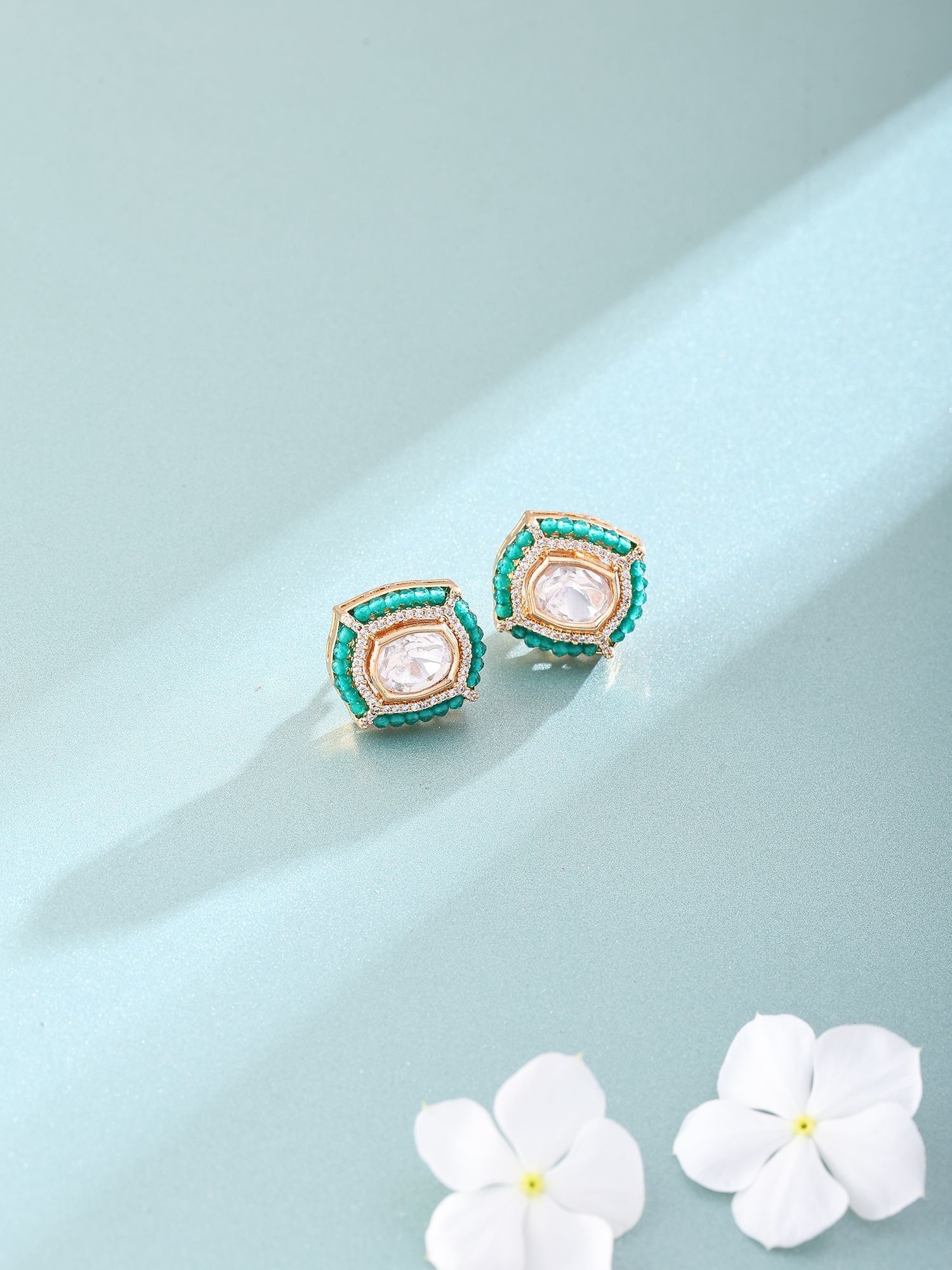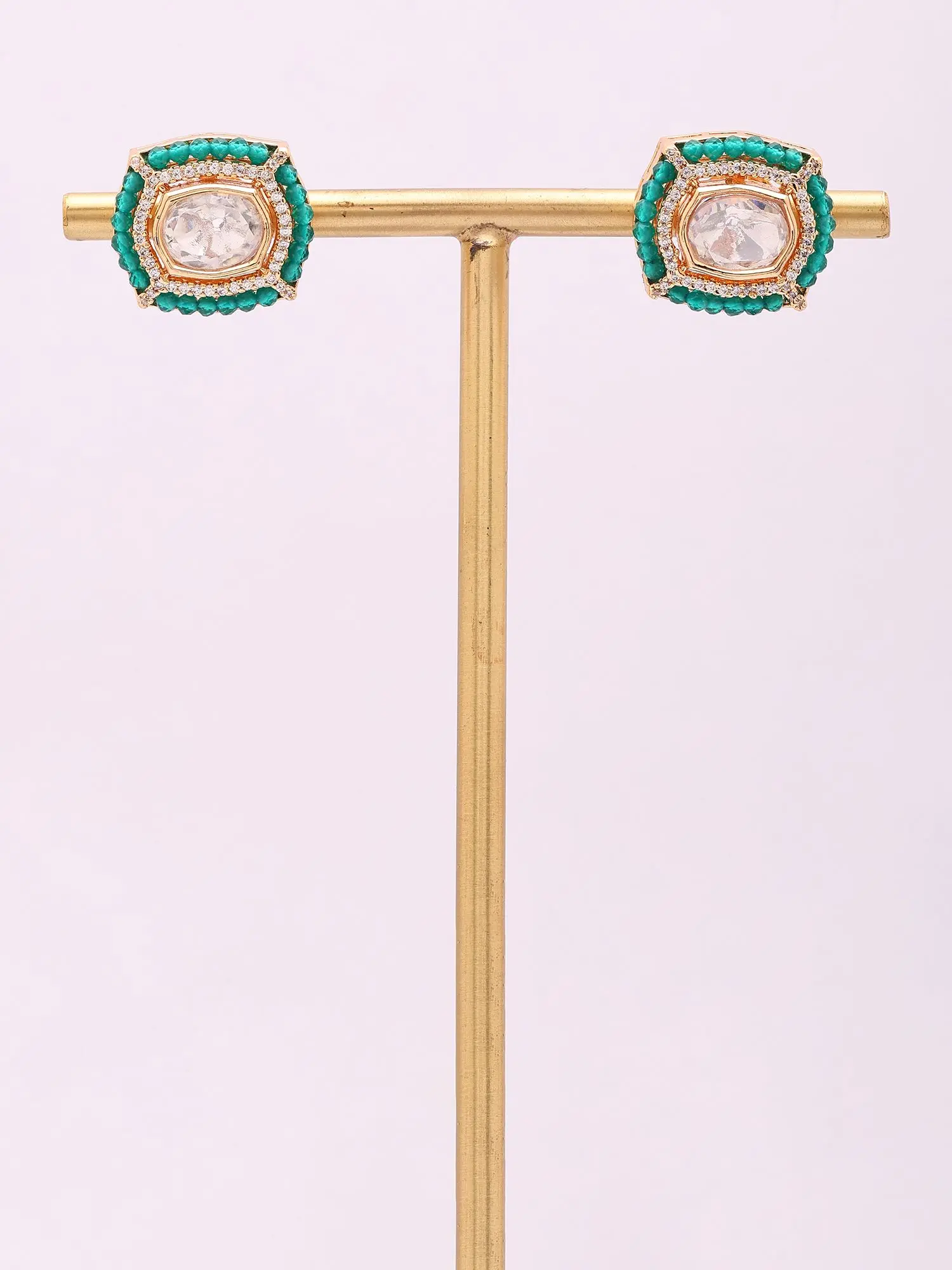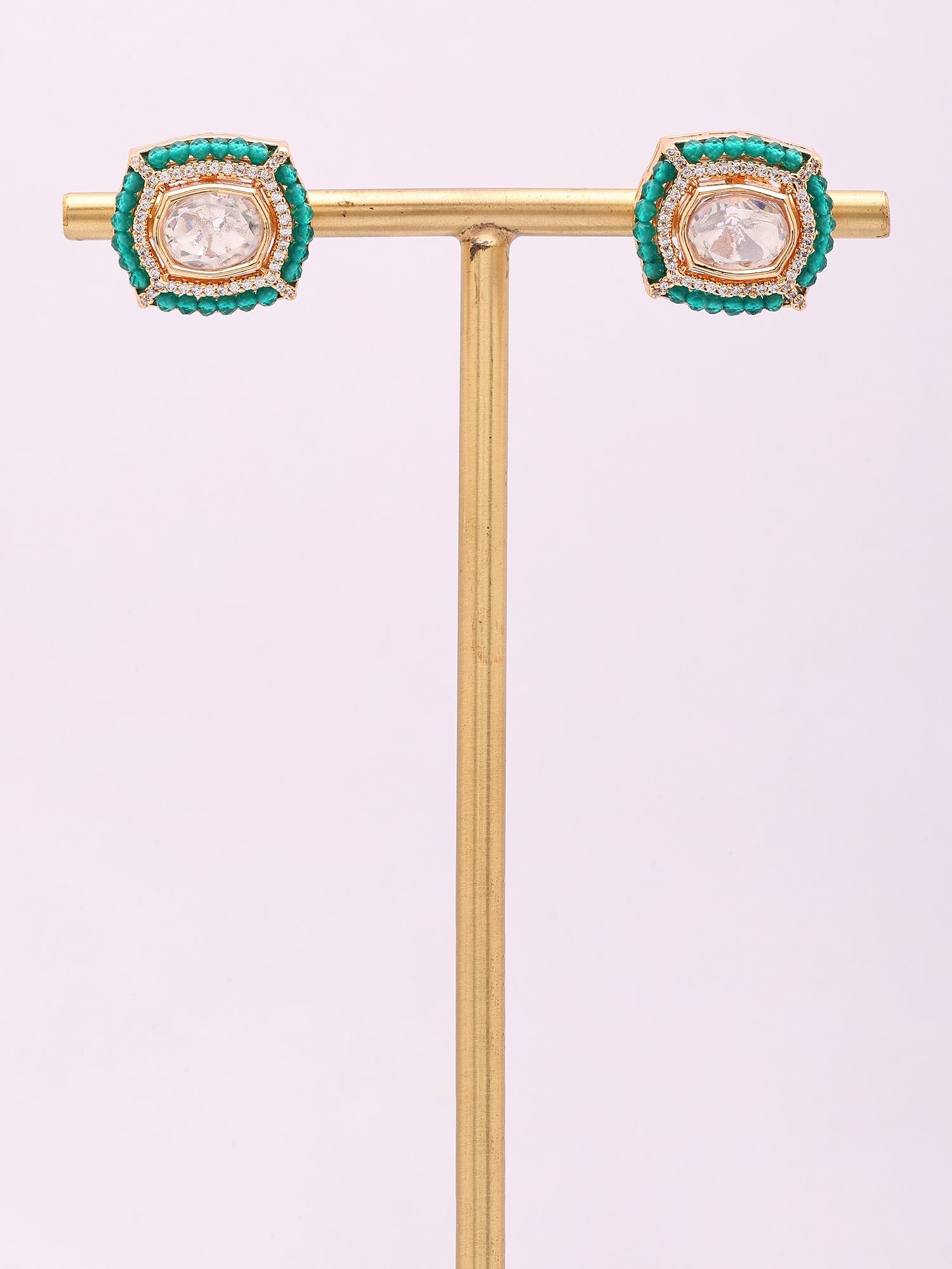 Green Base Polki Stud Earrings with Beaded Border