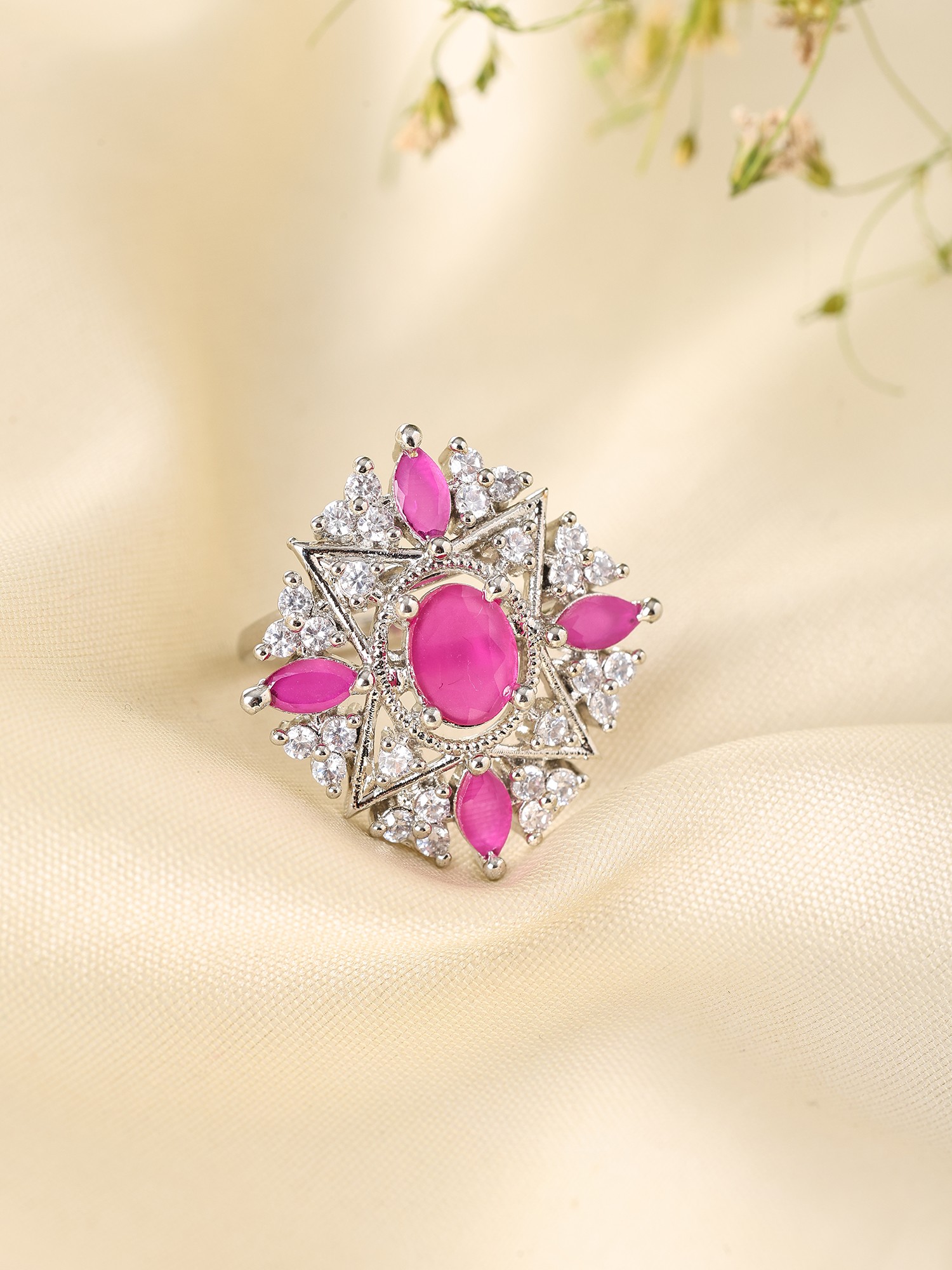 Pink Stone Studded Adjustable American-Diamond Statement Ring