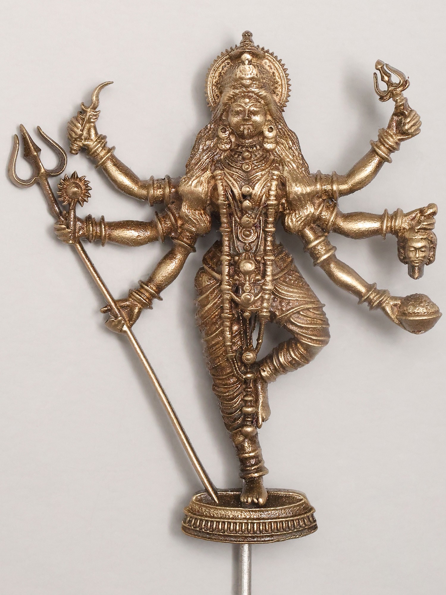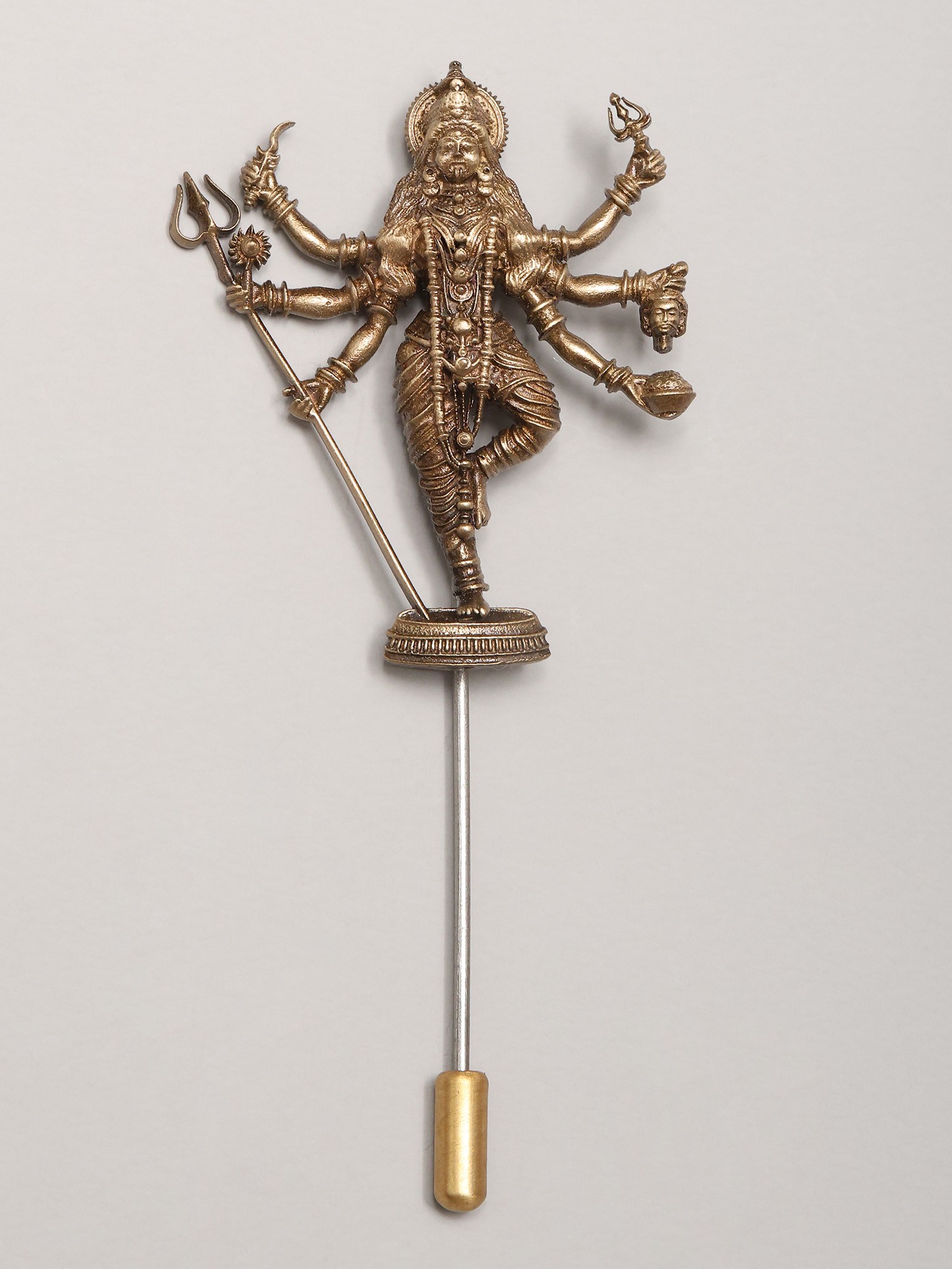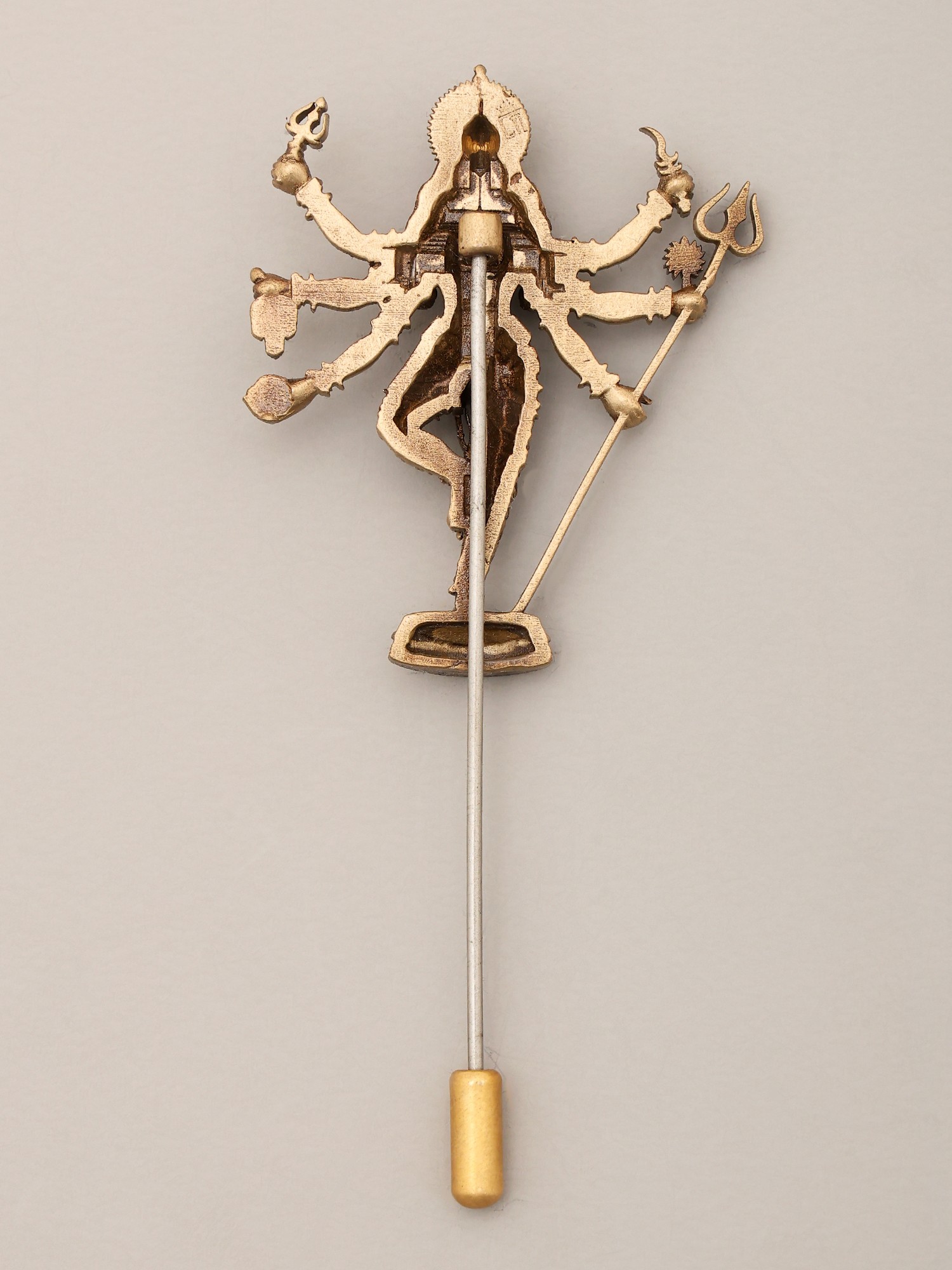 This exquisite brass lapel pin showcases the powerful Hindu goddess Kali in stunning detail. The intricate craftsmanship captures the dynamism and multifaceted nature of this revered deity. Kali, the goddess of time, power, and change, is depicted with her multiple arms wielding various symbolic weapons and offerings, reflecting her complex and commanding presence. This piece is more than just an accessory; it's a statement of faith and a celebration of artistry. The rich, golden hue of the brass enhances the visual appeal, making it a captivating addition to any collection or outfit.