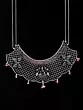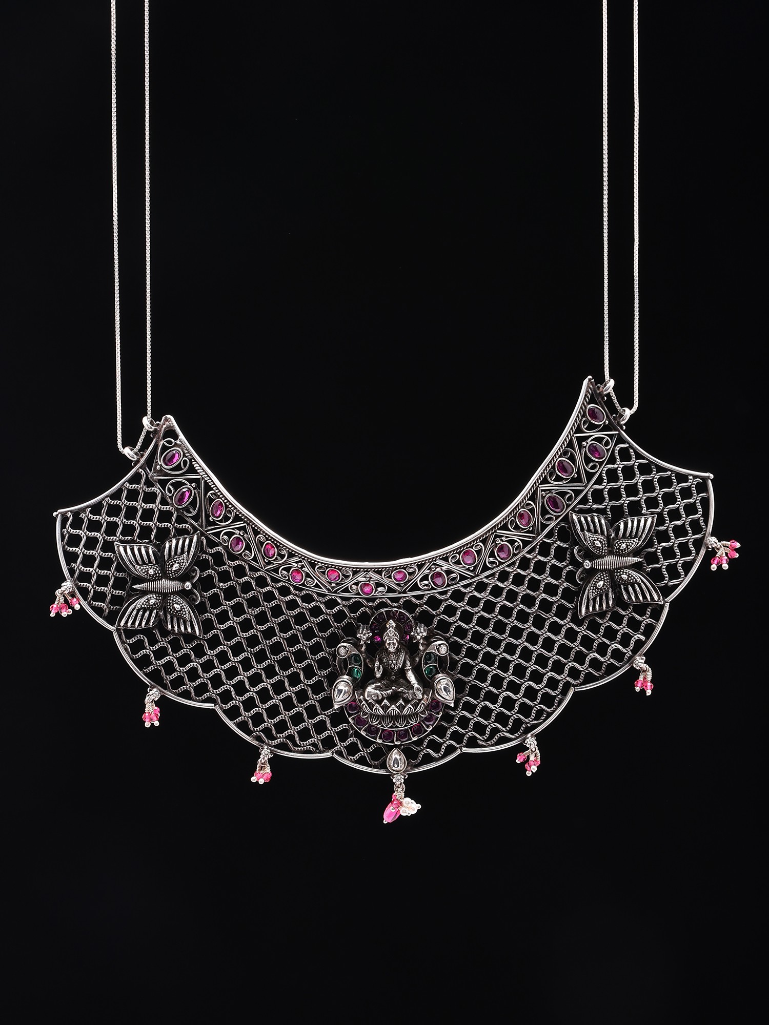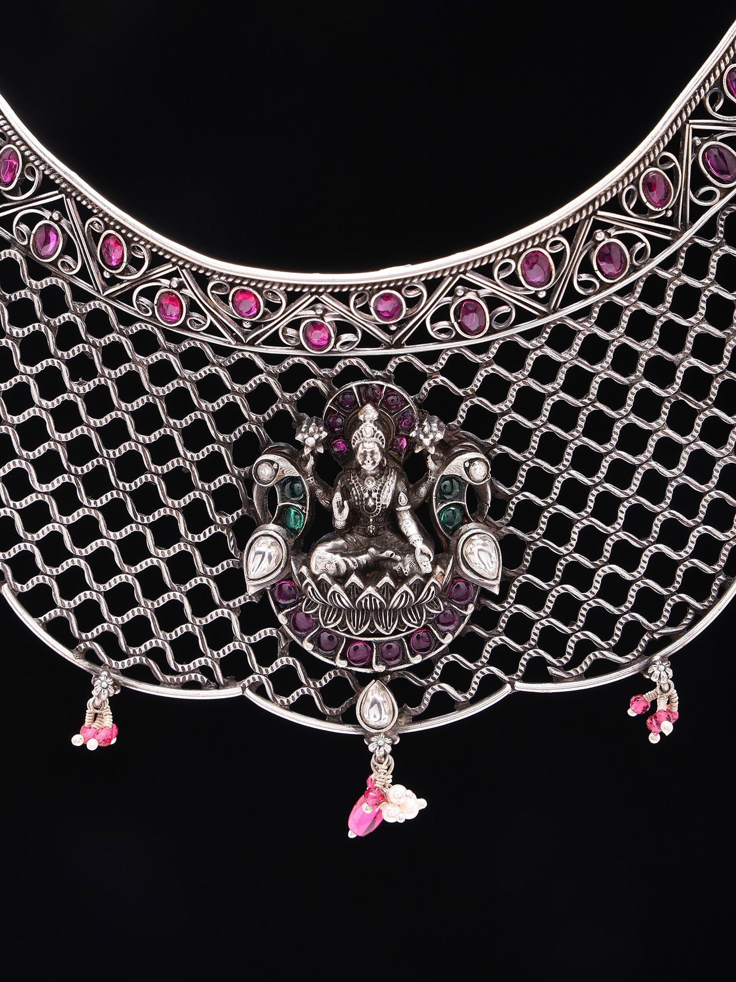 Goddess Lakshmi Jaali Work Oxidised Silver Collar Necklace and Earring Set
