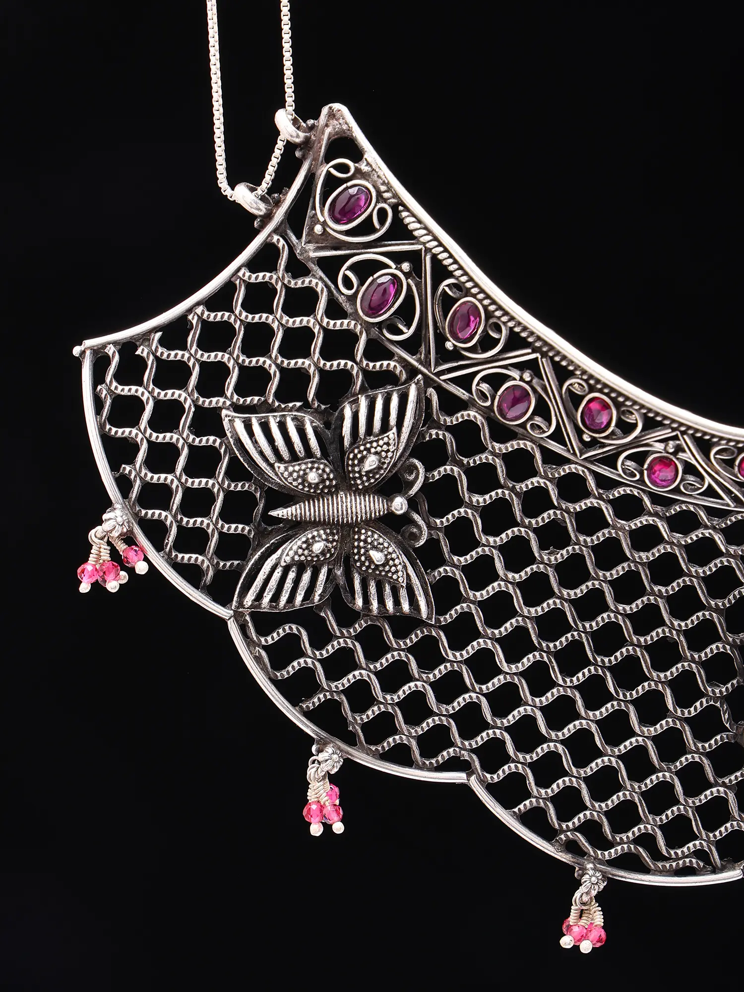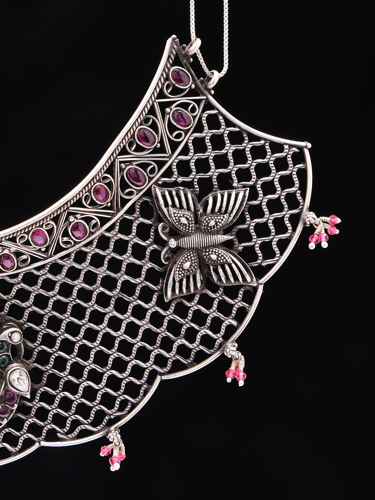 Each element of this collection is meticulously handcrafted from the finest sterling silver, showcasing a rich patina achieved through an artisanal oxidisation process. The intricate jaali work, a testament to traditional artistry, creates a delicate, lace-like pattern that is both sophisticated and timeless. Artisans have painstakingly shaped and detailed every curve and motif, ensuring a level of quality that you can see and feel.