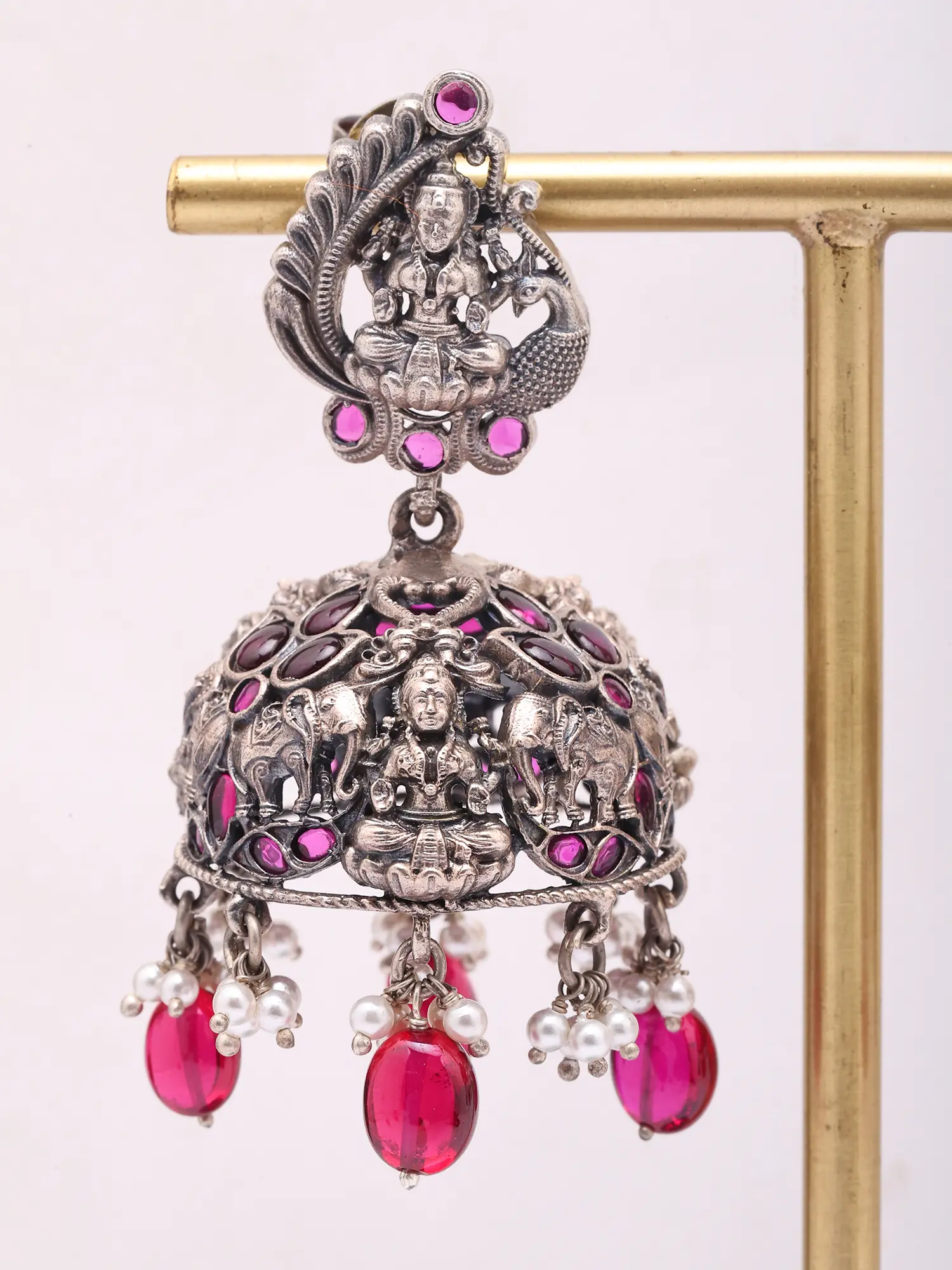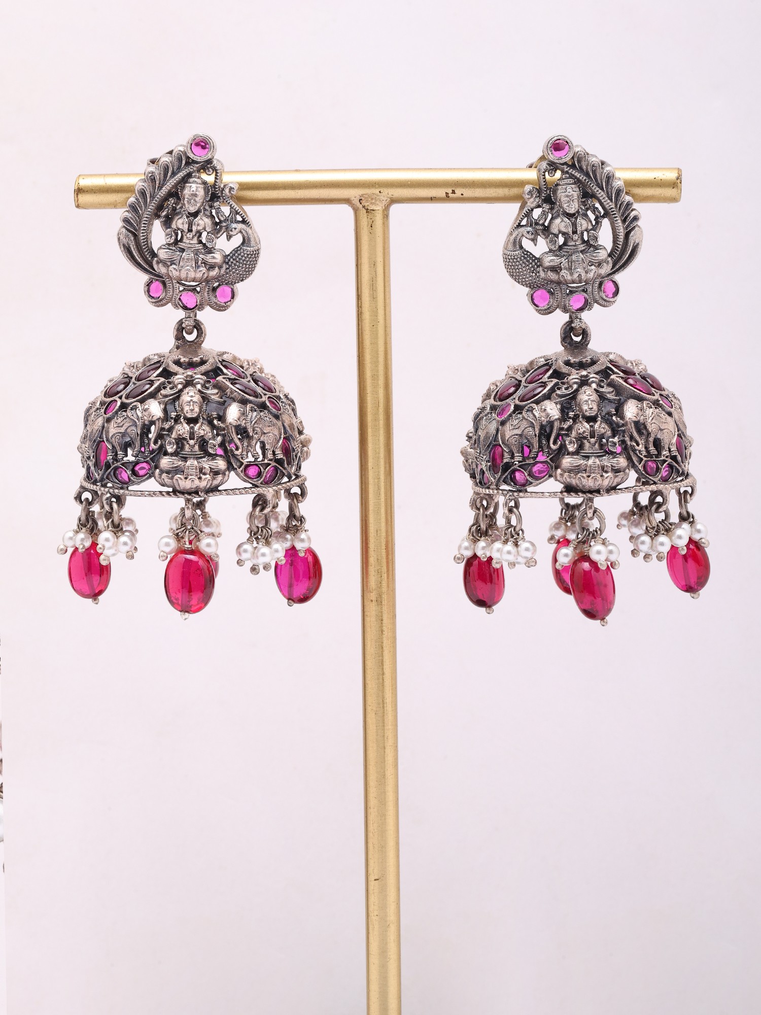 These striking earrings feature a captivating jhumka design, measuring approximately 2.5 inches in height and 1.25 inches in width, creating a graceful and noticeable presence. The intricate depiction of Goddess Lakshmi atop each post, surrounded by auspicious motifs, is a visual marvel. Dangling from the bell-shaped drops, the richly hued tourmaline beads are interspersed with luminous pearls, creating a mesmerizing play of colour and light that draws the eye.