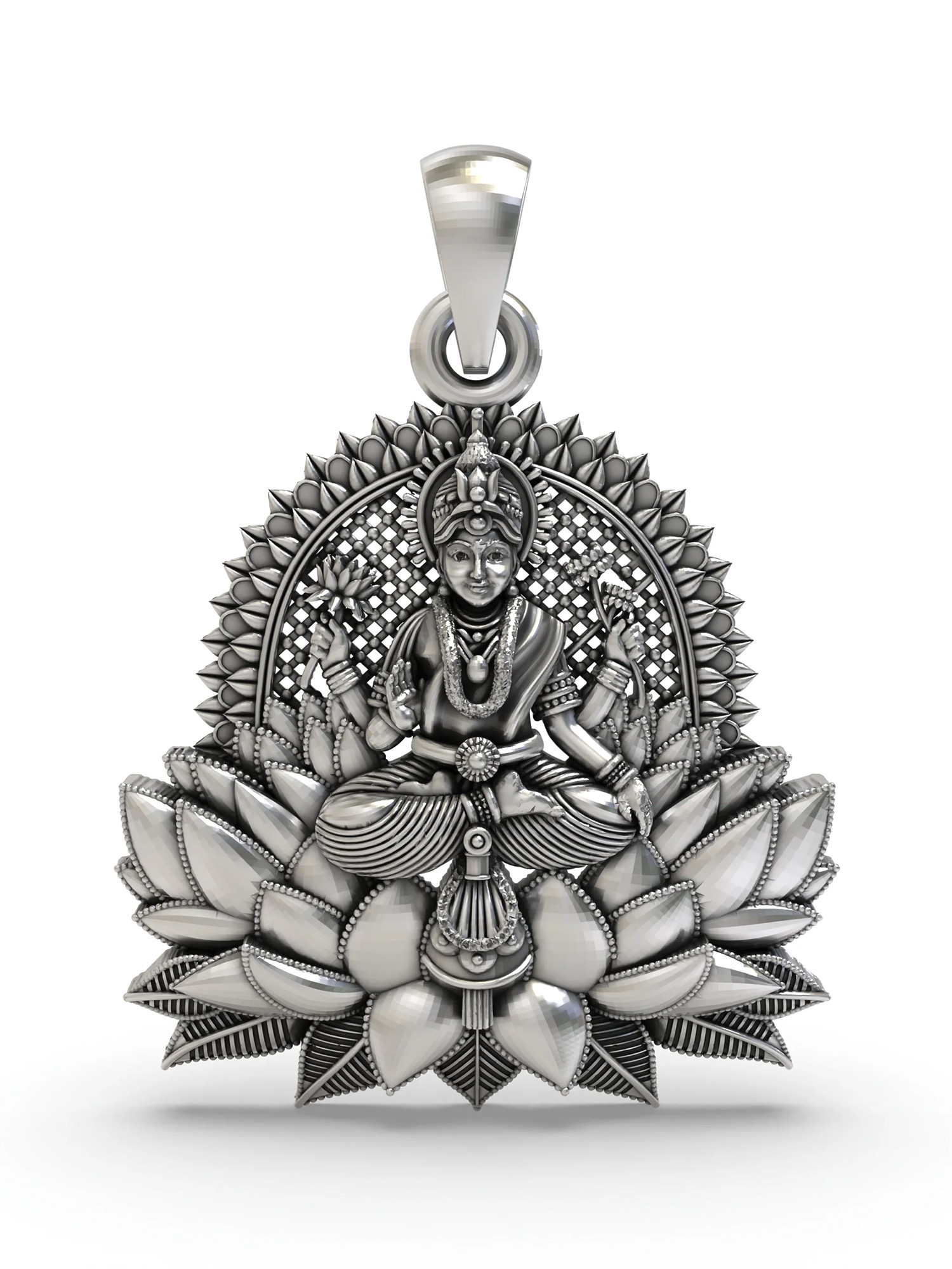 Goddess Lakshmi is revered as the bestower of wealth, prosperity, good fortune, and abundance. Adorning this pendant is a way to keep her blessings close, serving as a constant reminder of these cherished values. Whether you are seeking to enhance your financial well-being, attract good luck, or simply appreciate the rich symbolism and artistic merit of this piece, this pendant is a meaningful choice. Its design is both spiritually significant and aesthetically captivating, making it a perfect adornment for any occasion. The pendant is cast in high-quality sterling silver, a precious metal known for its enduring luster and durability. The cool, bright finish of the silver beautifully highlights the intricate carvings and delicate textures, giving the piece a substantial and luxurious feel. The meticulous attention to detail, from the serene expression on Lakshmi's face to the flowing drapery of her garments and the delicate jewelry she wears, makes this pendant a true work of art.