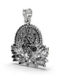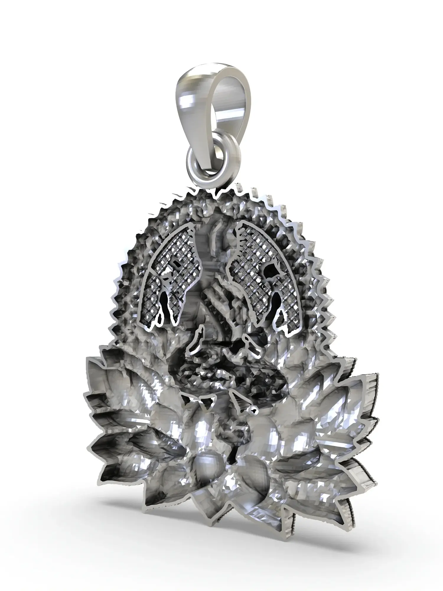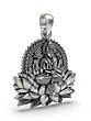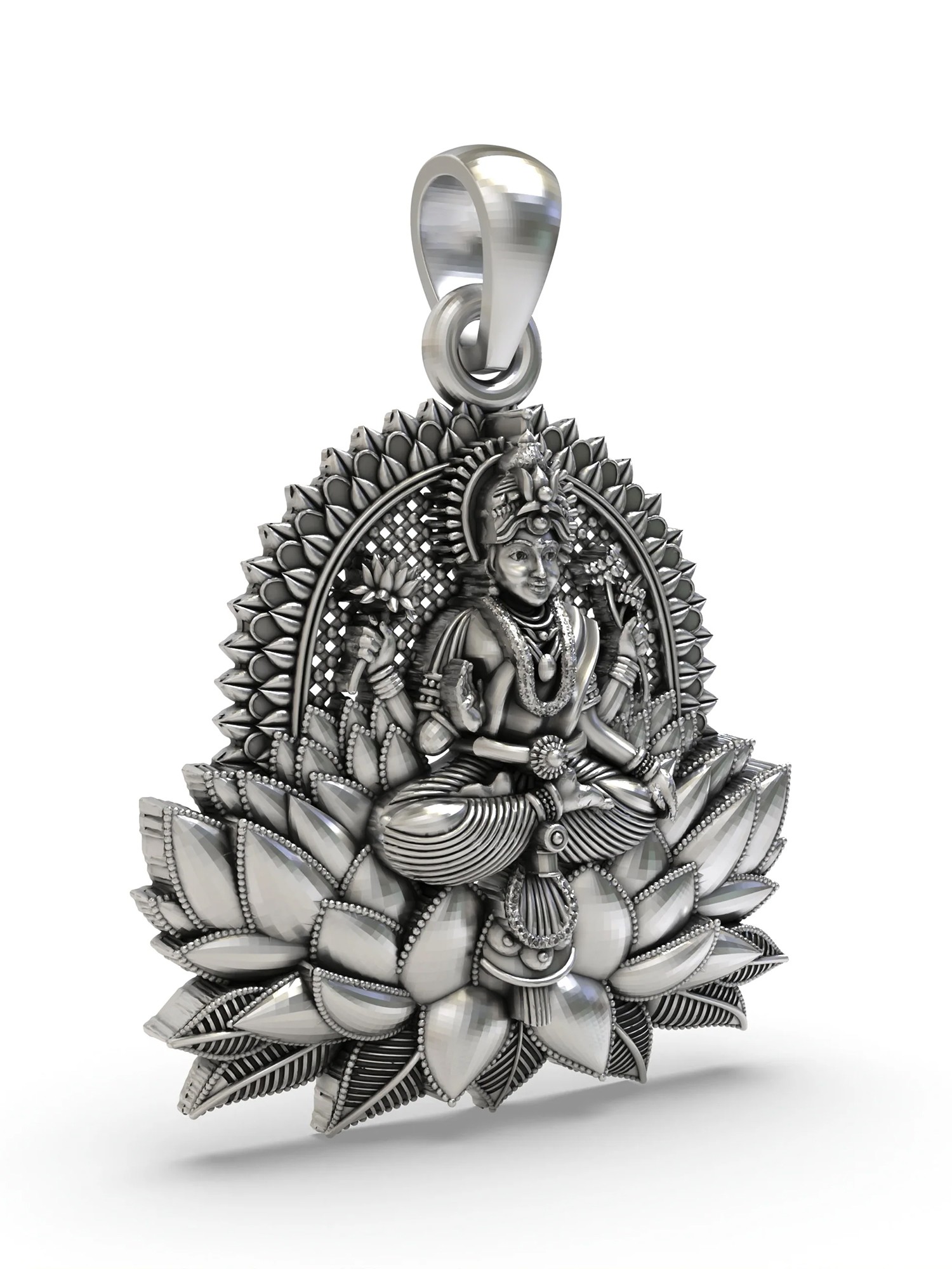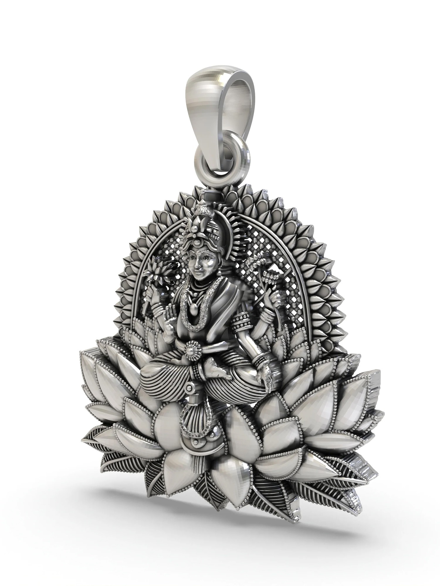 Invite abundance and divine blessings into your life with this exquisite sterling silver pendant, meticulously crafted to depict Goddess Lakshmi seated serenely on a blooming lotus. This pendant is a testament to skilled artistry, capturing the essence of the Hindu goddess of wealth, fortune, and prosperity. The intricate details showcase Lakshmi in her classic posture, radiating an aura of peace and generosity. Each element of this pendant is thoughtfully designed. The lotus, a symbol of purity, beauty, and spiritual awakening, forms the sacred throne for the goddess, its petals rendered with remarkable lifelike texture and detail. From the delicate outlining of each petal to the subtle beadwork adorning its edges, the craftsmanship speaks volumes. The ornate halo behind Lakshmi, resembling a radiating sunburst or a stylized flower, further accentuates her divine presence and adds a regal dimension to the piece.