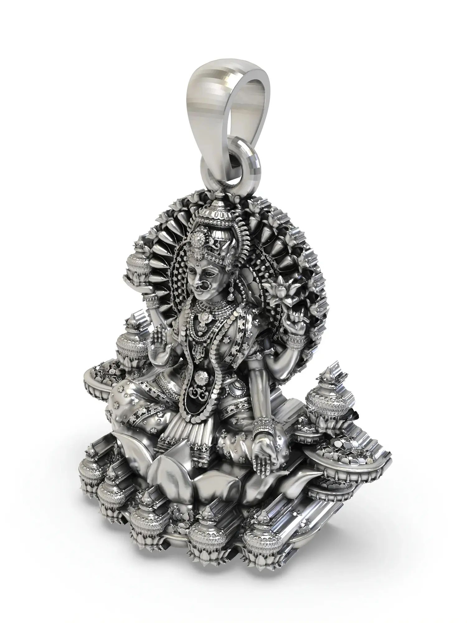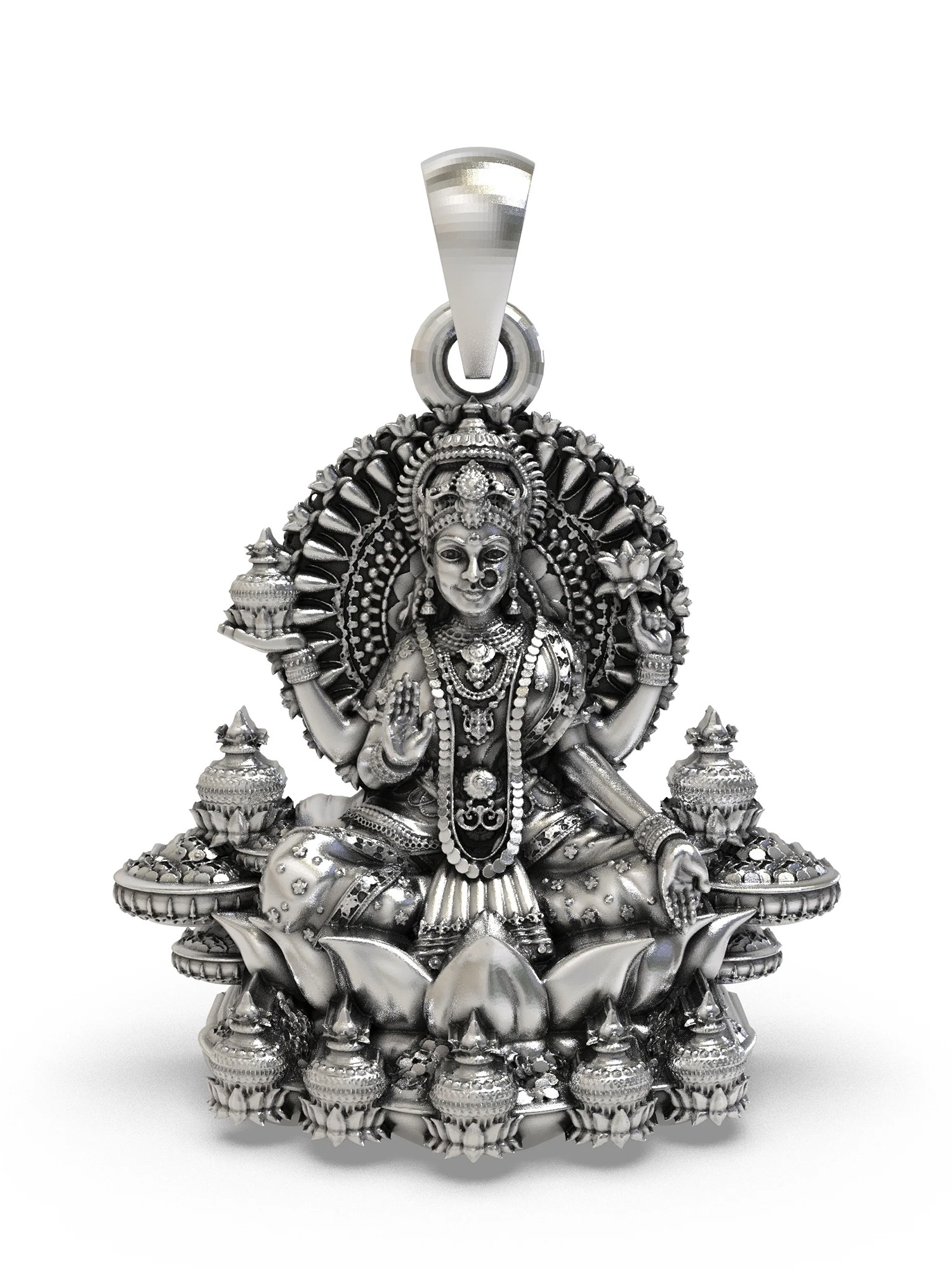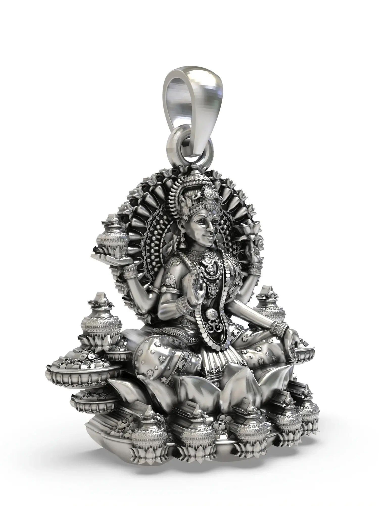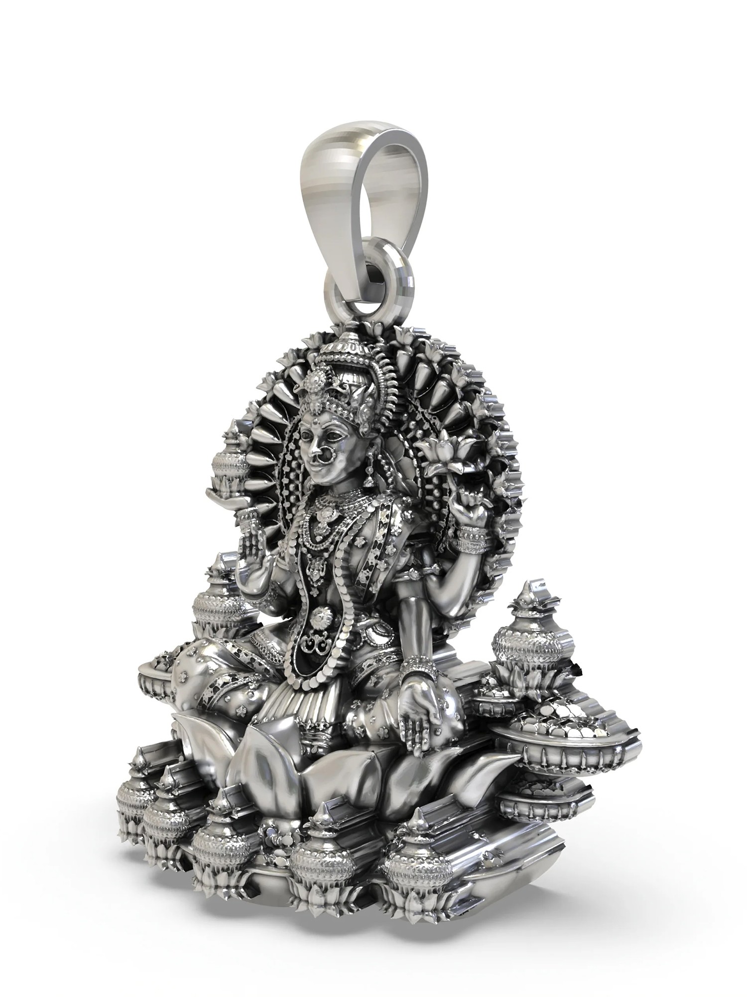 The pendant features Goddess Mahalakshmi seated regally upon a lotus pedestal, a revered symbol of purity, beauty, and spiritual growth. Her serene countenance radiates compassion and grace, while her multiple hands are adorned with traditional ornaments and bestow blessings. In one hand, she holds a Kalash, a sacred pot overflowing with coins, symbolizing unending wealth and prosperity. The other hands are depicted in auspicious mudras, offering protection and abundance. The elaborate halo behind her head, intricately designed with radiating patterns, further enhances her divine aura. The entire piece is a testament to masterful artistry, showcasing a level of detail that brings the divine figure to life.