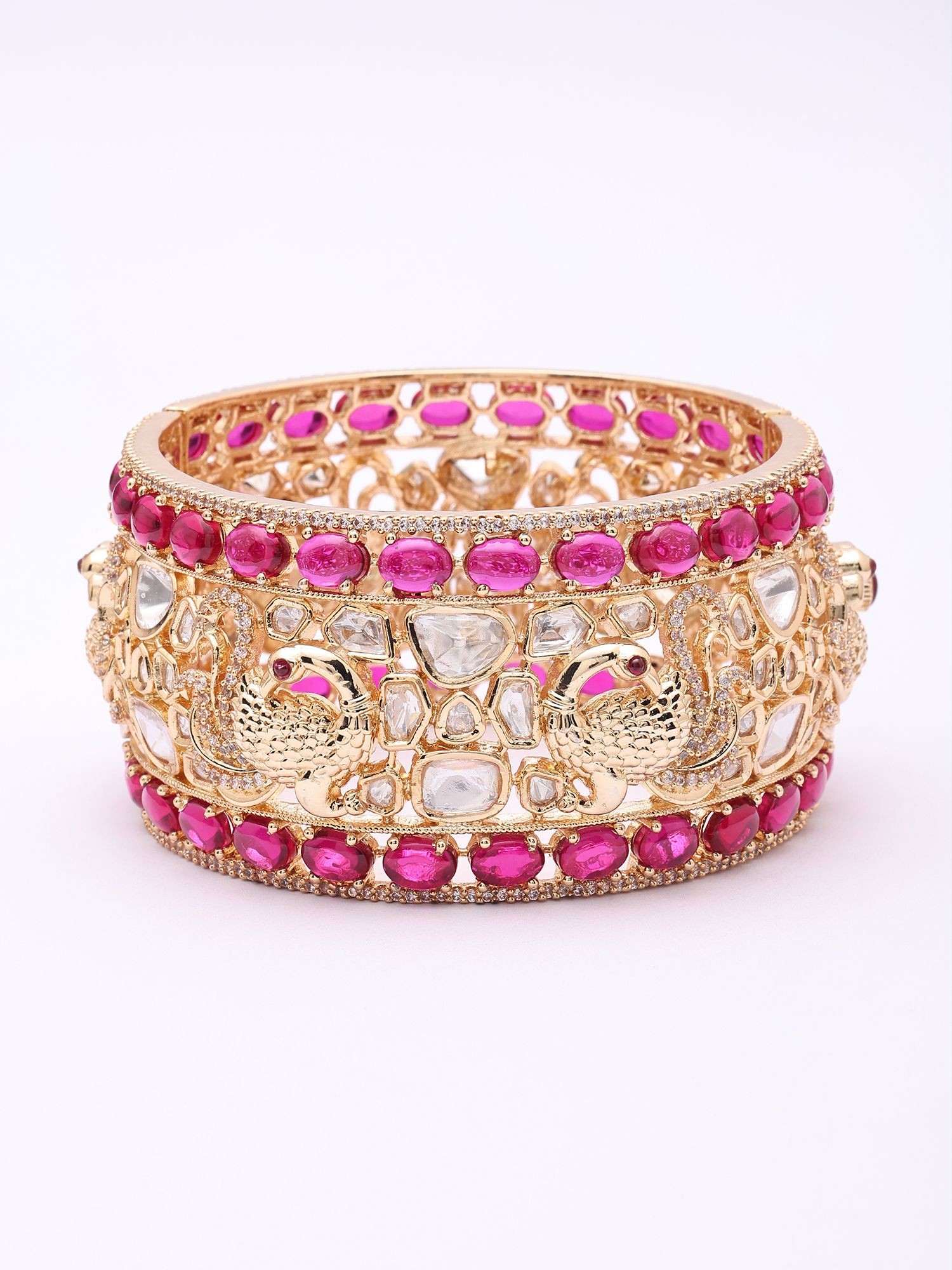 The radiant gold tone serves as the perfect backdrop for the vivid ruby-red stones that line its edges, their deep hue a captivating contrast to the shimmering polki stones interspersed throughout. These natural polki stones, celebrated for their raw beauty and unique facets, offer an ethereal glow that catches the light with every subtle movement. The substantial width of 1.40 inches creates a commanding presence, while the thoughtful inner diameter of 2.05 inches ensures a comfortable and secure fit.