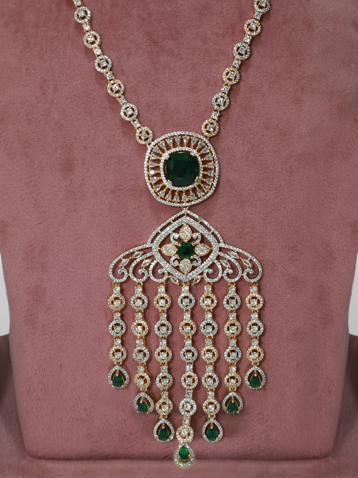 This set showcases masterful craftsmanship, featuring a meticulously designed necklace and matching earrings. The design incorporates a central pendant on the necklace, featuring a large stone surrounded by shimmering American Diamonds, which cascades into a series of delicate drops. The gold-tone setting adds a touch of warmth and elegance, perfectly complementing the brilliance of the stones. Each piece is carefully crafted to ensure durability and lasting beauty, allowing you to cherish this set for years to come. The earrings mirror the design elements of the necklace pendant, creating a cohesive and harmonious look. They are lightweight and comfortable to wear, despite their intricate appearance.