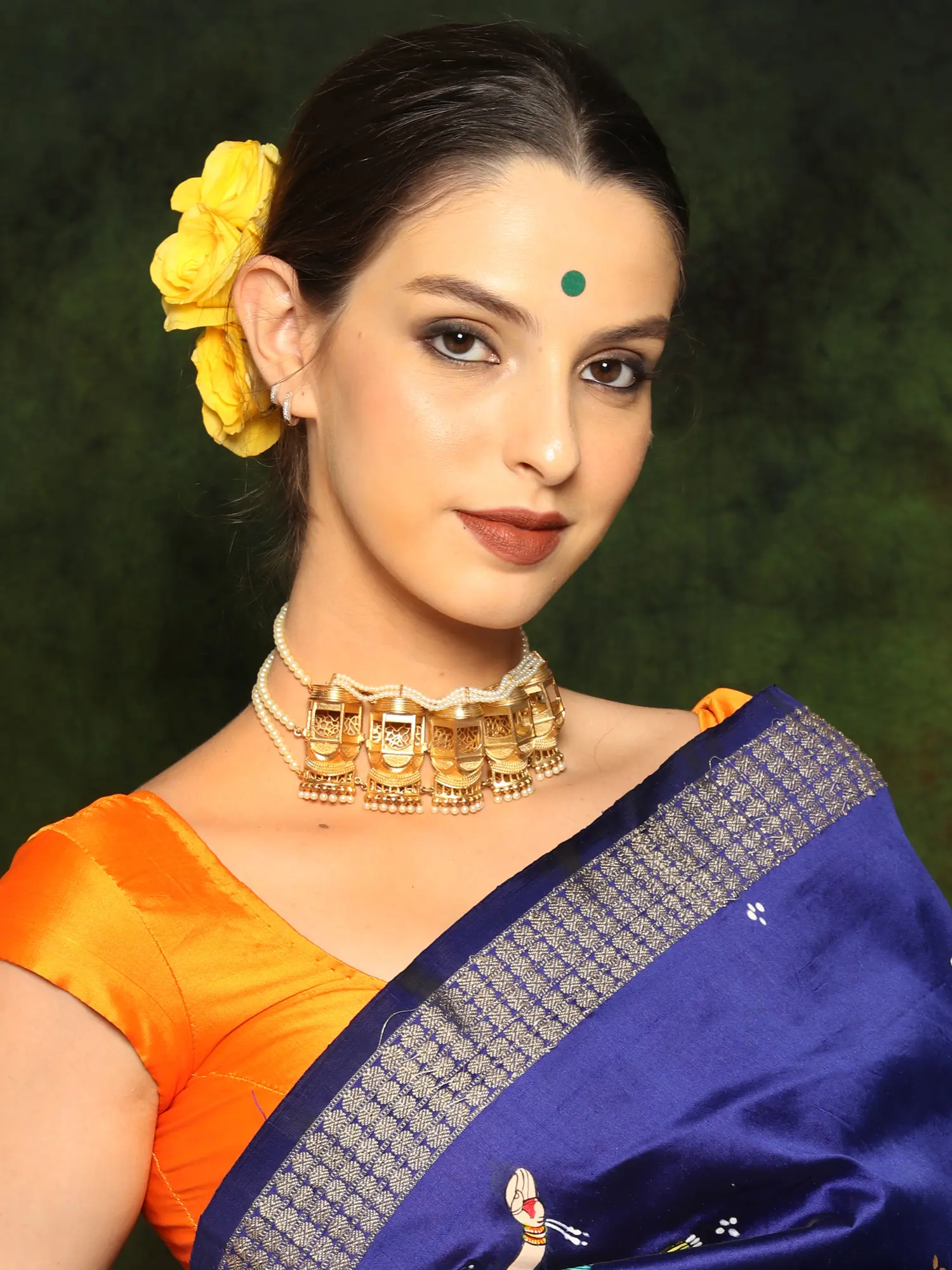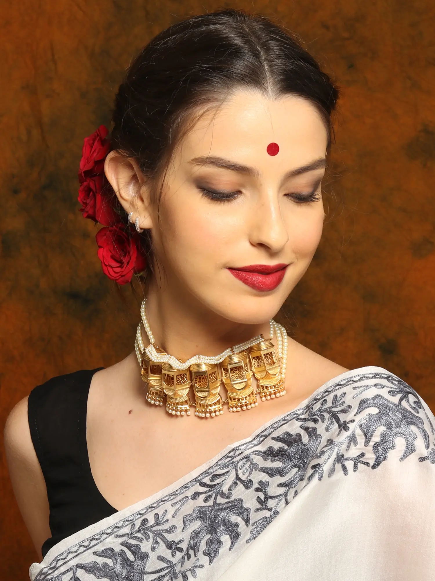 Accentuate your grace with our Golden Colored Brass Choker Set featuring a Pearl Drop. The golden hue of the brass complements the classic charm of pearls, creating a captivating and elegant ensemble. The choker design adds a touch of regal flair, making it a perfect choice for special occasions. The pearl drop enhances the timeless beauty of this set, providing a refined and graceful finishing touch. Make a statement with this Golden Colored Brass Choker Set, where the warmth of brass and the luster of pearls come together in a harmonious blend of style and sophistication.