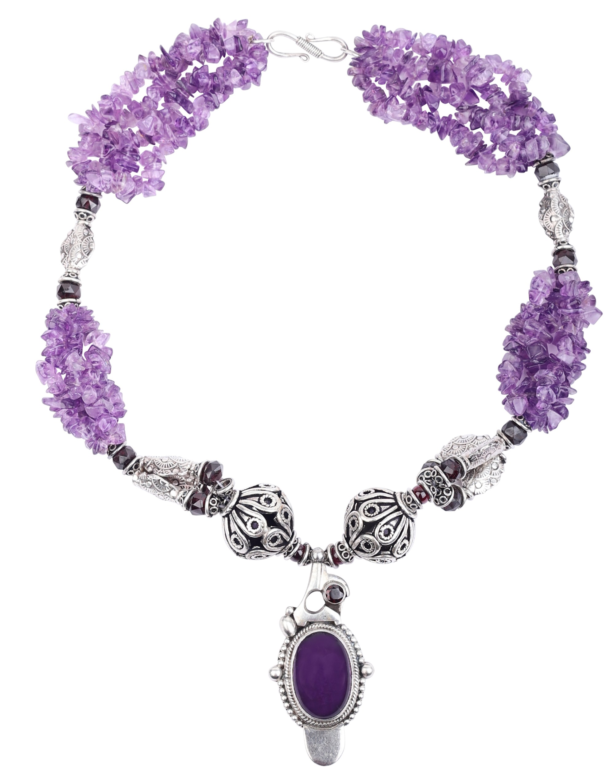 Intricate details and contrasting materials contribute to the necklace’s sophisticated appeal. Ornate sterling silver beads, featuring delicate filigree work, punctuate the strand, offering a dazzling counterpoint to the raw beauty of the amethyst. Dazzling faceted garnet beads add depth and dimension, their deep red tones playing beautifully against the soft purples. The striking pendant takes center stage, showcasing a polished oval of deep purple amethyst set within a decorative sterling silver frame. Additional garnet accents further enhance the pendant's visual interest, creating a captivating focal point. The sterling silver clasp provides a secure and elegant finishing touch, ensuring comfortable and confident wear. This is a singular treasure, built to be worn and admired.