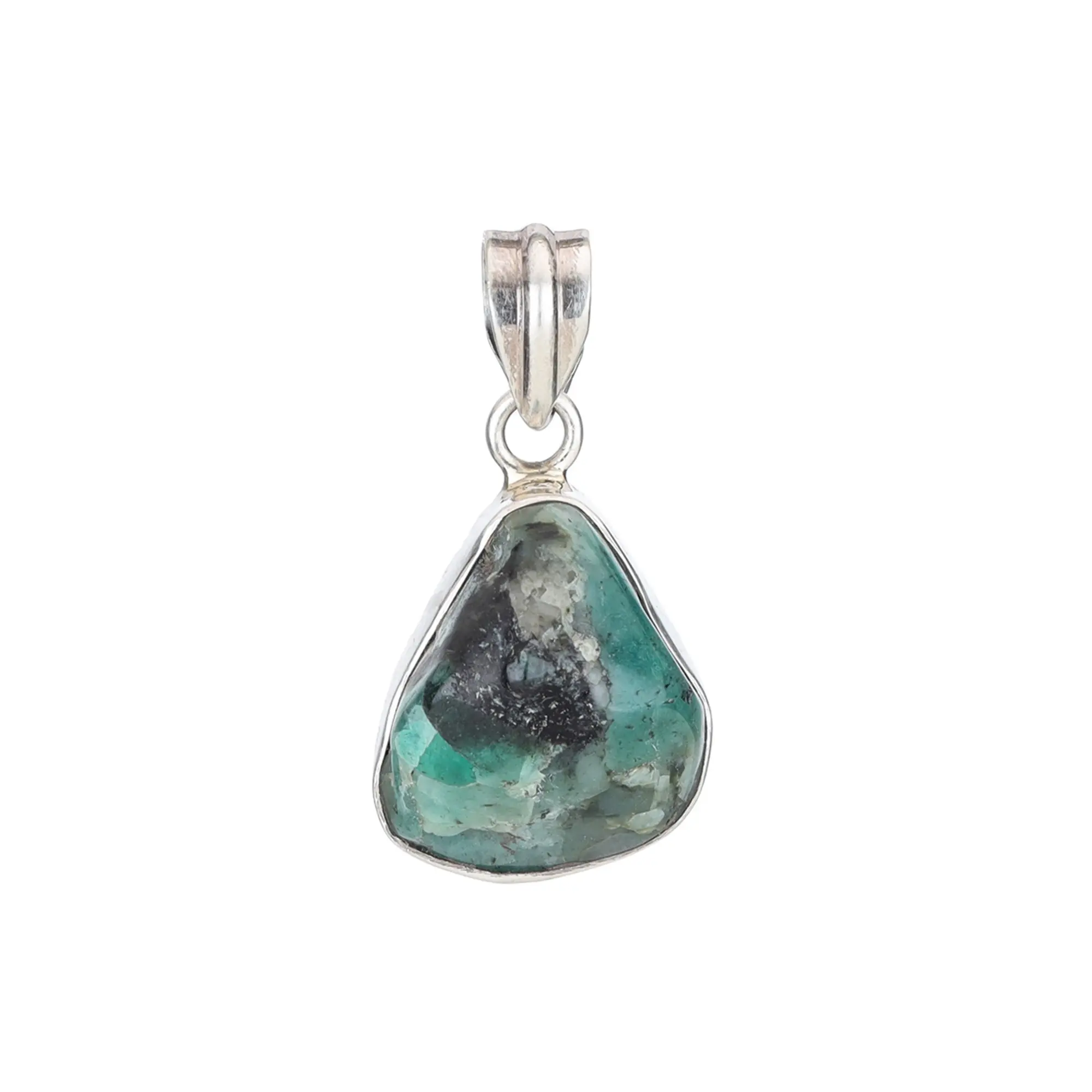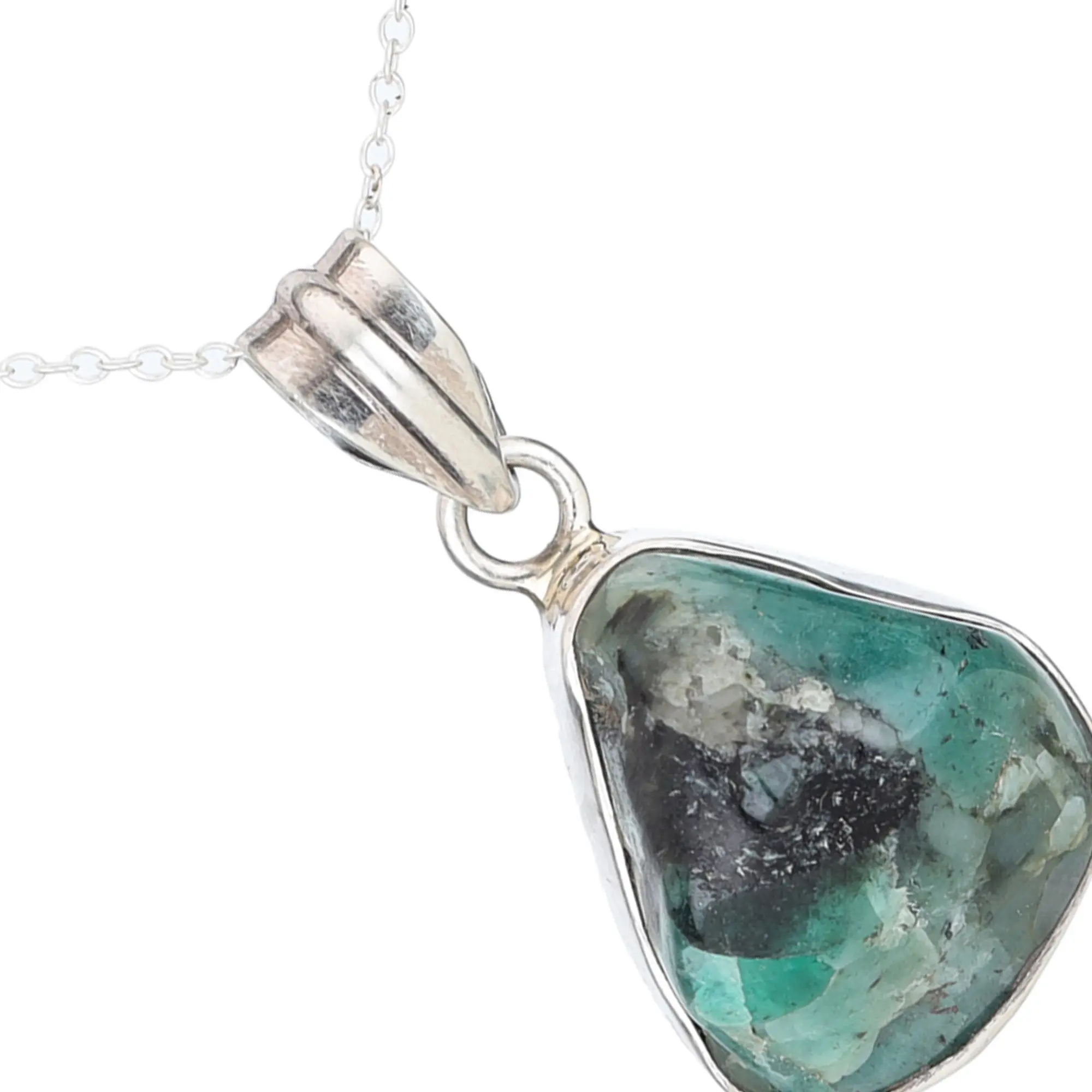 Embrace the raw beauty of nature with this captivating pendant. At its heart lies a verdant stone, its surface a mesmerizing landscape of varying shades of green, interspersed with captivating dark inclusions. The stone's organic shape and subtly textured surface capture a sense of untamed beauty, as if plucked directly from the earth's embrace. Each facet and curve tells a story, whispering of ancient forests and hidden depths.