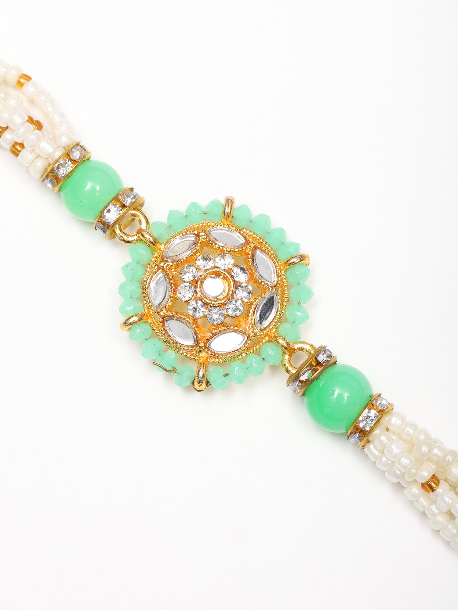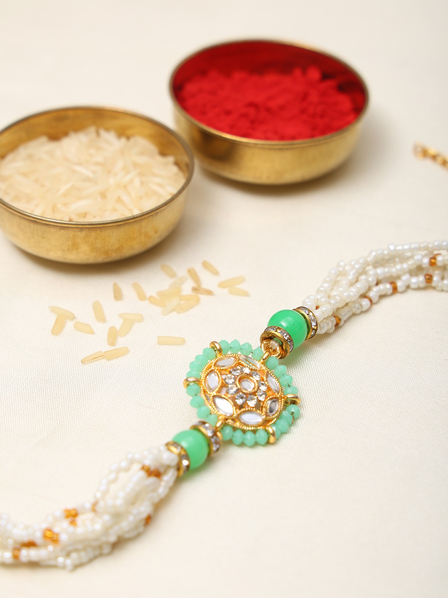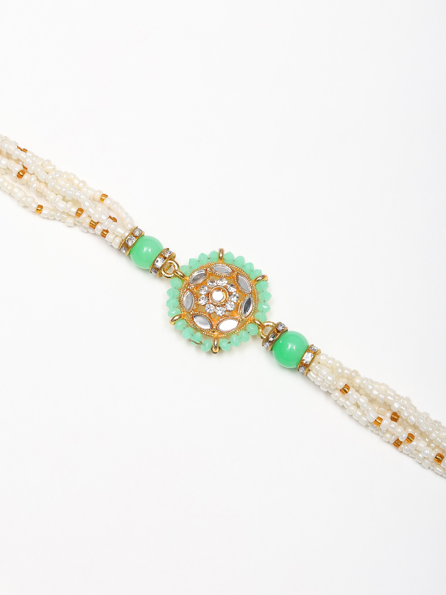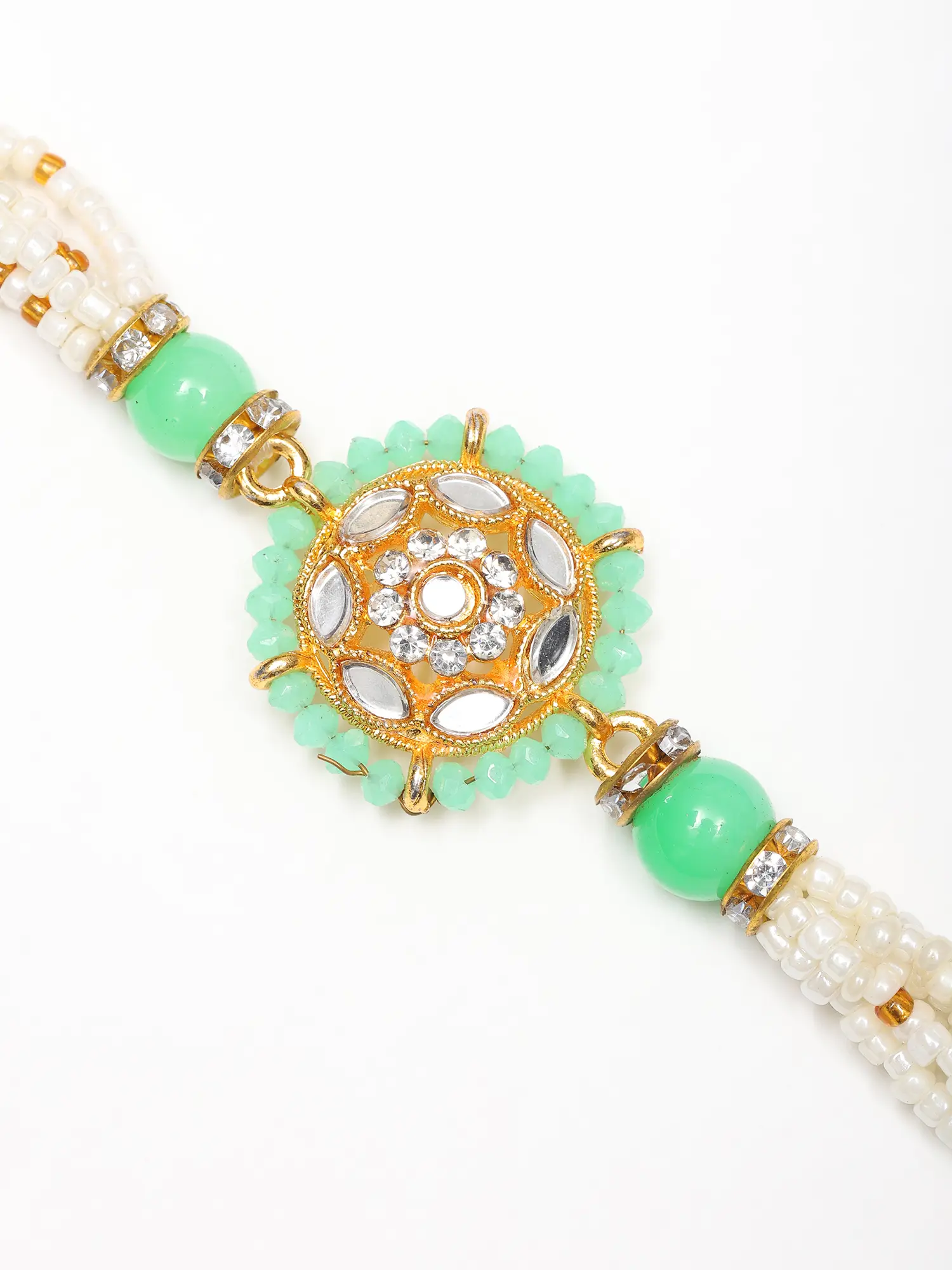 Green and White Beaded Round Shaped Adjustable Bracelet Rakhi