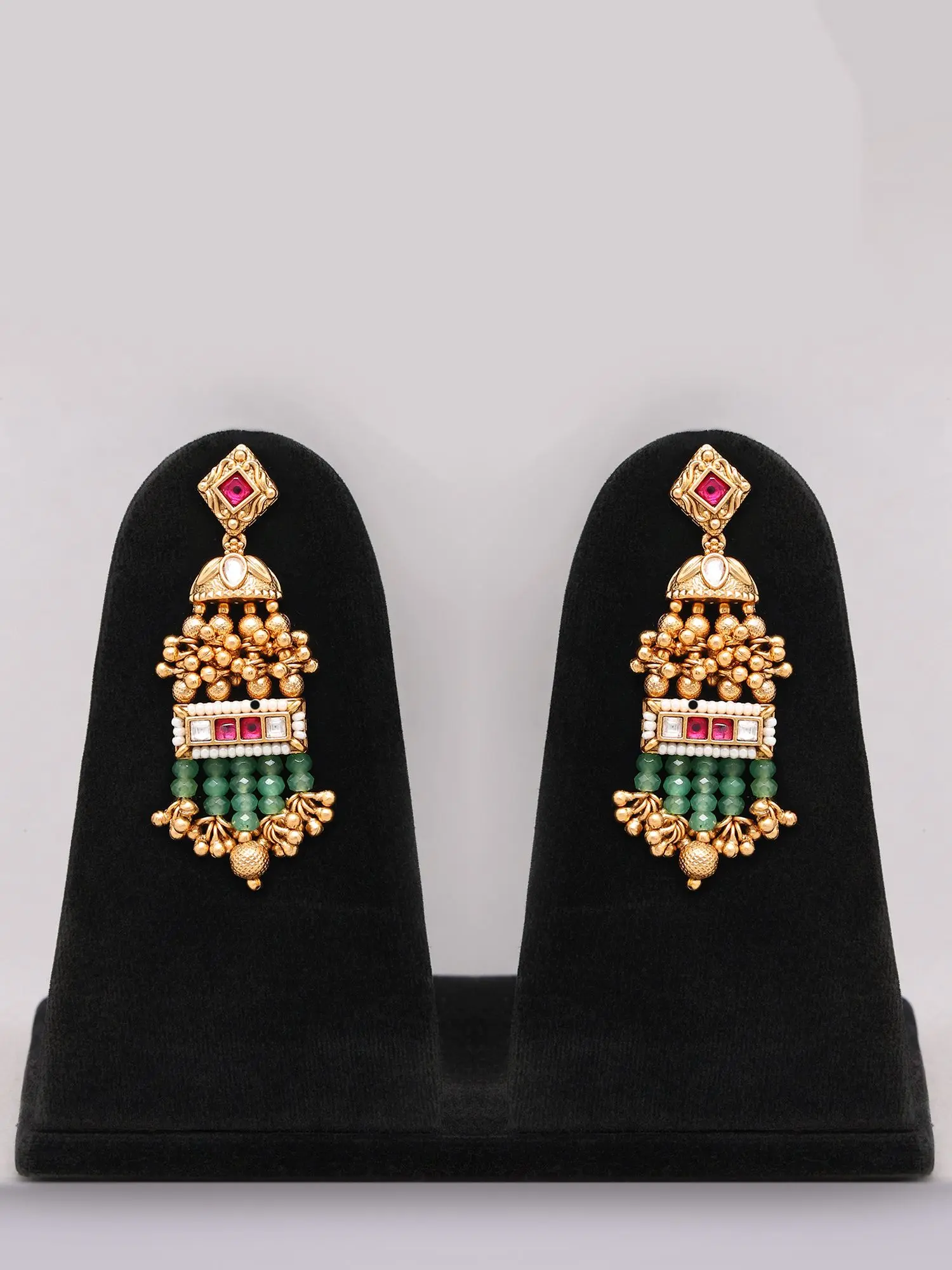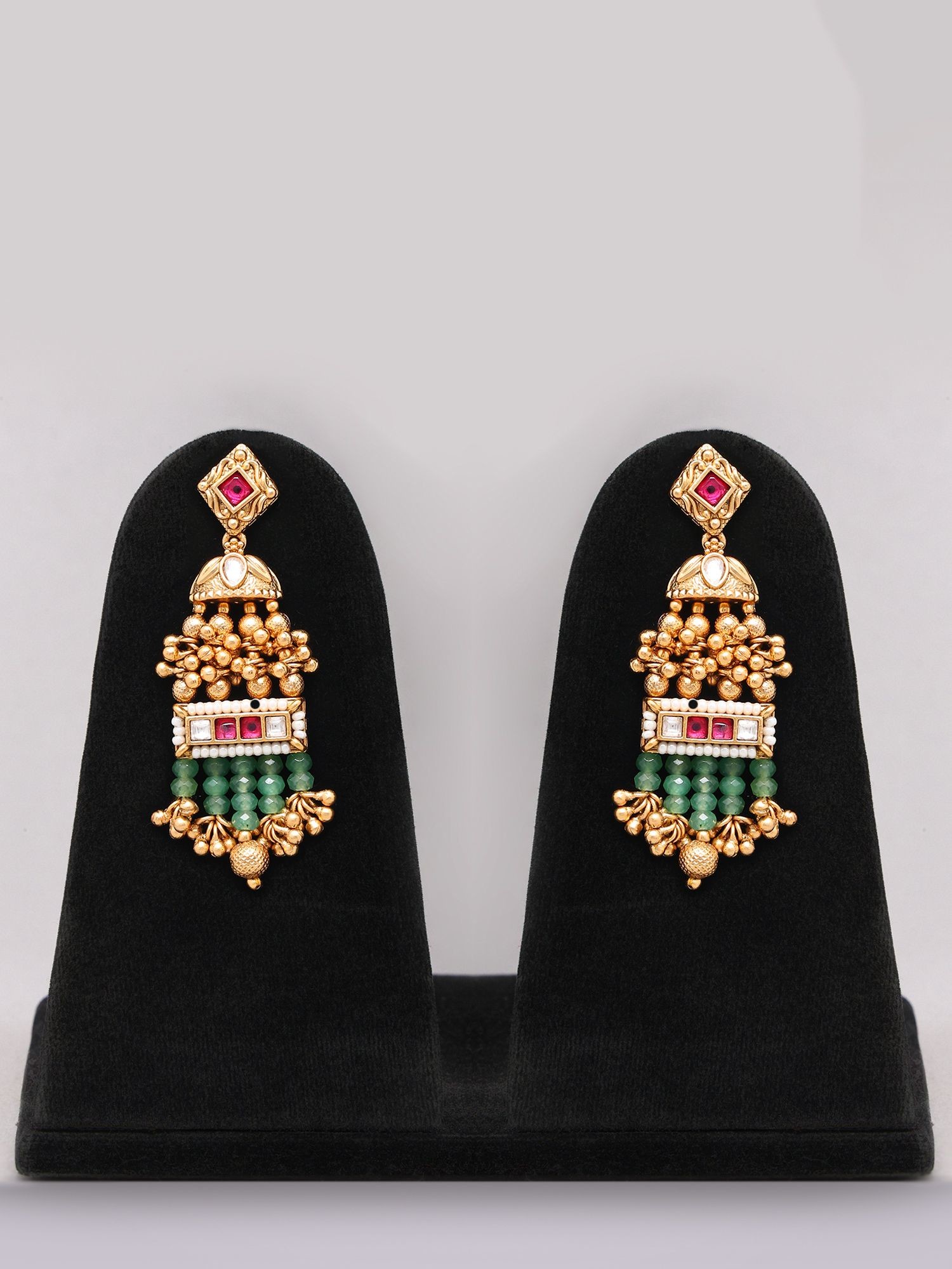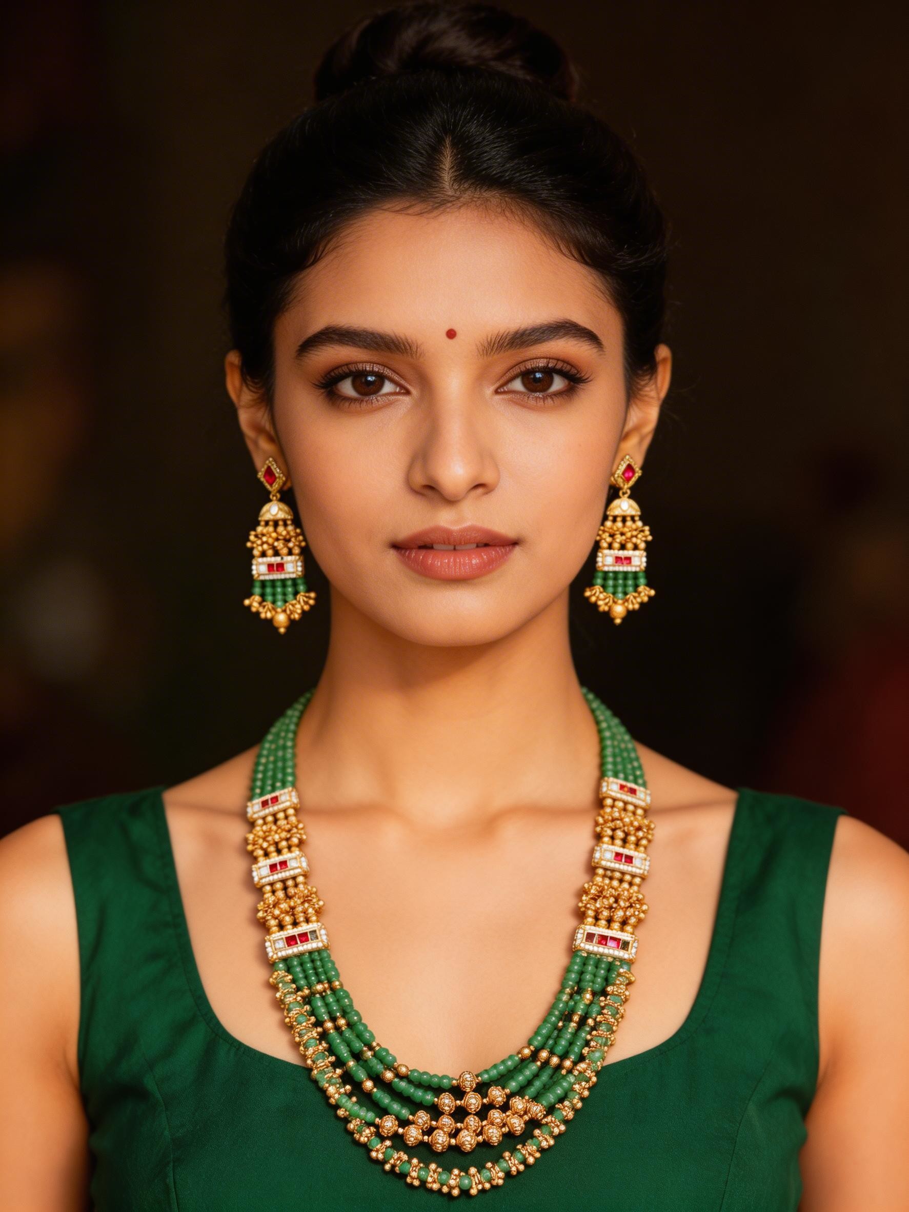 Each component is meticulously crafted from high-quality brass, chosen for its enduring sheen and ability to hold intricate detail. Skilled artisans have painstakingly strung the vibrant green beads, creating a fluid and luxurious drape that speaks volumes of dedication. The traditional Kundan settings, adorned with rich ruby accents and delicate pearls, showcase a level of precision and artistry passed down through generations.