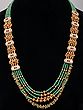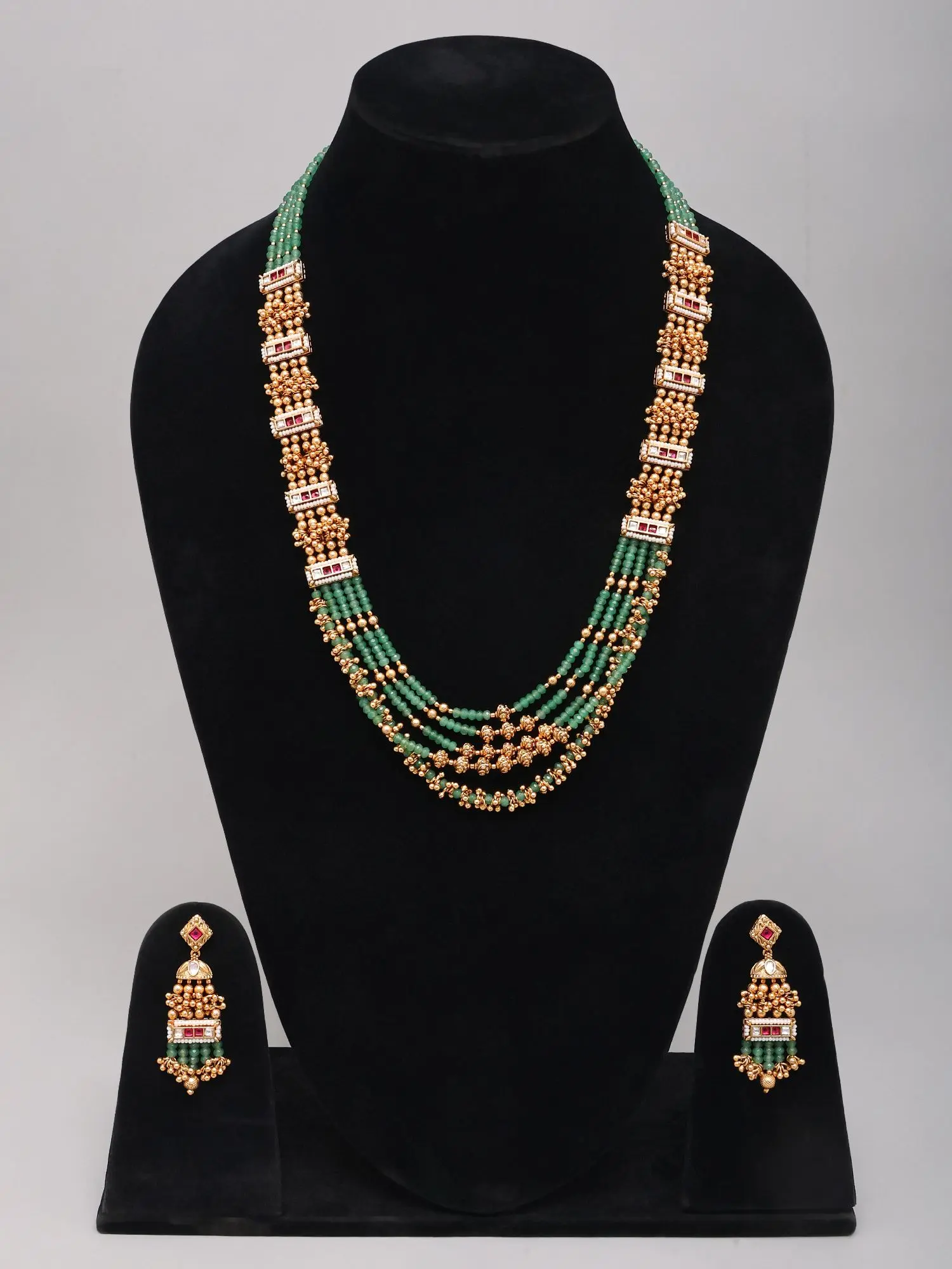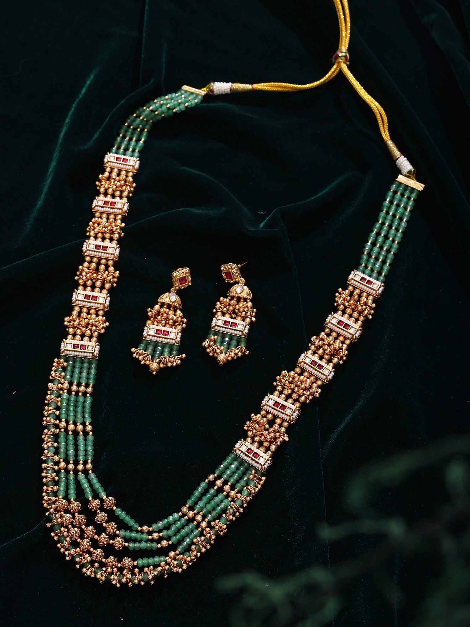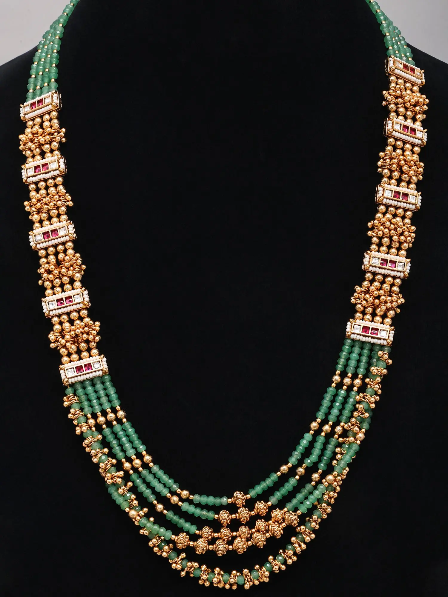 You'll be captivated by the rich, multi-strand design of the necklace, punctuated by ornate, golden floral motifs and geometric Kundan embellishments. The lustrous green beads, approximately 25 inches in length, create a breathtaking spectacle of color and texture, drawing the eye with their subtle shimmer. Complementing the necklace are the matching earrings, each elegantly designed to echo the necklace's motifs. These statement earrings, measuring roughly 2.7 inches in length and 0.7 inches in width, offer a captivating dangle that adds movement and grace to your appearance.