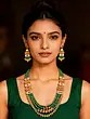 Adorn yourself with a cascade of exquisite artistry, where emerald hues meet the timeless allure of Kundan craftsmanship. This ensemble is designed to capture attention, offering a touch of regal elegance for your most cherished moments and special occasions.