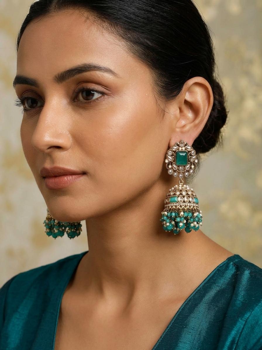These earrings are more than just an accessory; they are a statement piece designed to elevate any ensemble. Whether you're attending a grand wedding, a festive celebration, or a sophisticated evening soiree, these jhumkas will undoubtedly be the focal point of your attire. Their vibrant green color makes them a perfect complement to traditional Indian wear like sarees and lehengas, adding a touch of regal charm. However, their intricate design and rich detailing also make them a stunning choice to dress up contemporary outfits, offering a unique fusion of modern style and classic elegance. Imagine them paired with a simple silk top and trousers for a chic daytime look, or with an elegant cocktail dress for a touch of unexpected glamour. They are designed to transition seamlessly from day to night, offering enduring style and remarkable versatility.