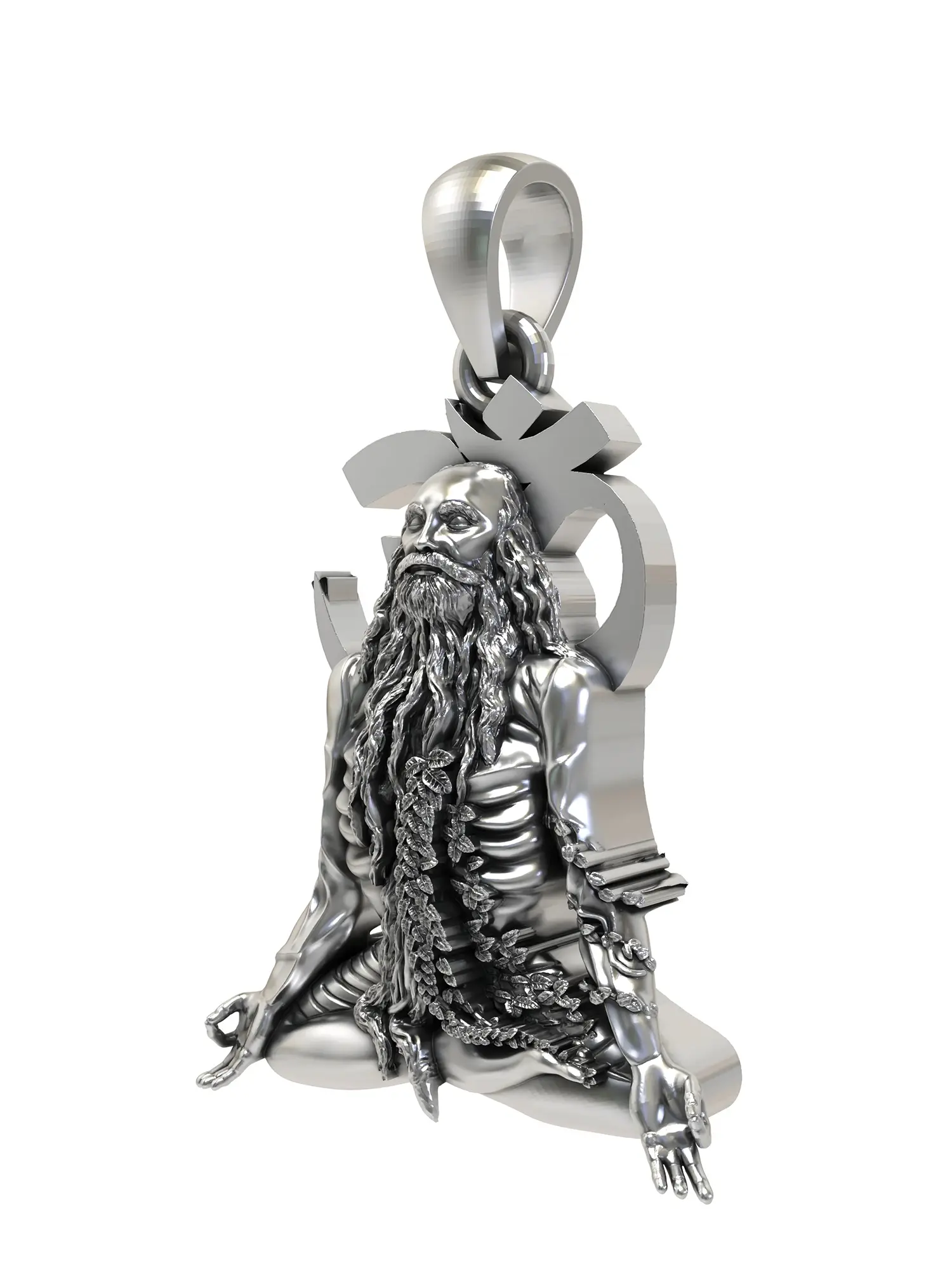 This captivating adornment stands one inch tall, making it a perfect focal point without being ostentatious. The radiant gleam of the sterling silver enhances the serene posture, while the intricate vine-like embellishments adorning the figure add a touch of natural grace. The iconic Om symbol elegantly frames the figure, completing this harmonious design.