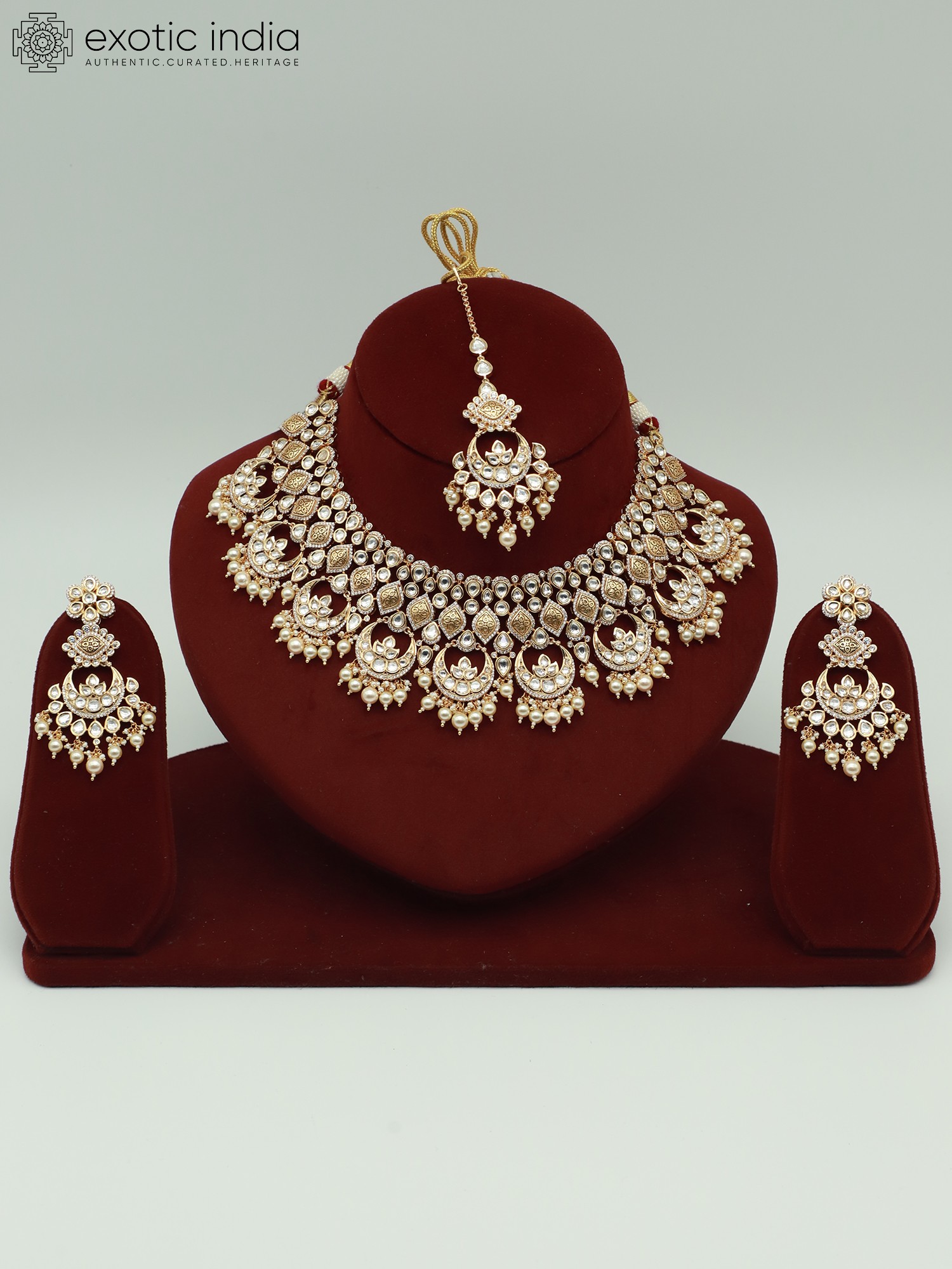 Indulge in the opulence of this stunning jewelry set. Designed for those who appreciate classic elegance and intricate craftsmanship, this set is a celebration of traditional Indian design, reimagined for the modern woman. It features a necklace, a pair of matching earrings, and a mangtika, each piece meticulously crafted to create a harmonious and breathtaking ensemble. Adorn yourself with this set and instantly elevate your presence at any special occasion.