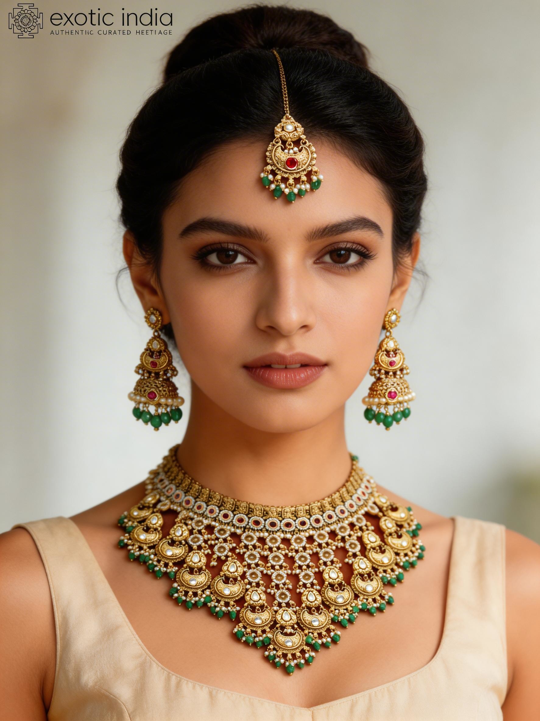Immerse yourself in the captivating allure of this exquisite jewelry set, a symphony of tradition and artistry. Crafted from high-quality brass, this ensemble showcases the impeccable skill and attention to detail that defines fine Indian jewelry. This set is more than just an accessory; it's a statement piece that speaks volumes about your refined taste. Each element, from the intricate necklace to the graceful earrings and the delicate mangtika, is designed to enhance your natural beauty and add a touch of regal charm to your ensemble.