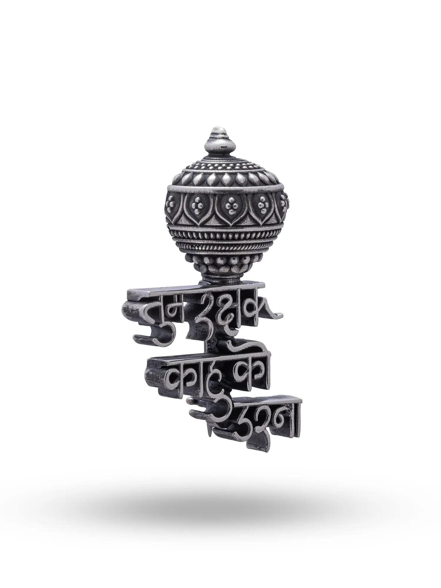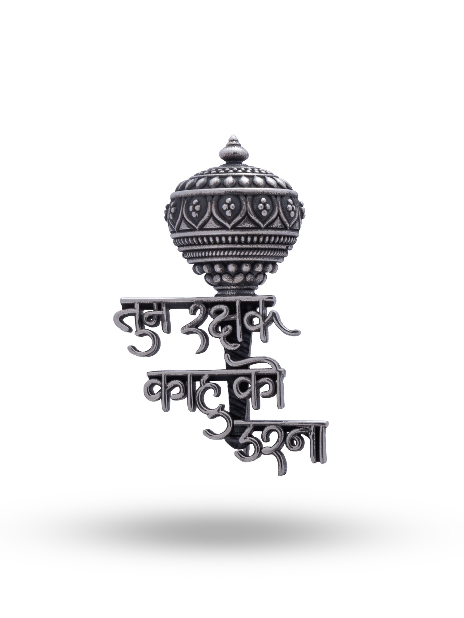 The intricate detailing captures the essence of the divine weapon, from the ornate orb at the top to the carefully rendered inscription. The flowing script adds a cultural and spiritual dimension, making it a unique and meaningful adornment. Made from high-quality sterling silver, this piece exhibits durability and a timeless appeal. Its understated elegance allows it to be worn with a variety of styles, adding a touch of spiritual significance to your everyday ensemble.
