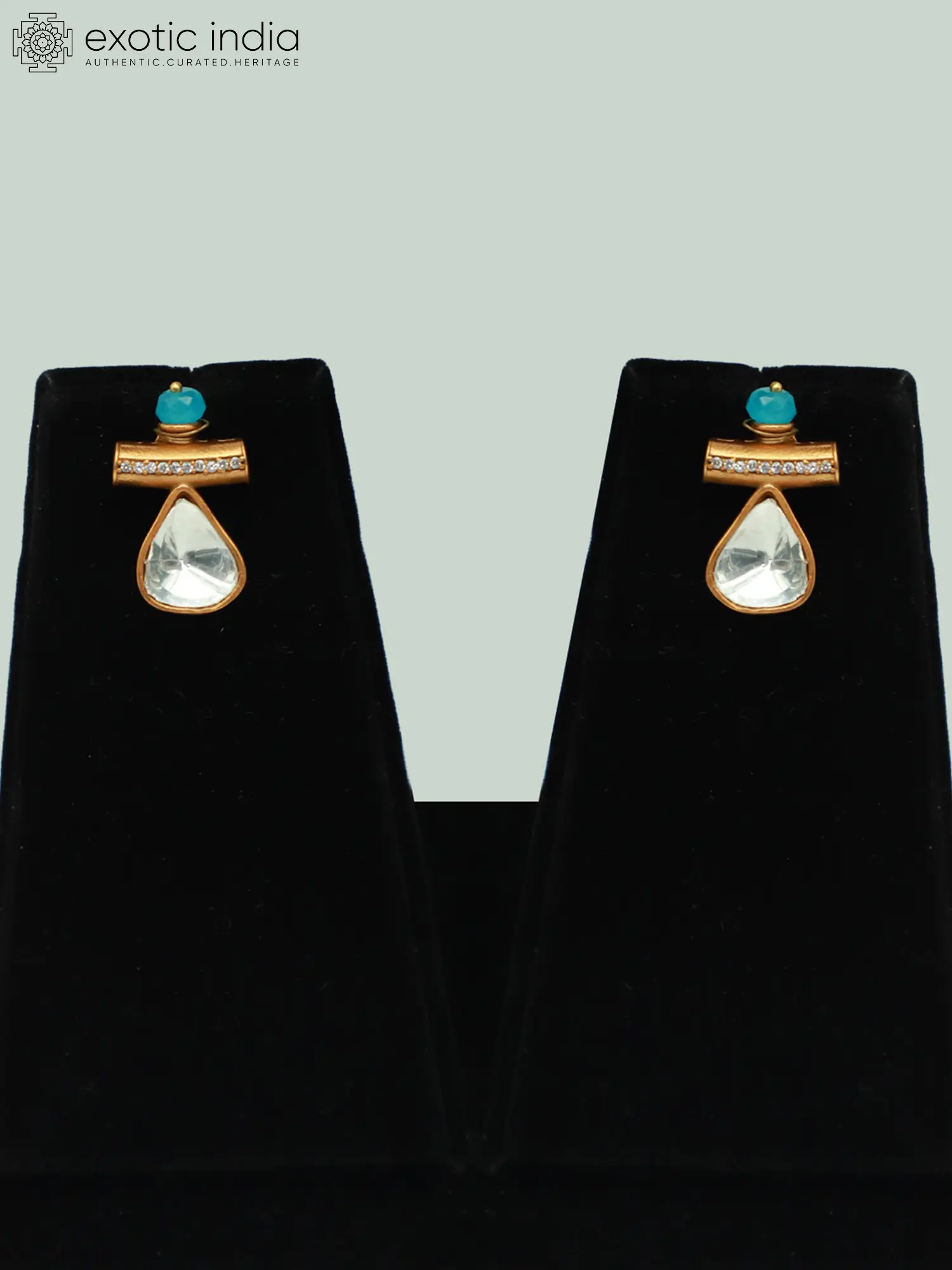 The necklace features a gracefully curved silhouette, reminiscent of the classic Hasli design, which sits comfortably around the neck. Pear-shaped Moissanite Kundan stones are carefully arranged along the curve, each one catching the light beautifully. These stones, known for their brilliance and durability, are set in a brass base that provides a strong and lasting foundation. Interspersed between the Moissanite stones are small, round accents, adding depth and dimension to the overall design. The matt polish finish of the brass provides a subtle, understated sheen that complements the brilliance of the stones without overpowering them. The matching earrings echo the design of the necklace, featuring a single pear-shaped Moissanite Kundan stone suspended from a delicate brass fixture. The earrings are lightweight and comfortable to wear, making them ideal for both everyday wear and special occasions.