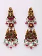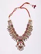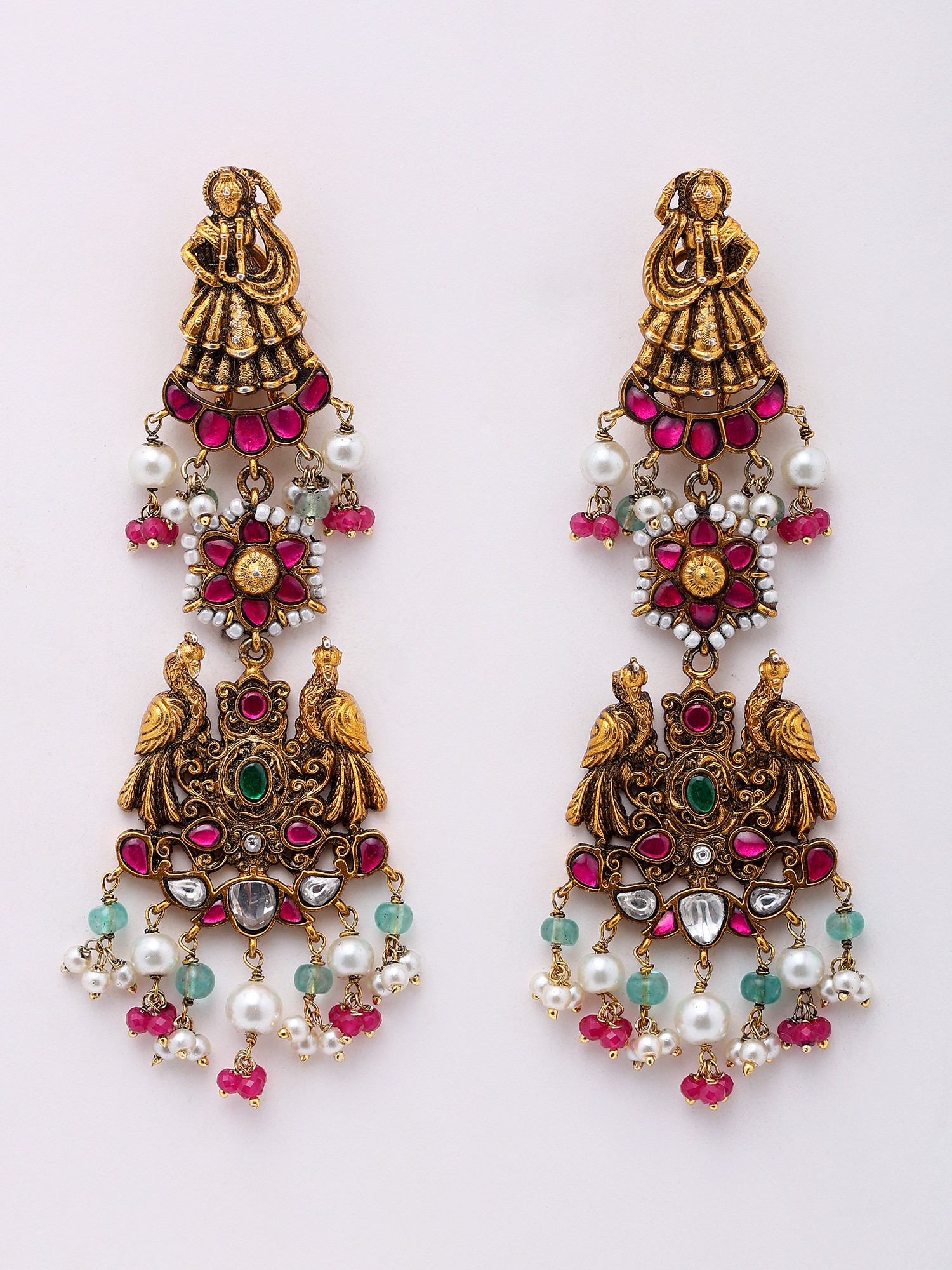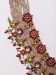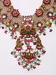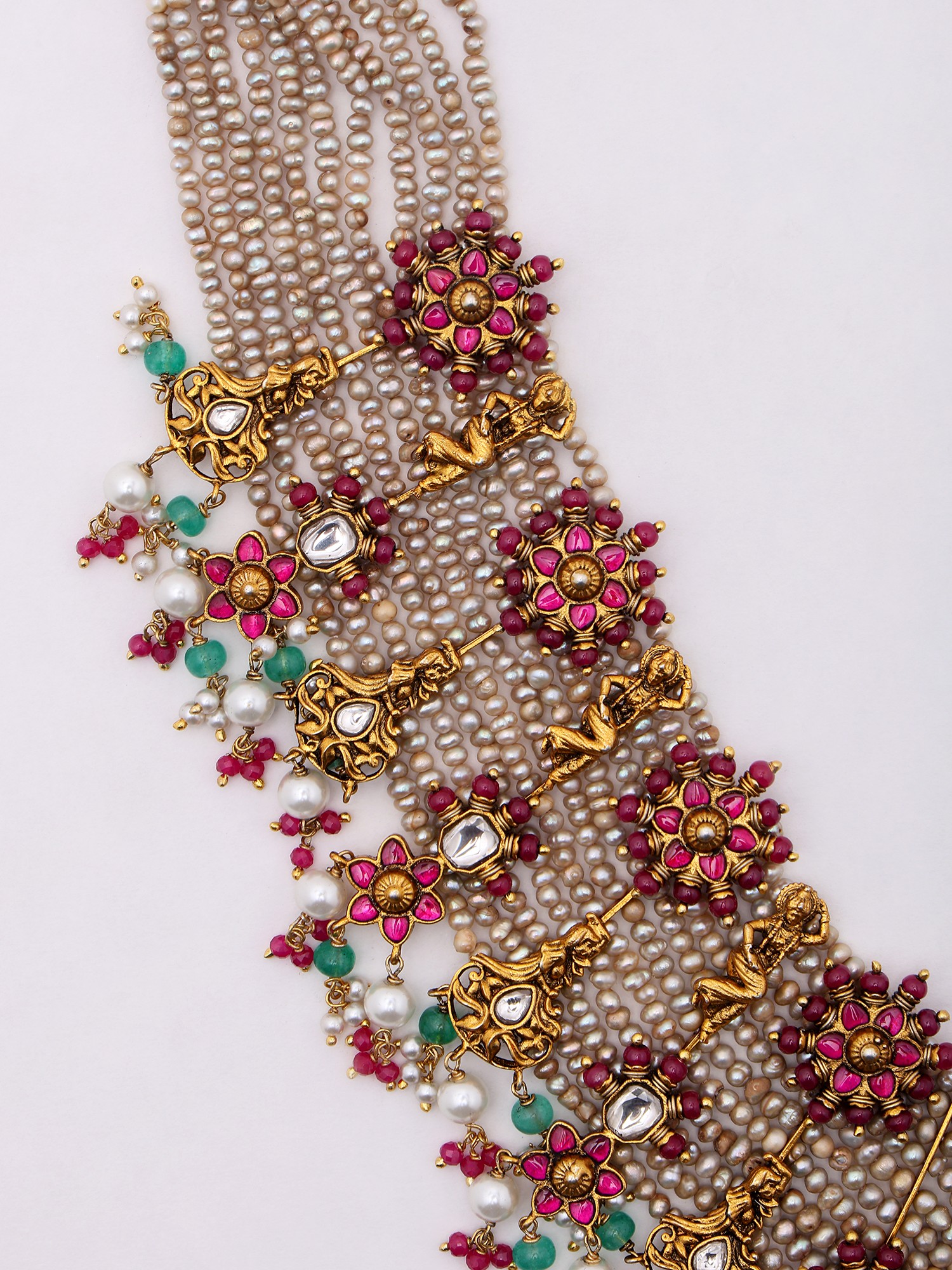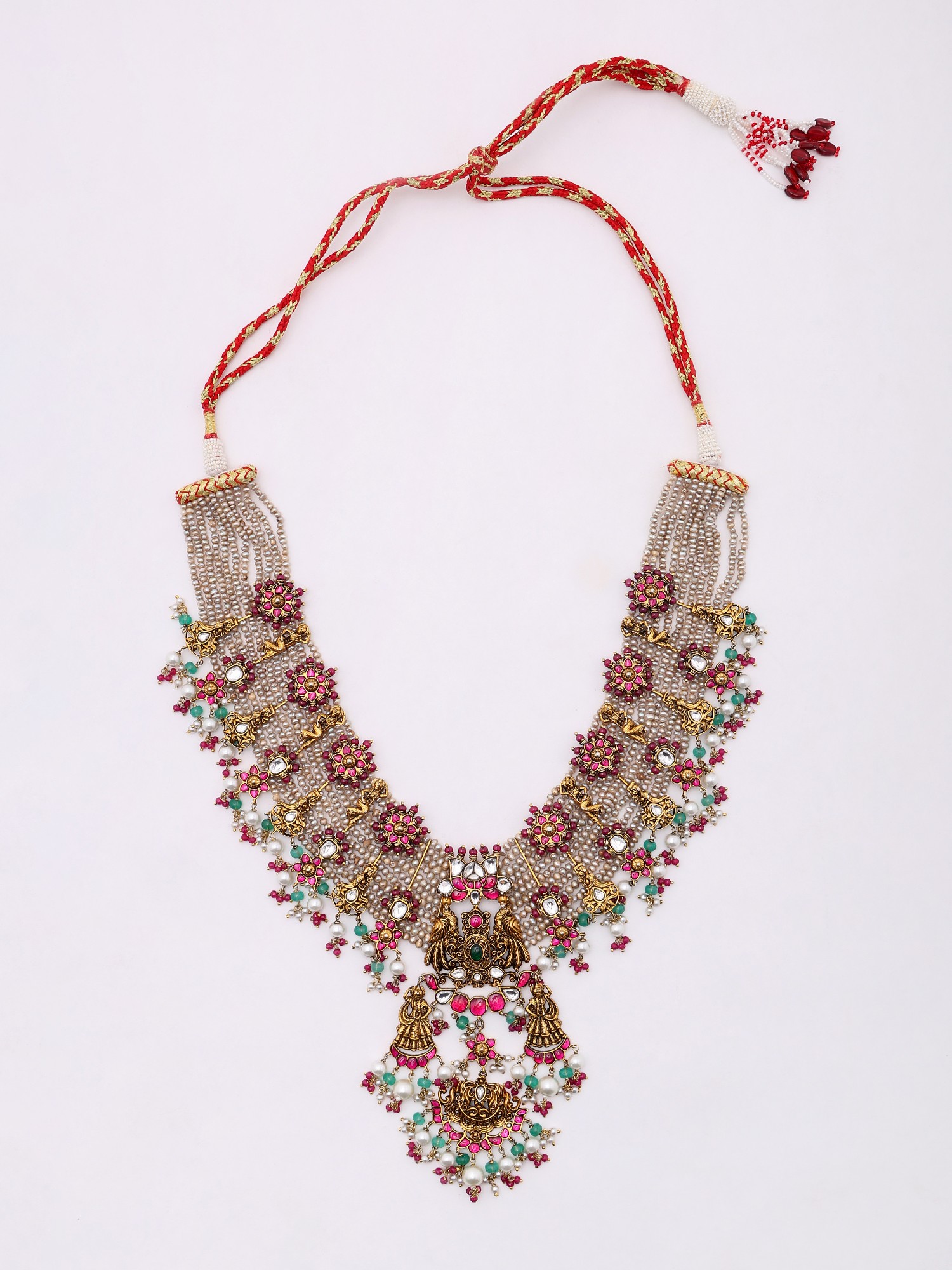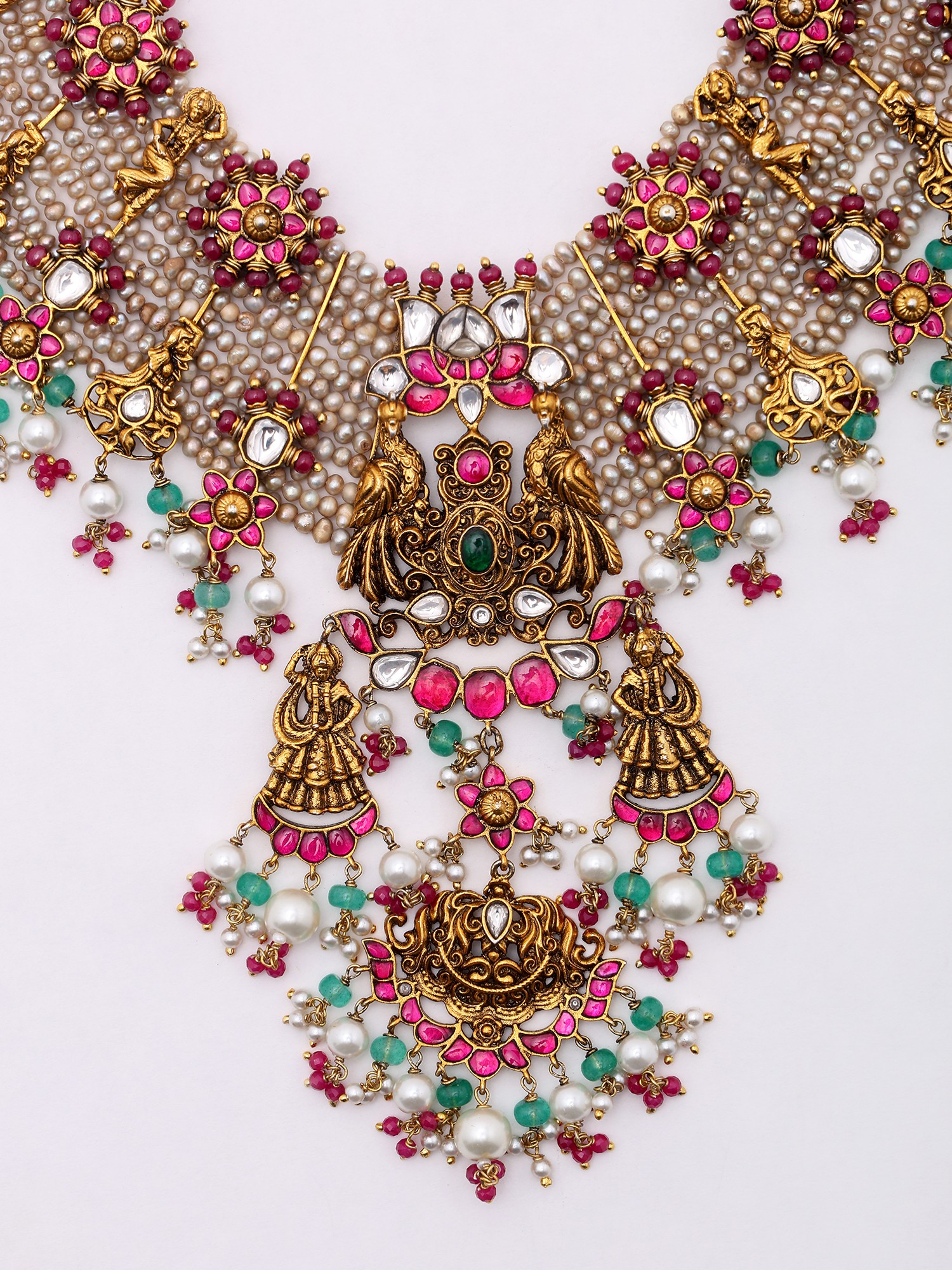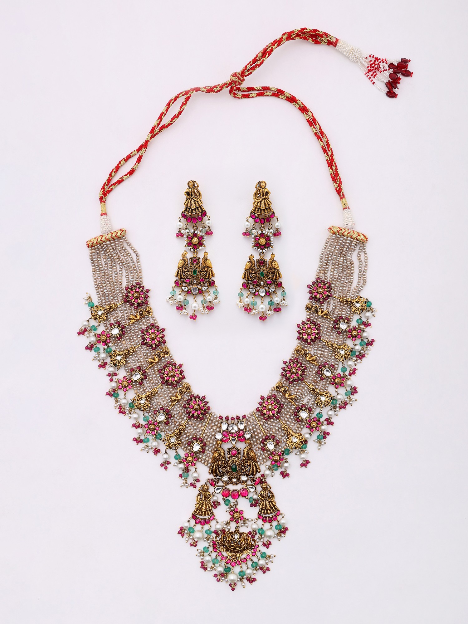 Immerse yourself in the captivating allure of this meticulously crafted necklace and earring set, a true testament to artistry and timeless elegance. This ensemble is designed to be a showstopper, exuding an air of sophistication and grace that will turn heads at any occasion. Each piece is a miniature masterpiece, adorned with a profusion of intricately detailed floral motifs that bloom with vibrant semi-precious stones. The interplay of colors, from the deep, rich hues of the pink stones to the fresh, lively greens and the creamy luminescence of pearls, creates a visual feast that is both striking and harmonious. The necklace, a true statement piece, is a cascade of delicate silver chains that form a luxurious base. These are interspersed with the signature floral embellishments, each one carefully set with glistening stones. The design graduates beautifully, drawing the eye towards the central pendant, which is an intricate work of art in itself. This pendant, along with the accompanying earrings, features charming figures, adding a touch of narrative and cultural depth to the overall aesthetic. The earrings mirror the necklace's exquisite detail, designed to dangle elegantly and catch the light with every movement.