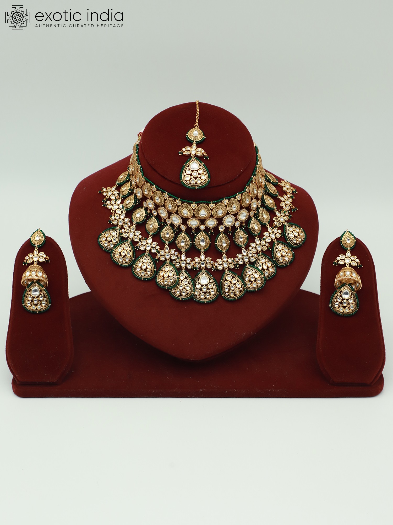 Brass Heavy Necklace Set With Kundan Mangtika And Beads Earrings