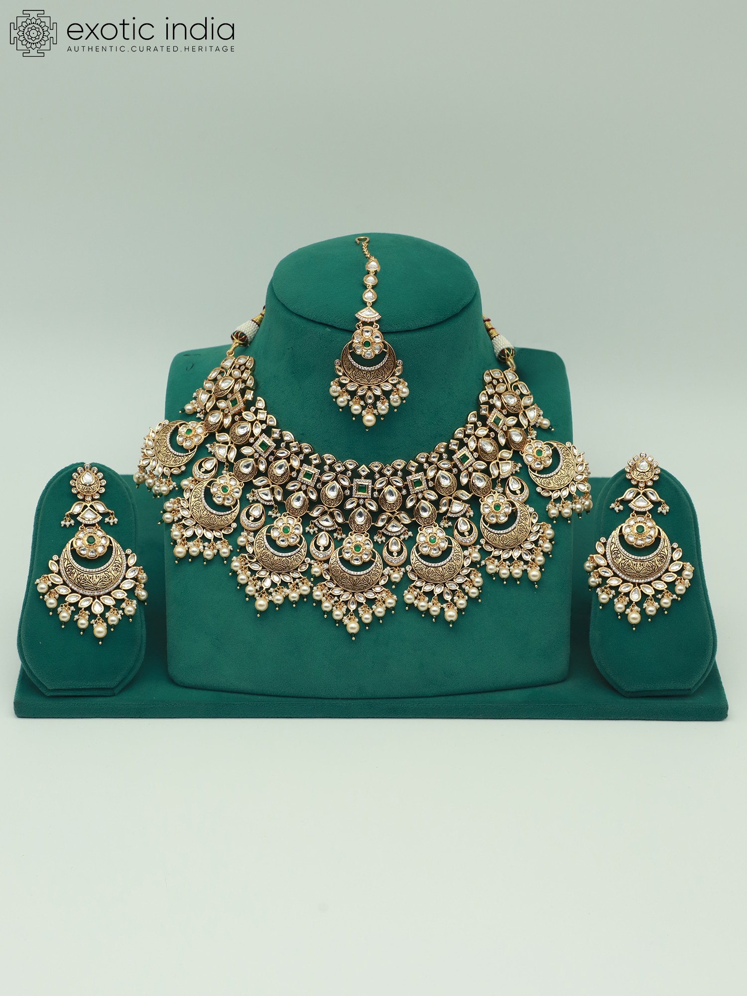 The mangtika, or forehead ornament, completes this traditional set, drawing attention to the wearer's face with its delicate and intricate design. Echoing the motifs and embellishments of the necklace and earrings, the mangtika features Kundan stones and pearl accents, harmoniously tying the entire look together. Its refined design adds a touch of ethereal beauty, making it the perfect finishing touch for a bride or anyone looking to exude timeless elegance.