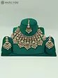 The necklace is the centerpiece of this set, showcasing an elaborate arrangement of meticulously placed Kundan stones. These gleaming stones, known for their rich heritage and intricate setting style, are interwoven with carefully positioned green accents, adding a subtle yet captivating burst of color. The overall design evokes a sense of grandeur and sophistication, making it the perfect statement piece for weddings, festivals, or any special occasion. Complementing the necklace are the intricately designed earrings. These statement earrings mirror the necklace's aesthetic, featuring dangling pearls that sway gently with every movement, adding an alluring touch of grace and femininity. The delicate pearl drops enhance the overall elegance of the set.