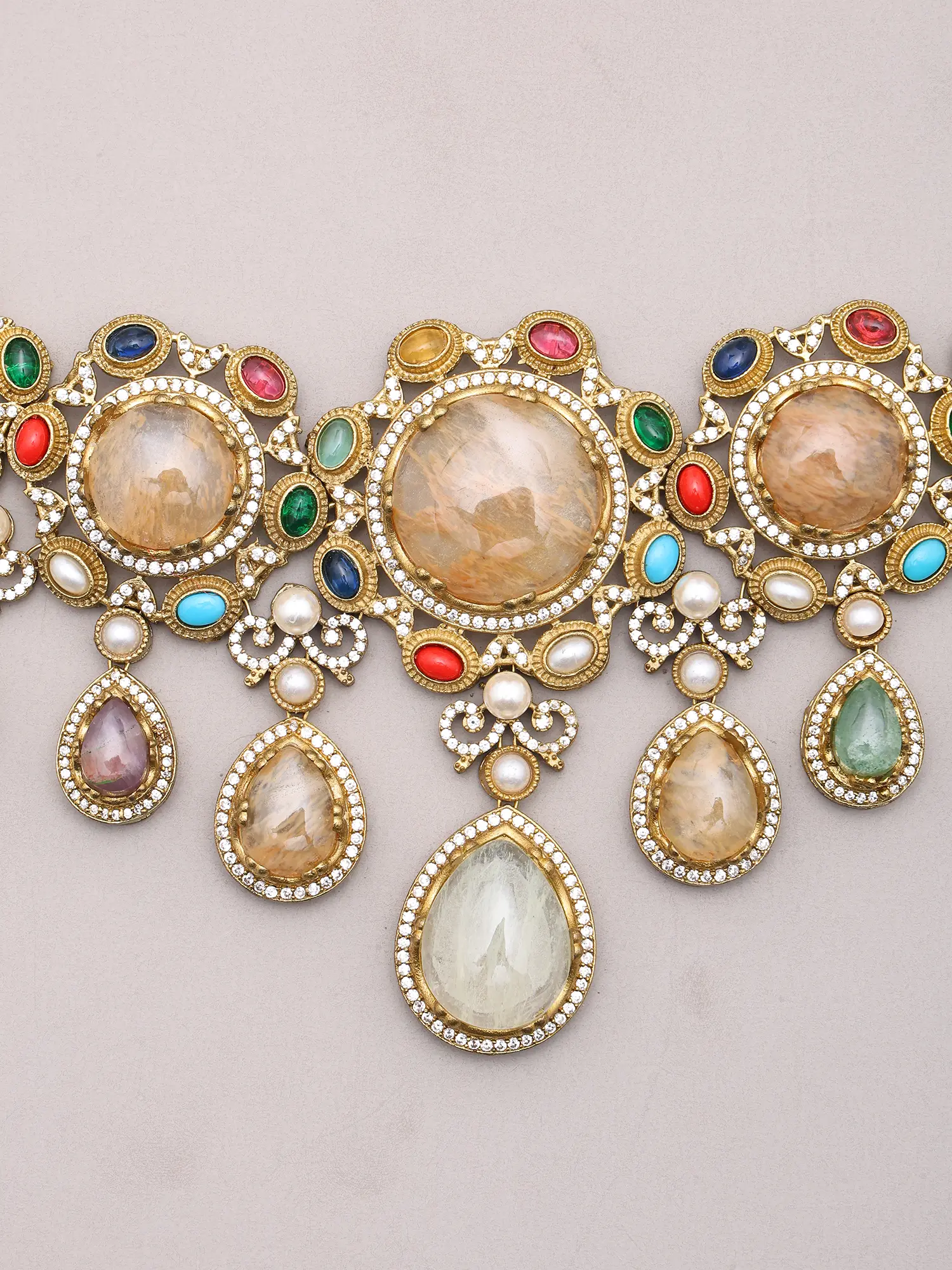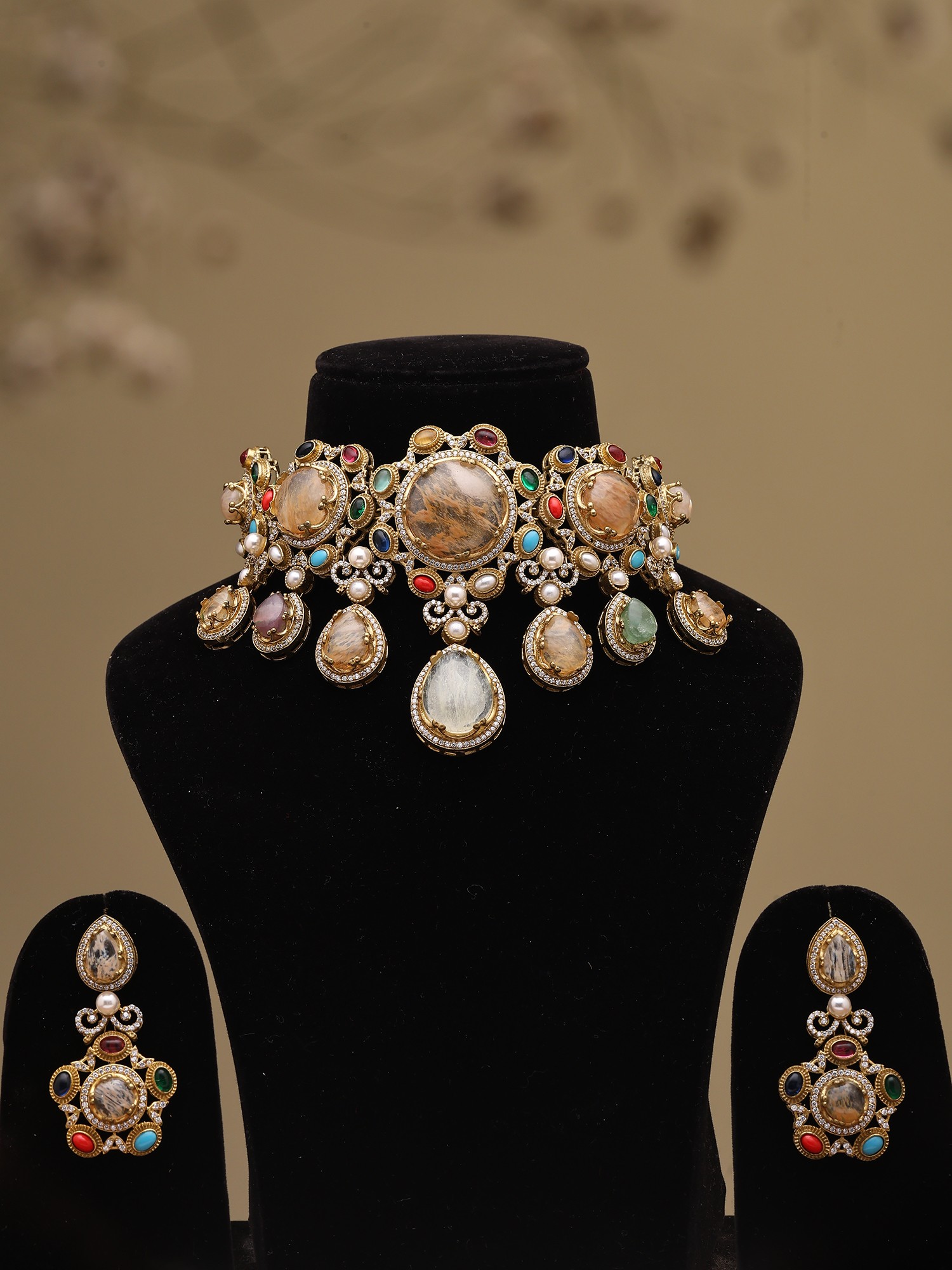 The centerpiece of this set is the richly adorned choker. Its broad band gracefully encircles the neck, providing a canvas for a breathtaking display of semi-precious stones. Large, captivating stones with organic patterns are set amidst smaller, vibrant cabochons in a spectrum of colors – deep reds, tranquil blues, emerald greens, and earthy ochres. These are further enhanced by the soft shimmer of pearls, strategically placed to add a touch of delicate luminescence. The entire composition is intricately framed with delicate filigree work and a halo of small, sparkling stones, drawing the eye to the central, striking elements. The varied textures and hues of the stones create a dynamic visual appeal, making each angle of the choker a new discovery.