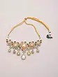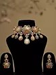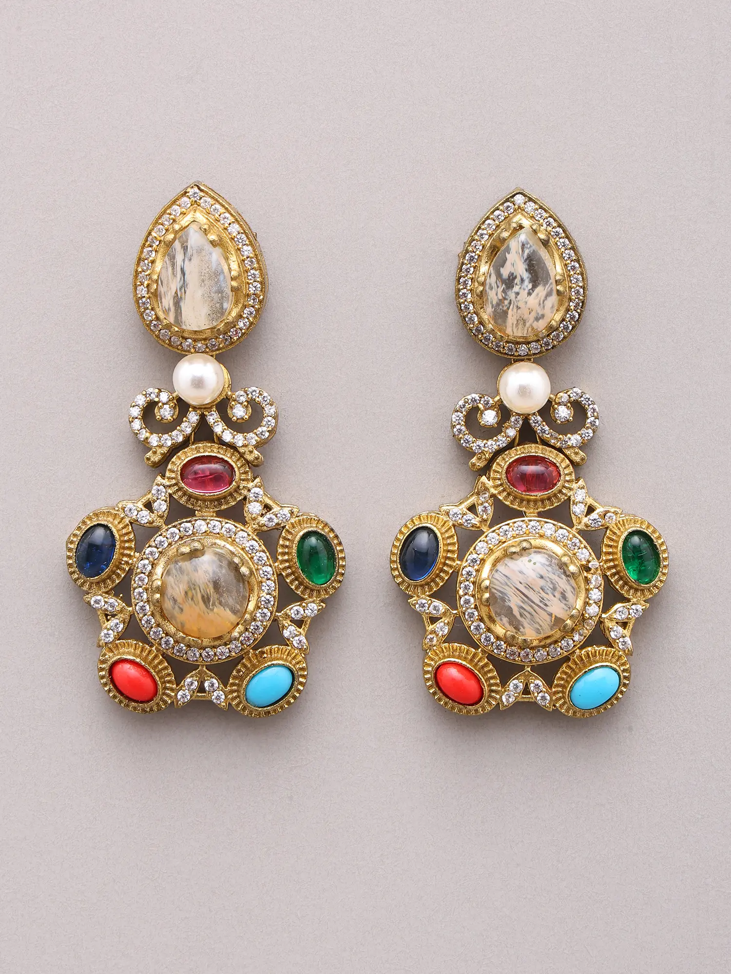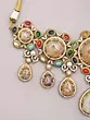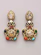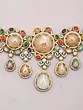 Complementing the choker, the drop earrings echo its design motifs with remarkable precision. Each earring begins with a pear-shaped stone, mirroring the central stones of the choker, followed by a cascade of smaller, colorful gems and delicate pearls. The intricate arrangement mirrors the choker's intricate detailing, ensuring a harmonious and cohesive look. These earrings are designed to sway gently with movement, catching the light and adding a touch of captivating sparkle to your profile. Their design ensures they are substantial enough to be noticed but delicate enough to maintain an air of refined elegance.