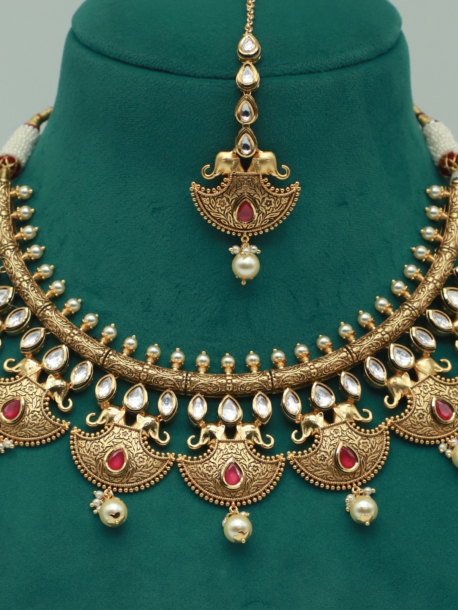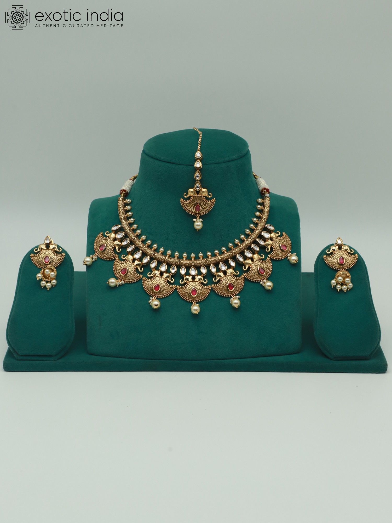 Heavy Kundan Necklace Set With Mangtika And Dangling Pearl Earring
