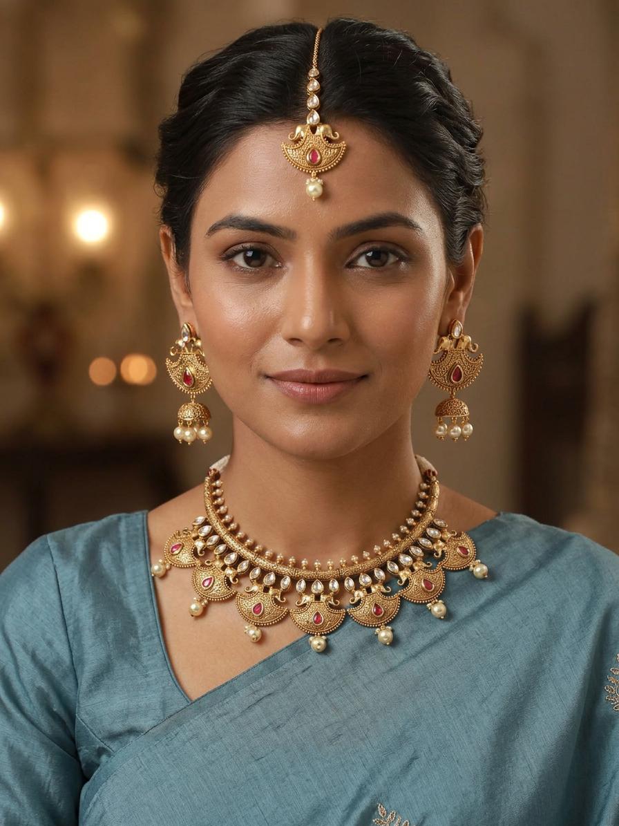 Experience the allure of traditional Indian craftsmanship with this exquisite jewelry set. This set is a stunning embodiment of heritage design, meticulously crafted to capture the essence of classic beauty and sophistication. Perfect for weddings, festive occasions, or any special event, this jewelry will elevate your ensemble and make you feel like royalty. The artistry displayed in each element of this set tells a story of skilled artisans dedicated to preserving ancient jewelry-making techniques.